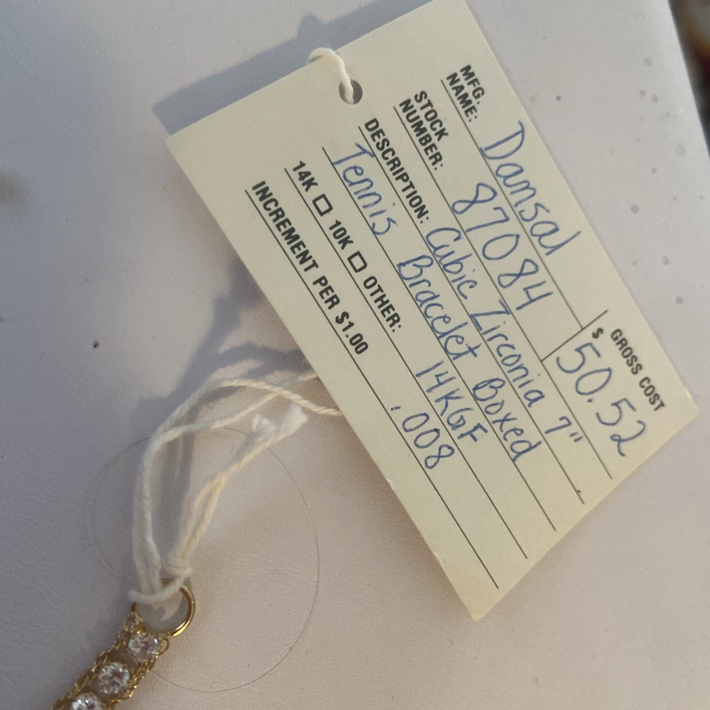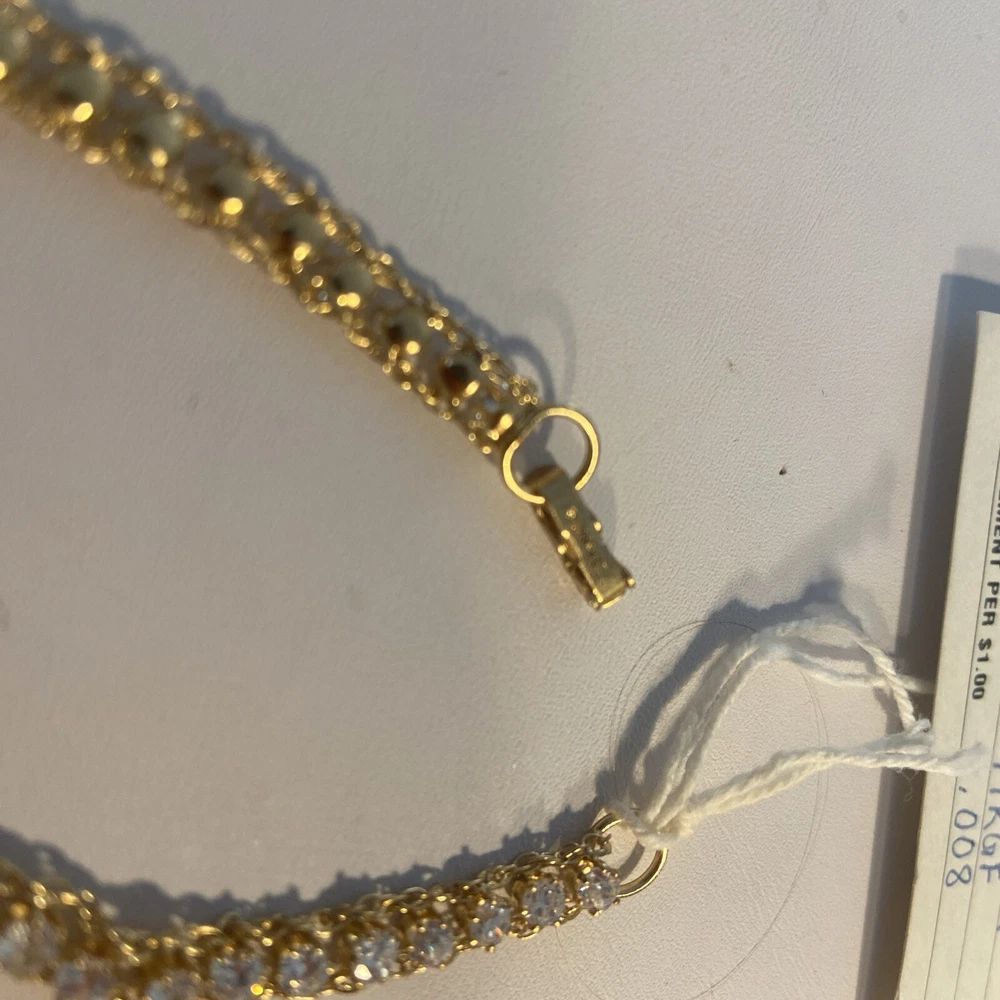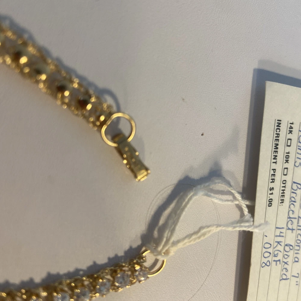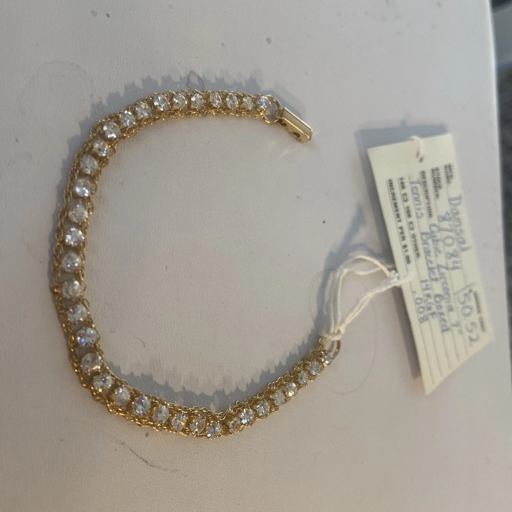 This vintage Dansal bracelet is a stunning piece of jewelry that will surely catch anyone's eye. With beautiful white/colorless Cz main stones and a yellow gold filled metal, this bracelet exudes a retro era beauty. Measuring at 7 inches in length, it is perfect piece for many occasions. The bracelet is a great addition to any collection. Its tennis style and 14k gf metal purity add to its elegance. This piece is perfect for anyone who loves vintage and antique jewelry, and it's sure to make a statement wherever it's worn.Made in providence Rhode Island USA new old stock I bought the remains of this old company.