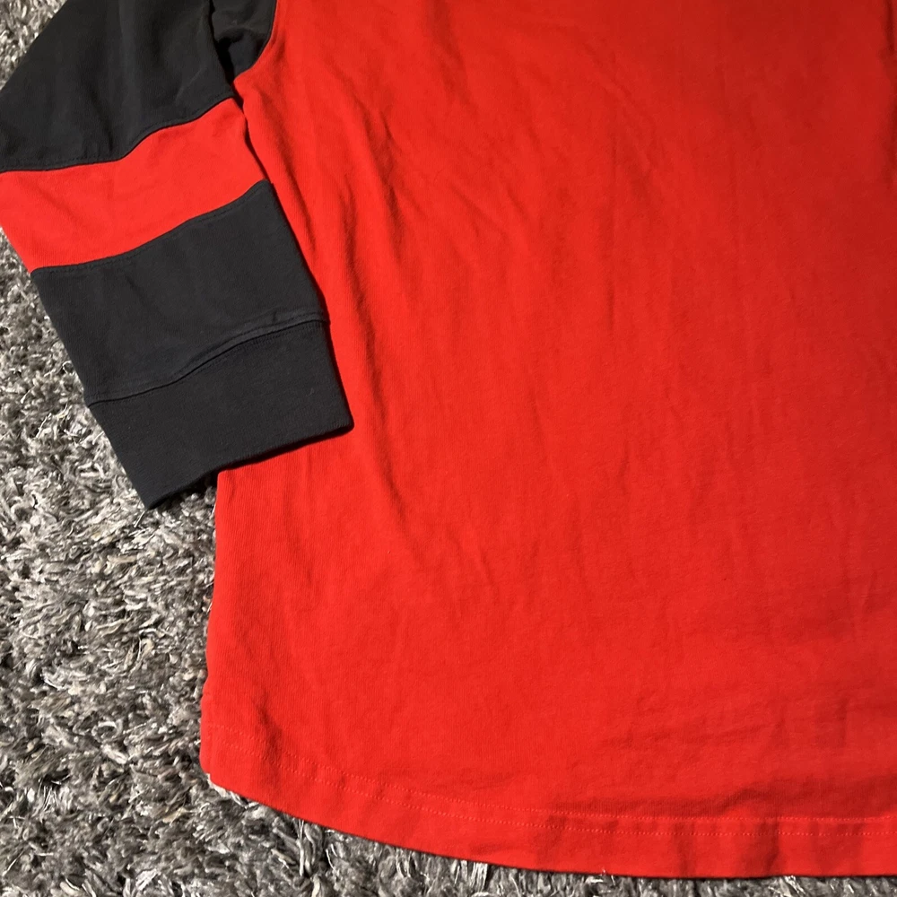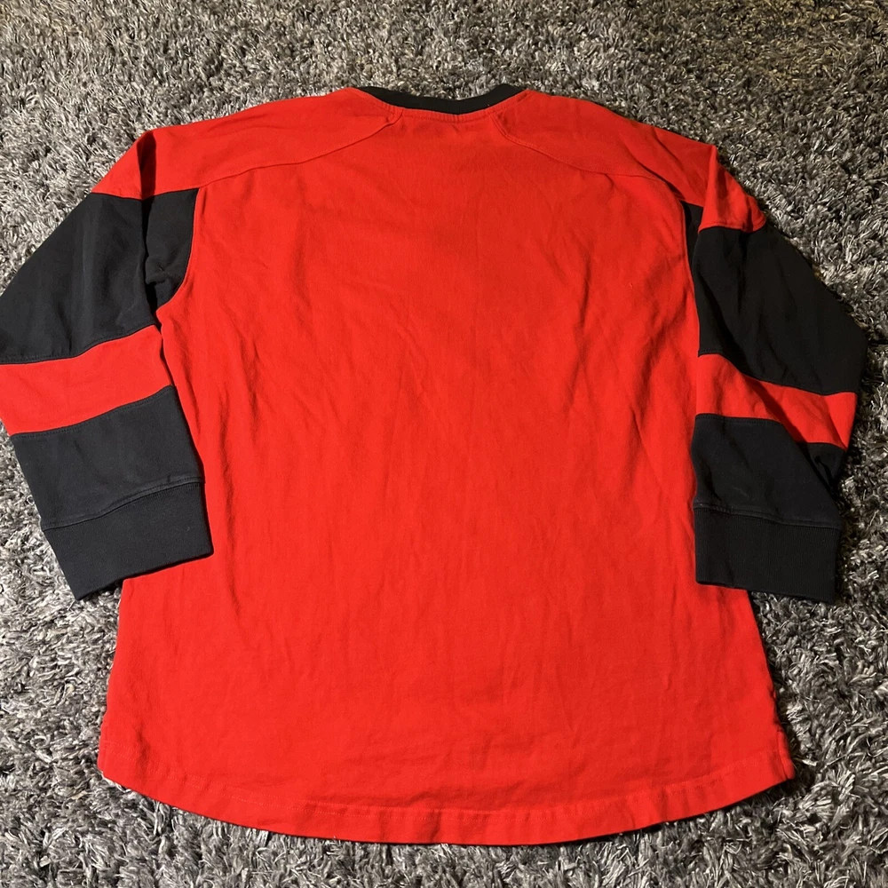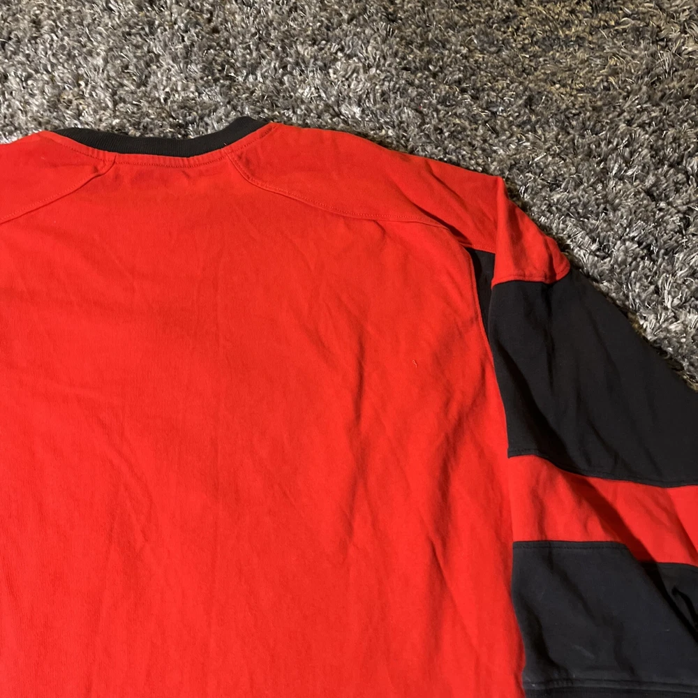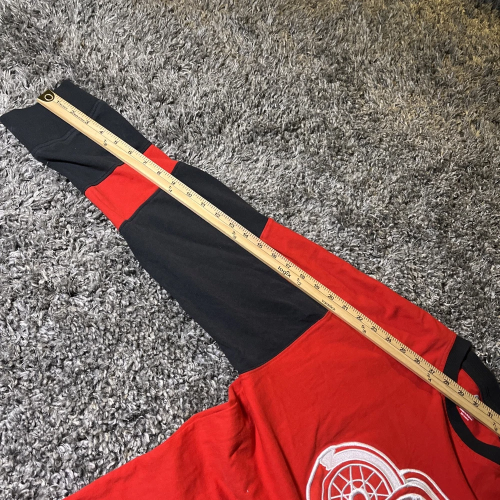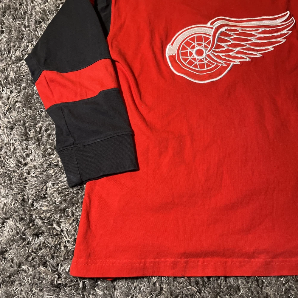 The product is a vintage Detroit Red Wings long sleeve shirt in size large, featuring an embroidered team logo. It is officially licensed by the National Hockey League (NHL) and designed for unisex adults. The shirt is in excellent used condition and is colored red, representing the team's colors. This fan apparel item is a great addition to any Detroit Red Wings supporter's collection, perfect for showing team pride during the regular NHL season.