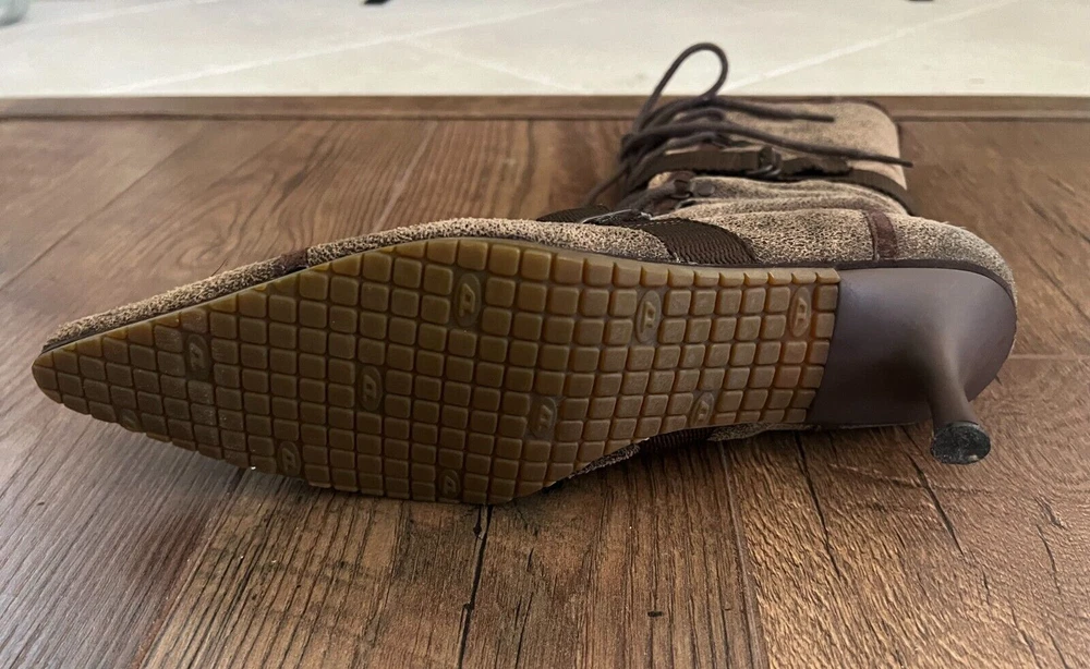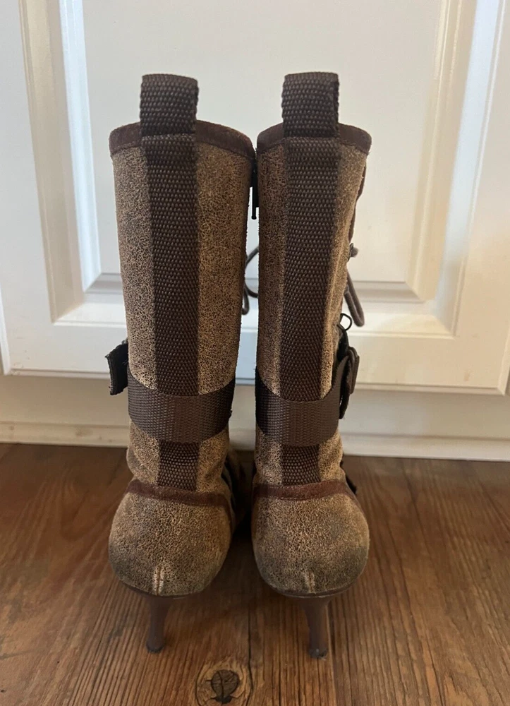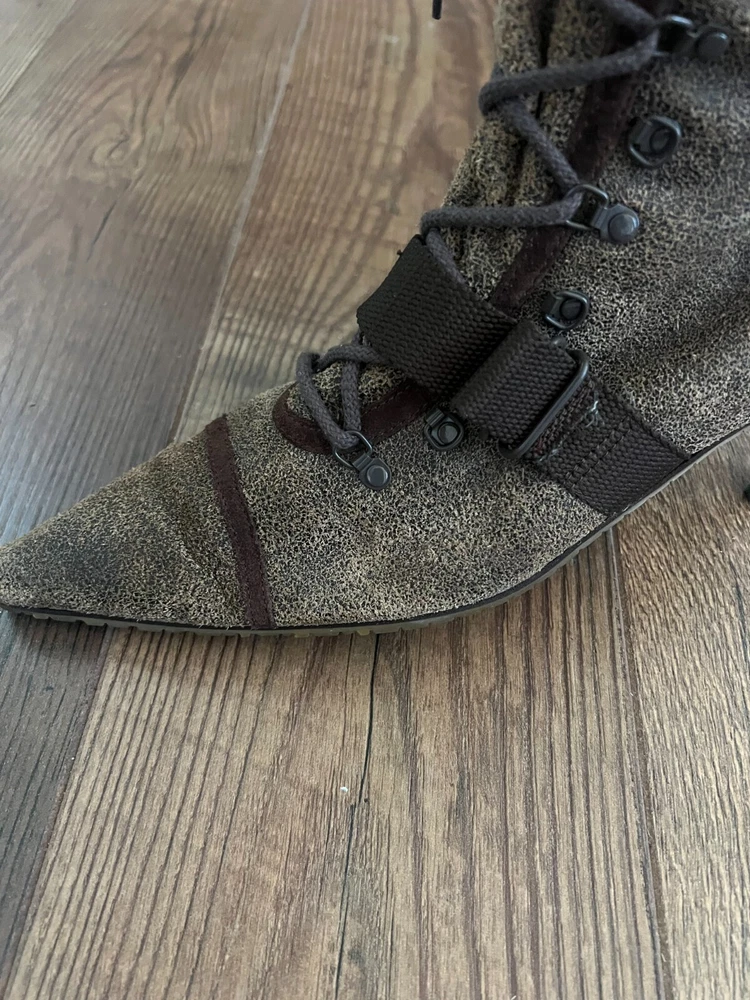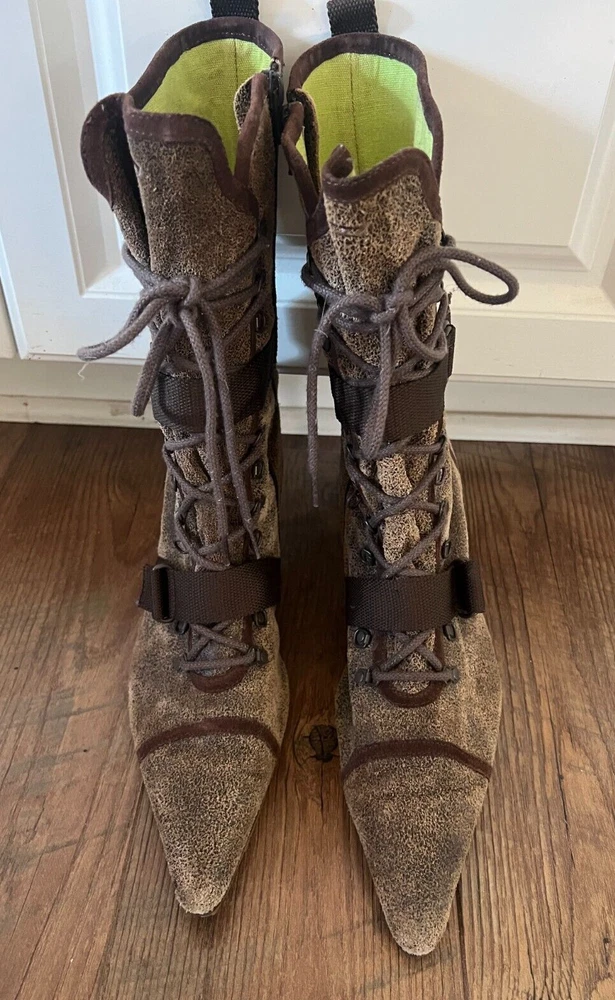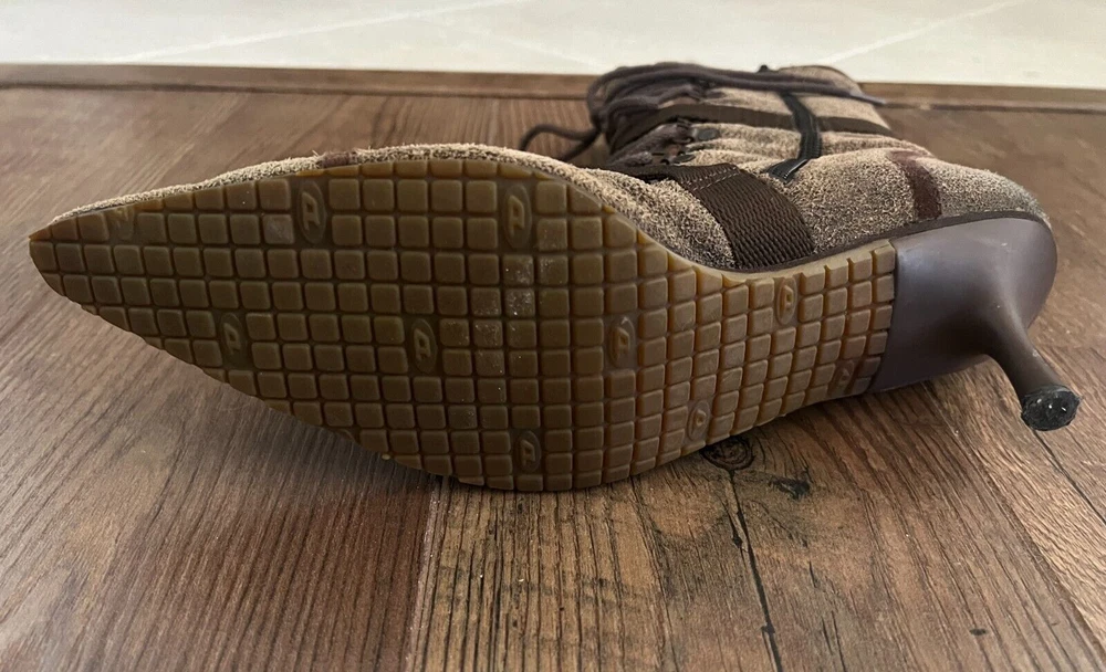 Step out in style with these Diesel Vintage Everest Pointed Toe Lace Up Grunge Heeled Boots. These boots are sure to make a statement! The boots feature a mid-calf shoe shaft style, pointed toe, and lace-up closure for a comfortable and secure fit. The suede upper material is accented with a strap, laces and zipper, giving the boots a unique look. The boots have a rubber outsole for durability and a fabric lining for added comfort. The kitten heel style adds a touch of sophistication to the overall grunge look. These boots are perfect for winter, fall, and spring seasons. Available in size 9.5 US and 40.5 EU. There is some discoloration on the inside of the boots, but they are in very nice condition from the outside. The sole and heel show little to no wear.