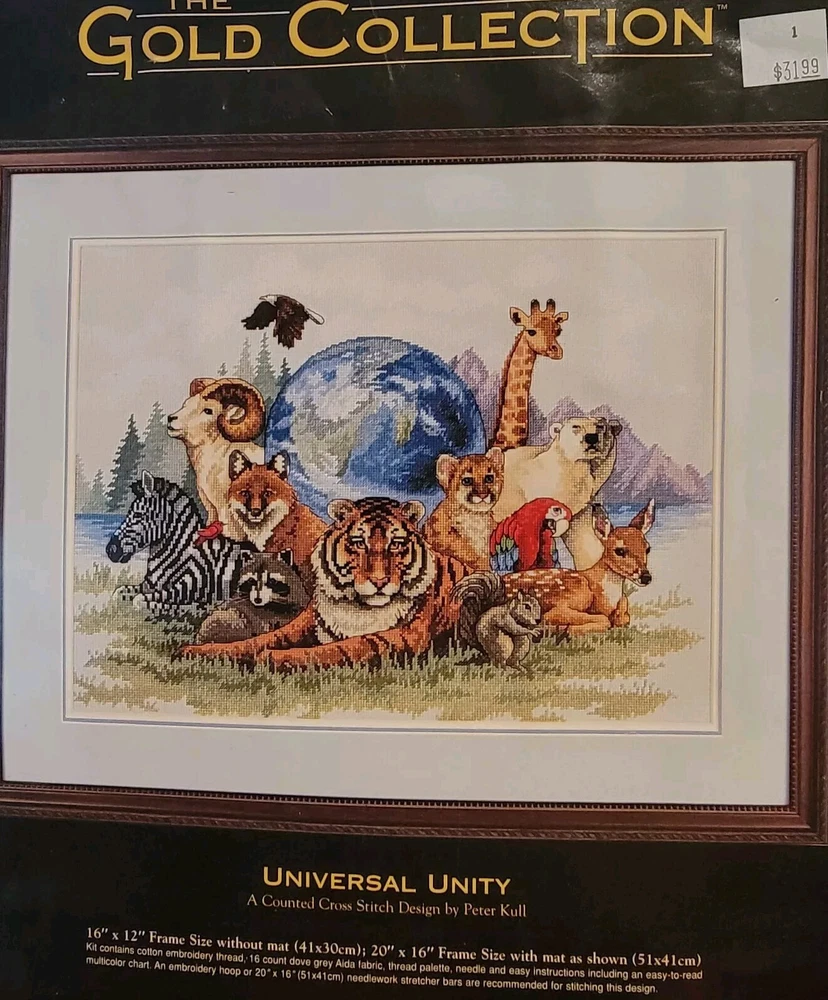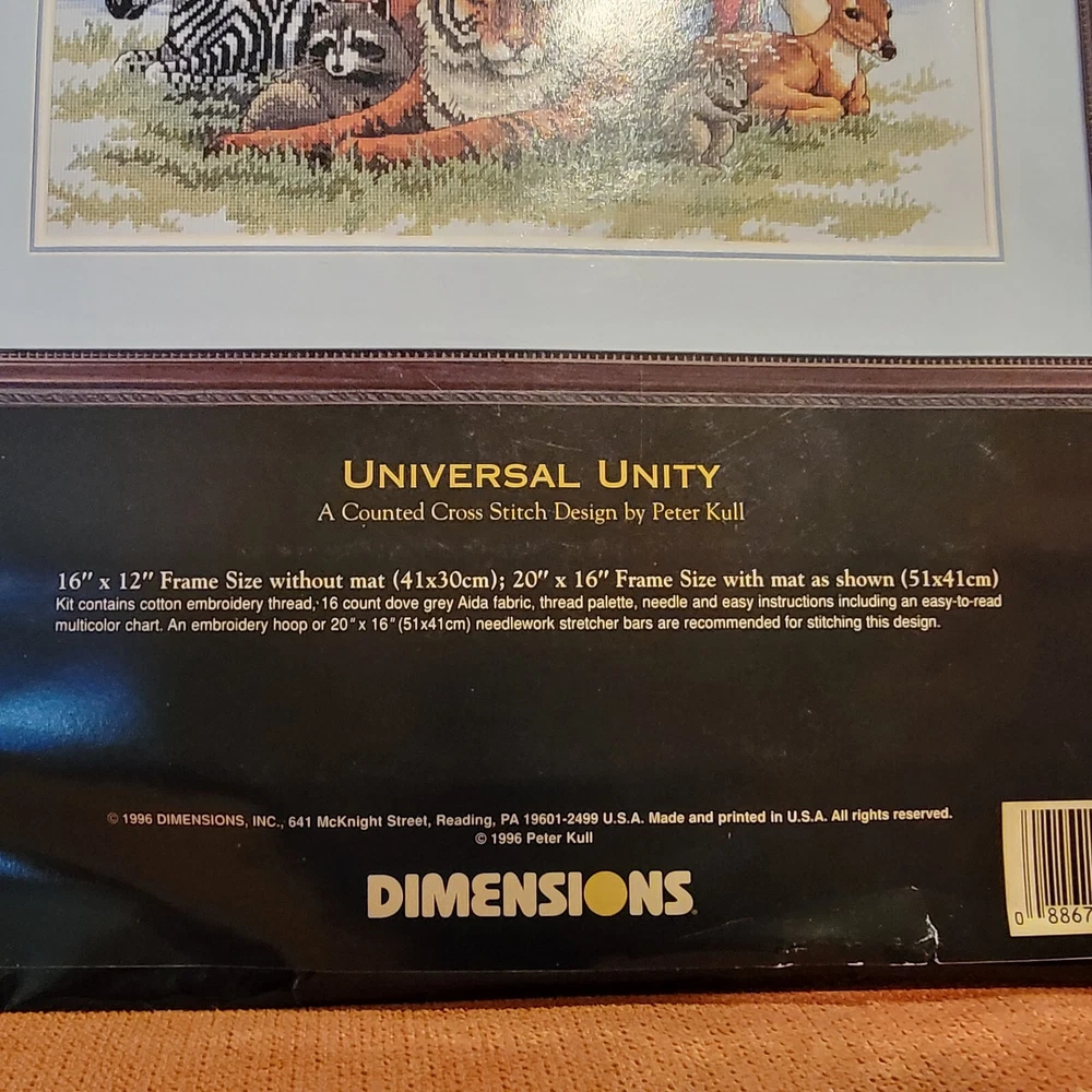 This vintage Dimensions cross stitch kit features a beautiful picture of a universal unity design, featuring animals and insects. The kit includes everything you need to create a stunning cross stitch masterpiece, including a pattern, needle, fabric/cloth, thread/floss, and more. This particular kit was manufactured in the United States and is still sealed, making it a rare find for collectors and cross stitch enthusiasts alike. The brand of this kit is Dimensions and the model number is 3822.