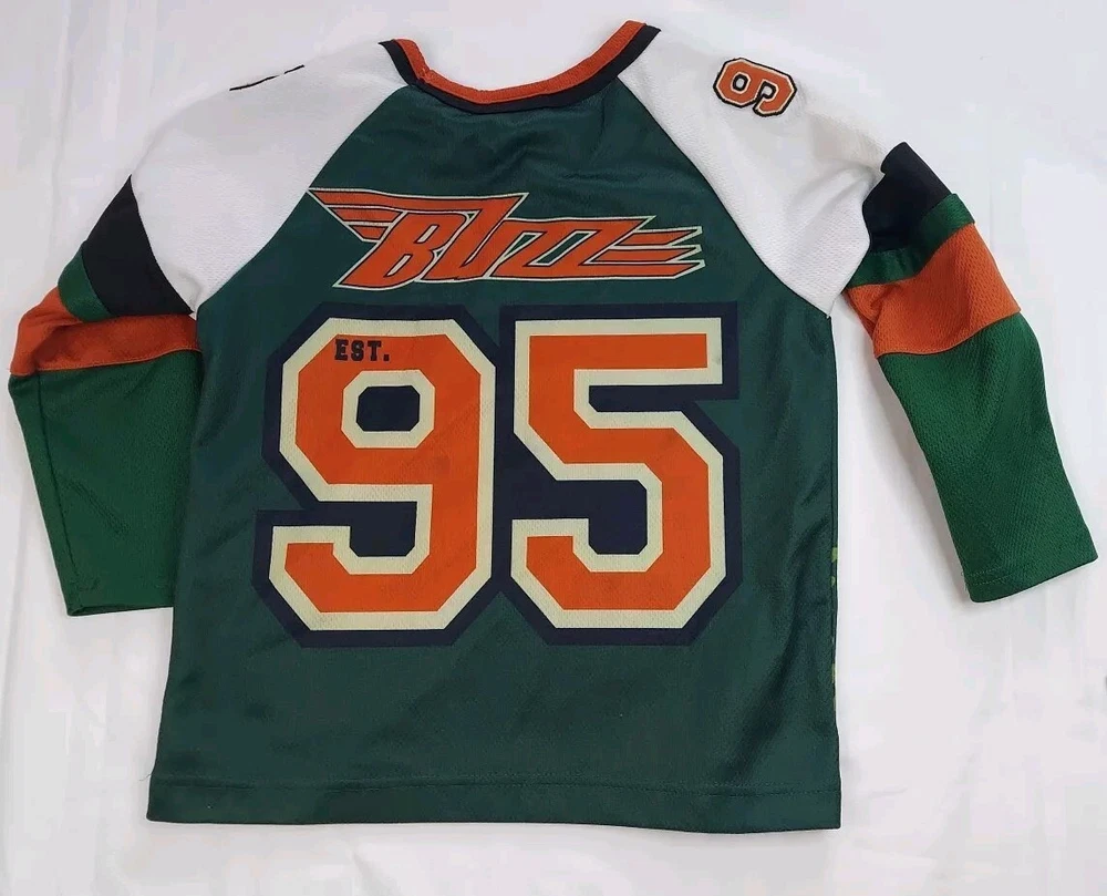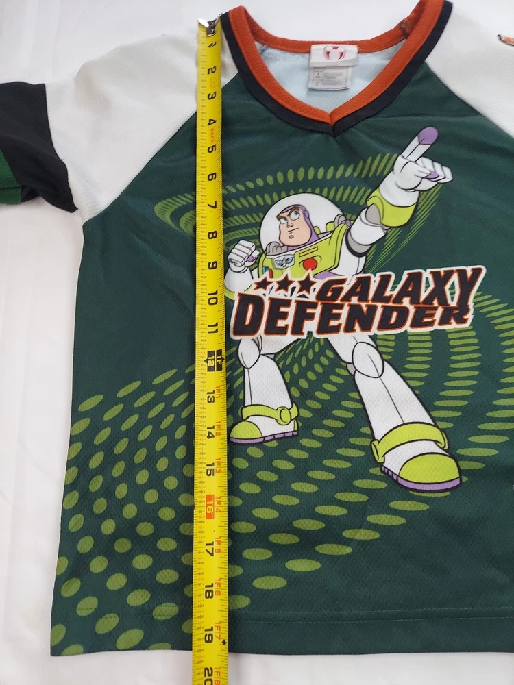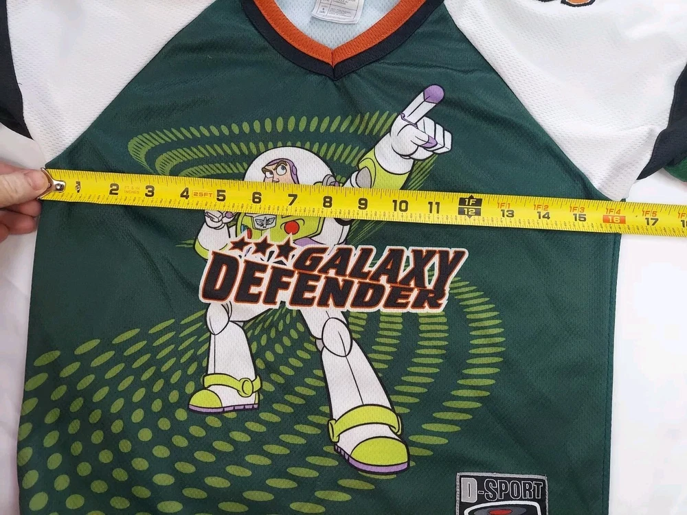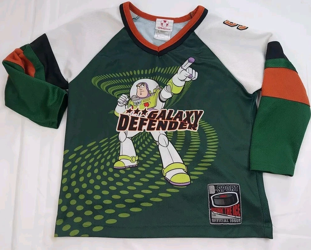 VTG Disney Store Hockey Jersey Buzz Lightyear 95 Kids S 5/6 Toy Story Galaxy Size S 5/6 Brand: Disney store. Long sleeve Hockey jersey reads 'Galaxy Defender' on front and 'Buzz 95' on back. Please see the pictures. The shirt has one small pull (It's not a hole) on front. Smoke-free pet friendly
