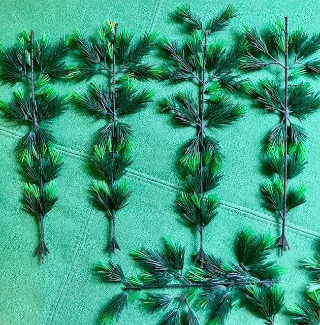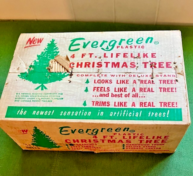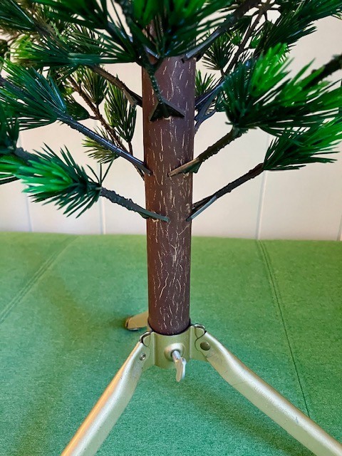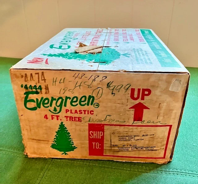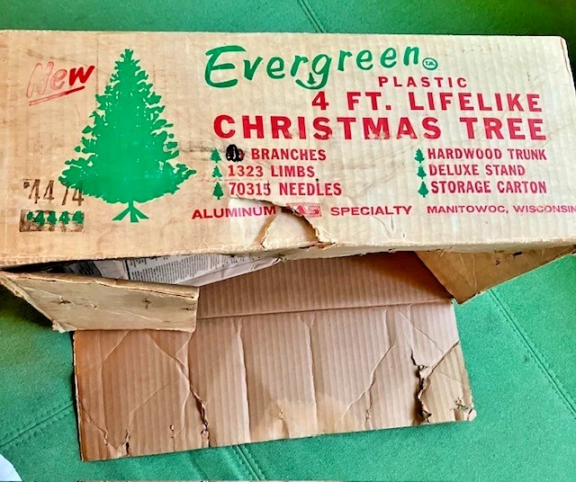 The VTG Evergreen Aluminum Specialty Manitowoc WI 48" Christmas Tree is a novelty artificial Christmas tree made of green plastic. It's not missing any branches, I put it together in under 30 minutes. The paper that wraps around the center wood has been taped in a few places...see photos The red tree skirt comes with it, I forgot to see how it wraps around the base. There is only one screw to tighten in the base, at first I thought it needed more, but once I tried it a different way, it worked with one. There are 8 long branches that have broken tips, some have previously tried to be repaired...see photos There are extra pieces are in the box. One of the small branches has a broken tip...see photo Original box has condition issues but is sturdy. The tree was always removed from the bottom of the box. Let me know if you need more info or photos. This is sold as is.