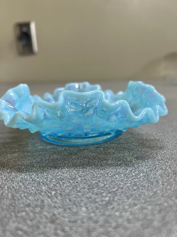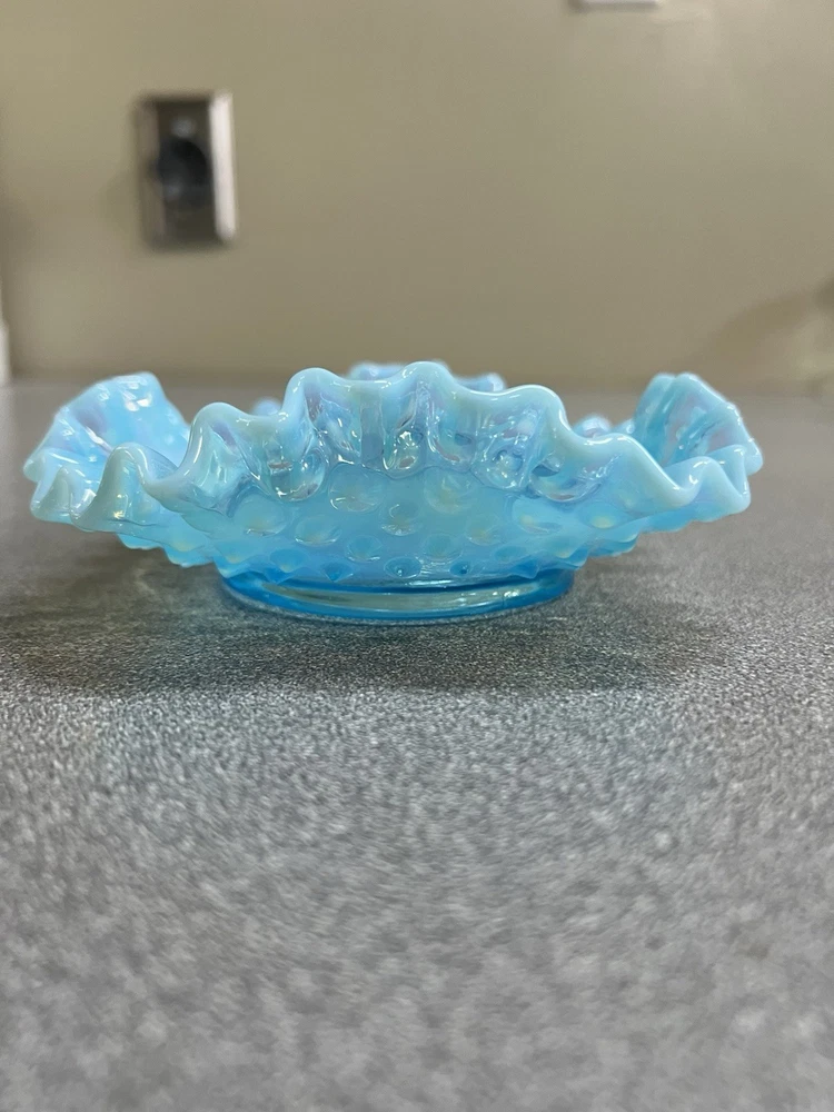 VTG Fenton Art Glass Bon Bon Dish Opalescent Blue Hobnail Double Crimp Ruffle. Condition is Used. Shipped with USPS Ground Advantage.