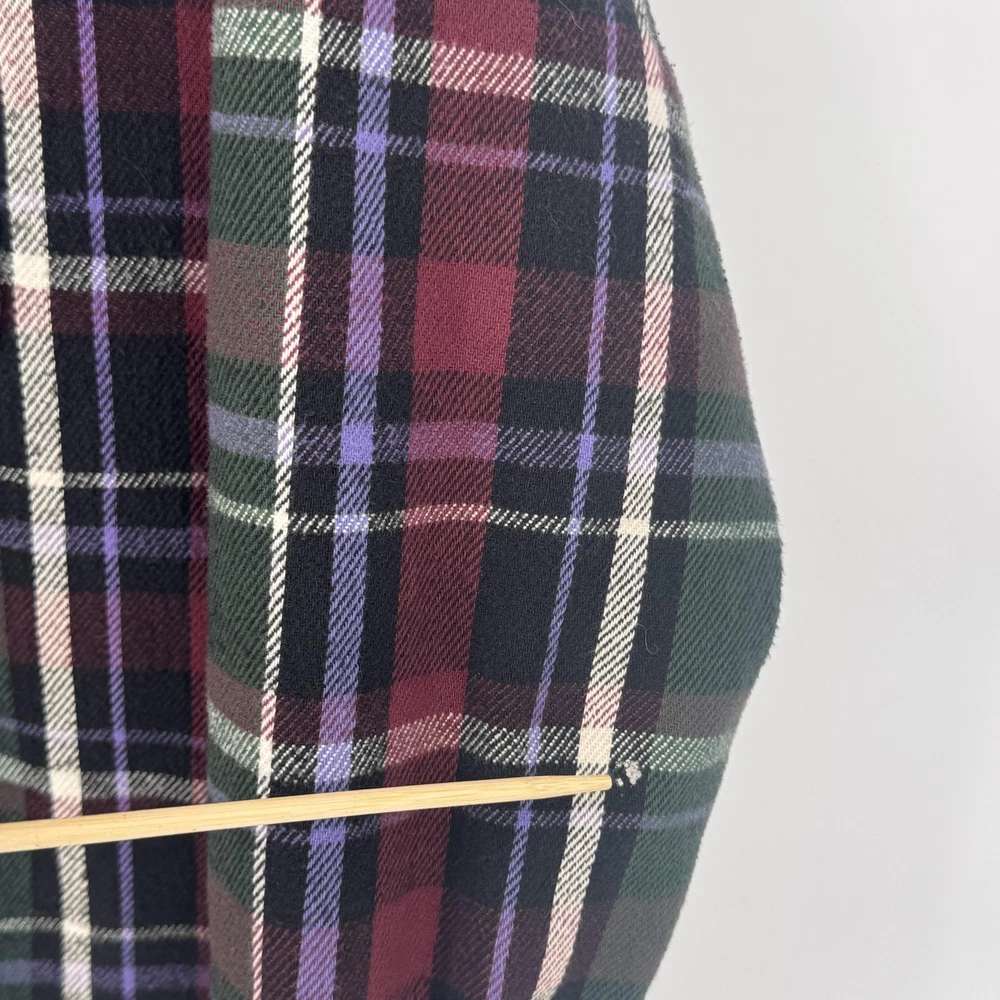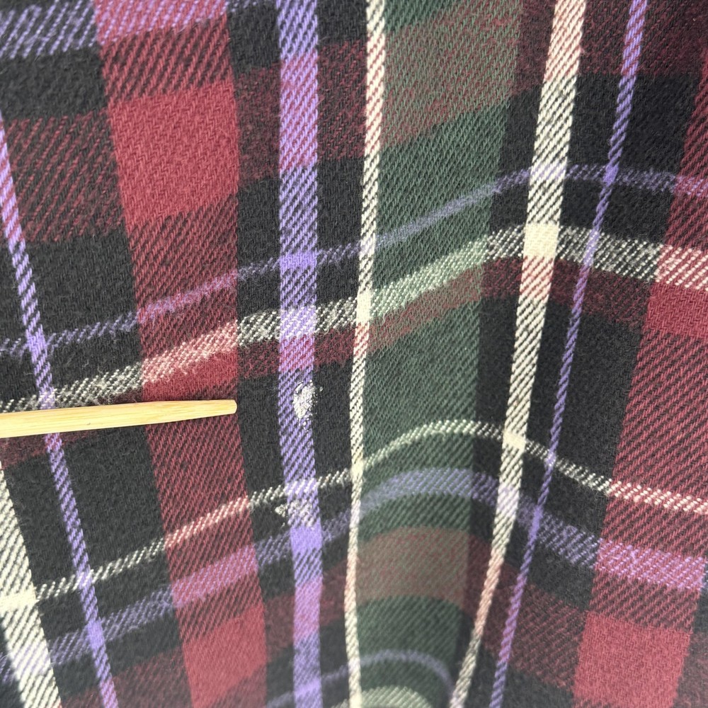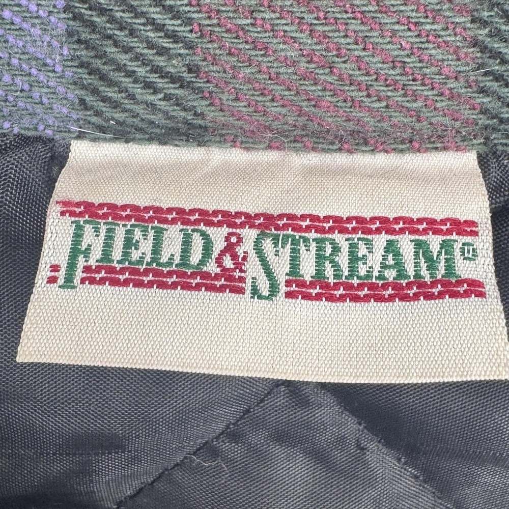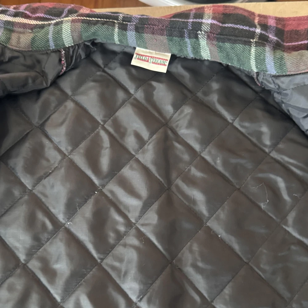 VTG Field & Stream Shirt Jacket Mens Large Shacket Plaid Quilted Flannel Lined Pre-owned quilted flannel shirt jacket with regular use and laundering. Exterior flannel shows general softening with two small stains on the fabric as shown. Buttons, cuffs, pockets, and quilted lining remain intact and functional, and item is sold without original retail tags or packaging. Care and size tag have been removed Brand: Field & Stream. Style: Mens quilted flannel shirt jacket with button front and collared neckline. Color: Multicolor plaid in burgundy, green, black, purple, and off-white tones. Tag size: Mens Large. Material: Outer cotton flannel shell with quilted polyester lining and polyester insulation. Design details: Point collar, full button front closure, long sleeves with button cuffs, and straight hem with a slight shirt-jacket silhouette. Features: Two button-flap chest pockets, quilted insulated lining for added warmth, and mid-length jacket design suitable for layering. Pattern and texture: Allover multicolor tartan-style plaid with a soft brushed flannel exterior and smooth diamond-quilted interior lining. Branding and labels: Woven Field & Stream neck label stitched at the interior neckline. Occasion and use: Ideal for casual wear, outdoor activities, hiking, hunting, or workwear layering in cool weather. Special notes: Classic Field & Stream insulated flannel shirt jacket combining the look of a flannel shirt with the warmth of a lined jacket. 112878