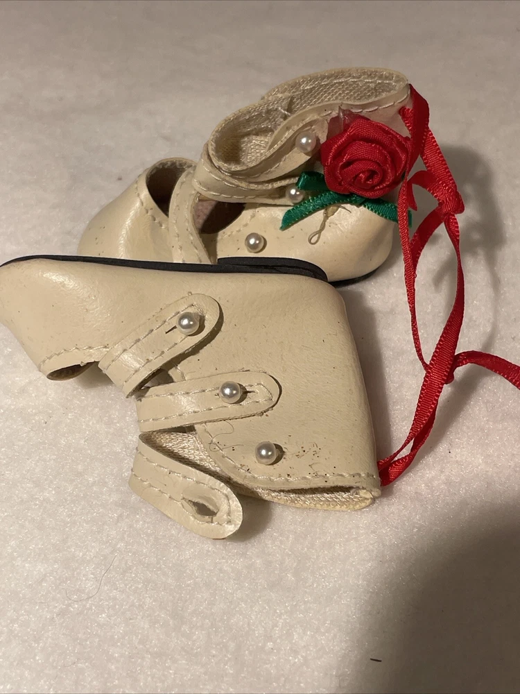 Add a touch of vintage charm to your Christmas ornament collection with these handmade doll shoes ornament. The ivory off white color and pearl like buttons with strap make them a perfect addition to any doll collection. These shoes are small in size, but the length and width can be seen in the pictures provided. The shoes are made with a stitch and glue production technique and are antique with a vintage style. They are suitable for any recipient over 18 years of age and are a unique addition to any collection. These shoes are a perfect gift for anyone who loves collecting vintage ornaments.