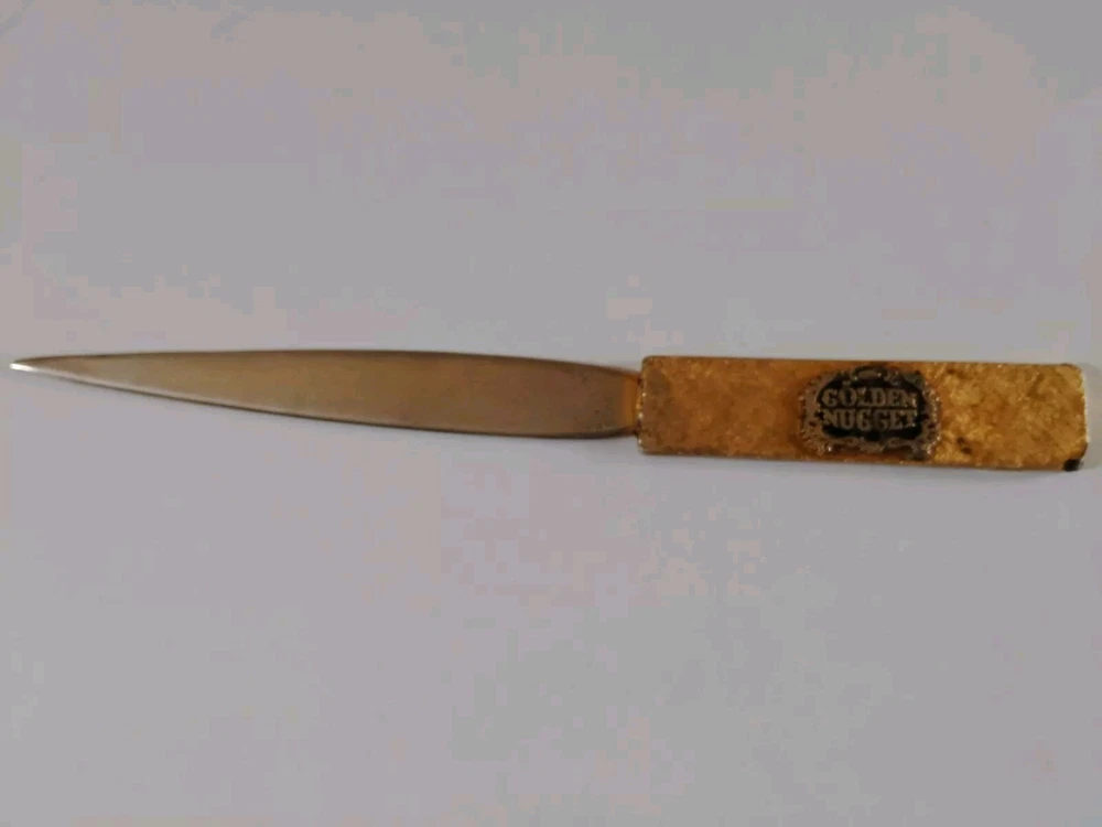 Please note::: see all pictures for condition...this was gold plated at the time and has faded off due to age on the knife file area..the handle pard has some of the golden tone on it but some of it chipped off as seen in the pictures...this is extremely rare as I am the only one selling it on eBay..it's literally 60 years old from the famous Golden Nugget Casino in Las Vegas Nevada...end to end is 8" and very much still usable...free shipping