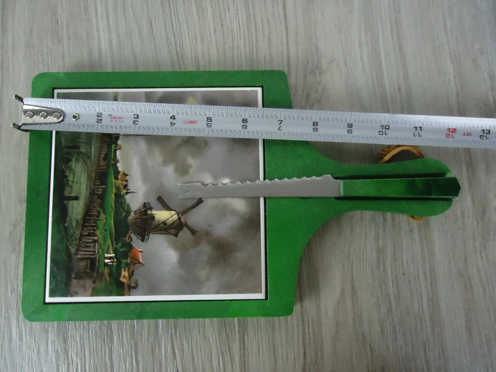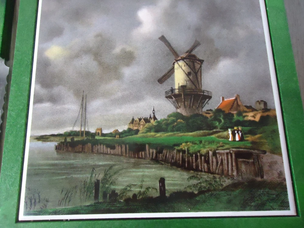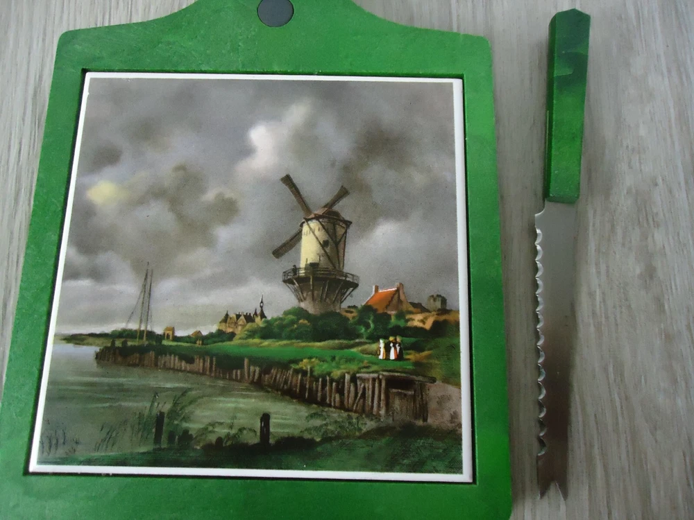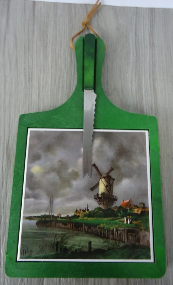 VTG Green Cheese Board Knife Set Windmill Seascape Ceramic Tile Made in Japan