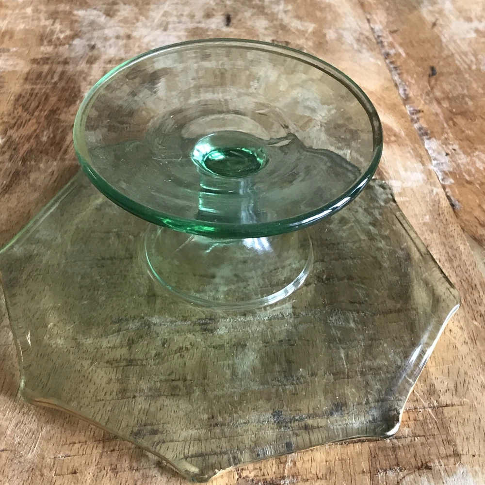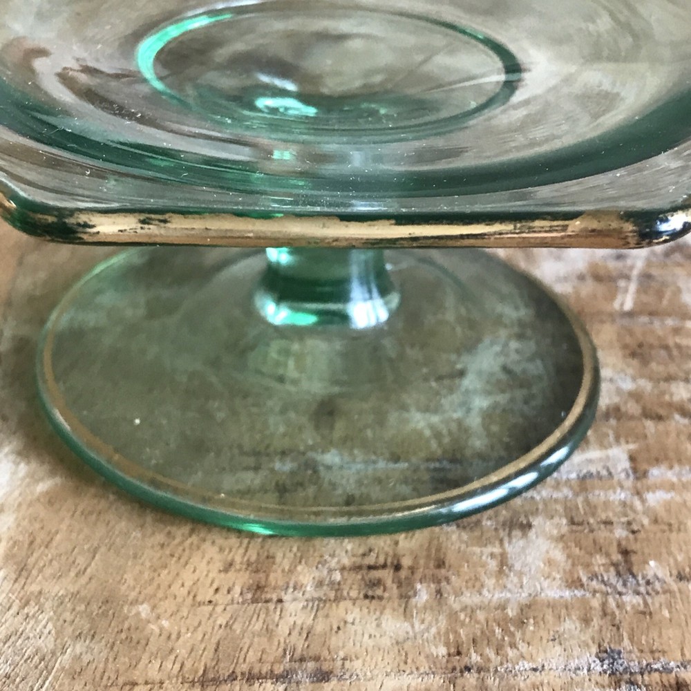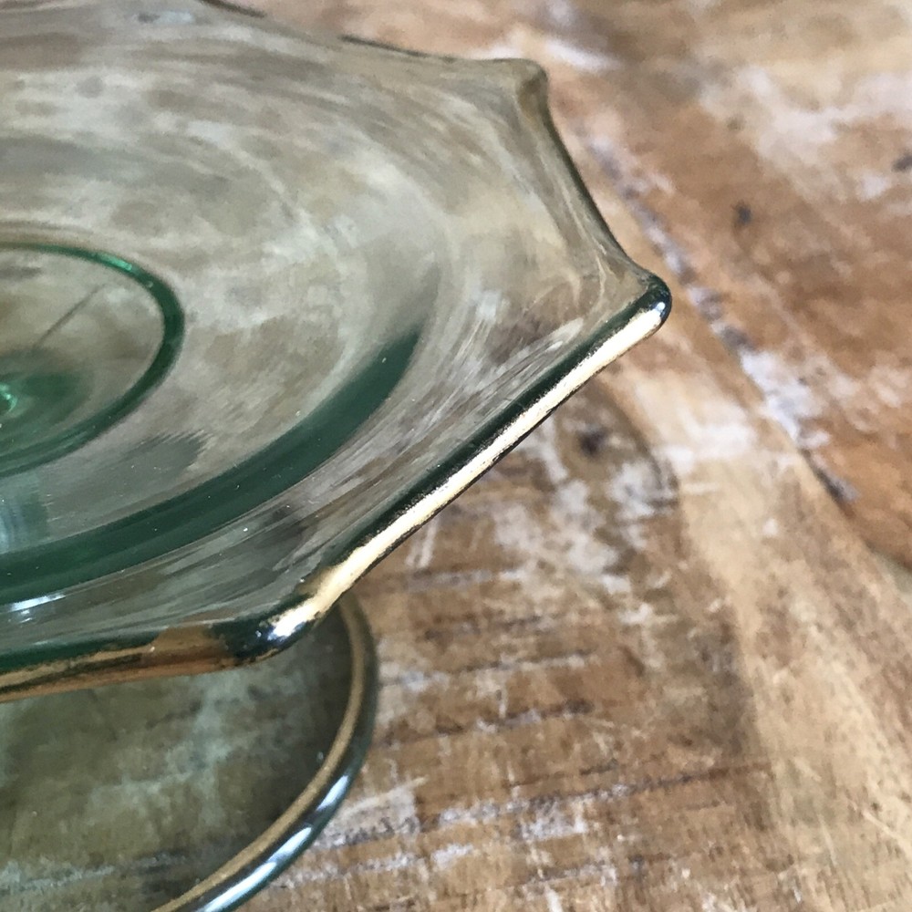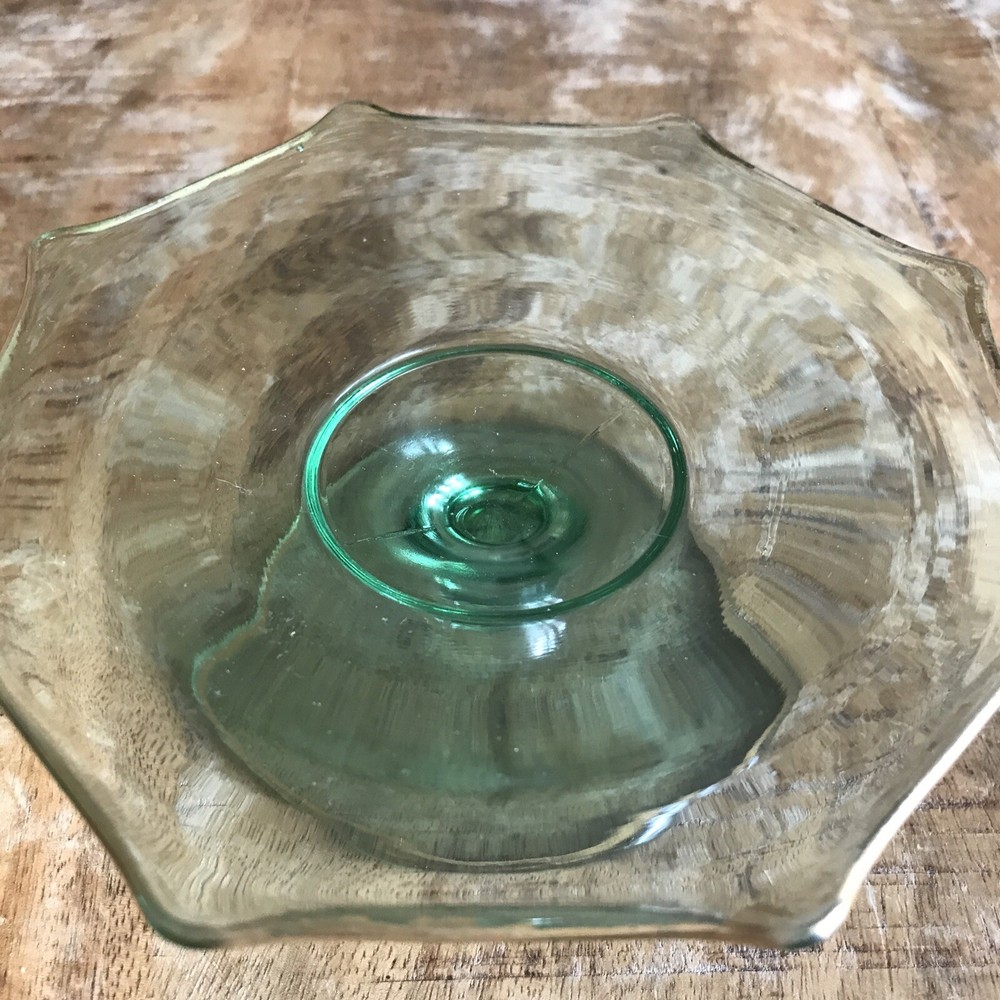 This is a vintage octagon-shaped candy dish with a pedestal base. The dish has a green color and a gold-tone rim. It measures 6 inches in diameter and is made of glass. The brand is unmarked and it is a rare collectable item.