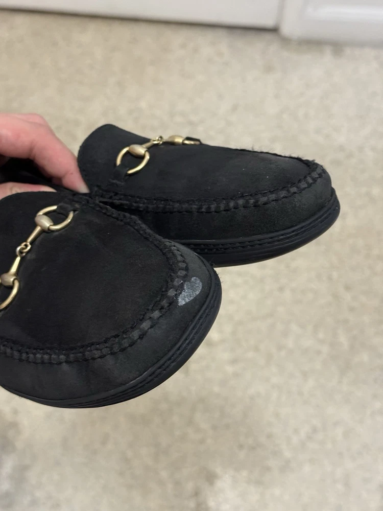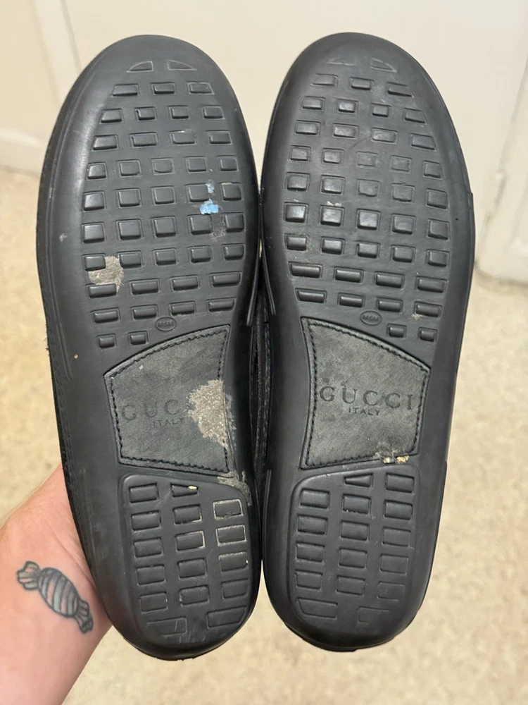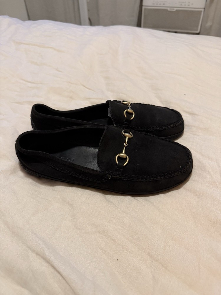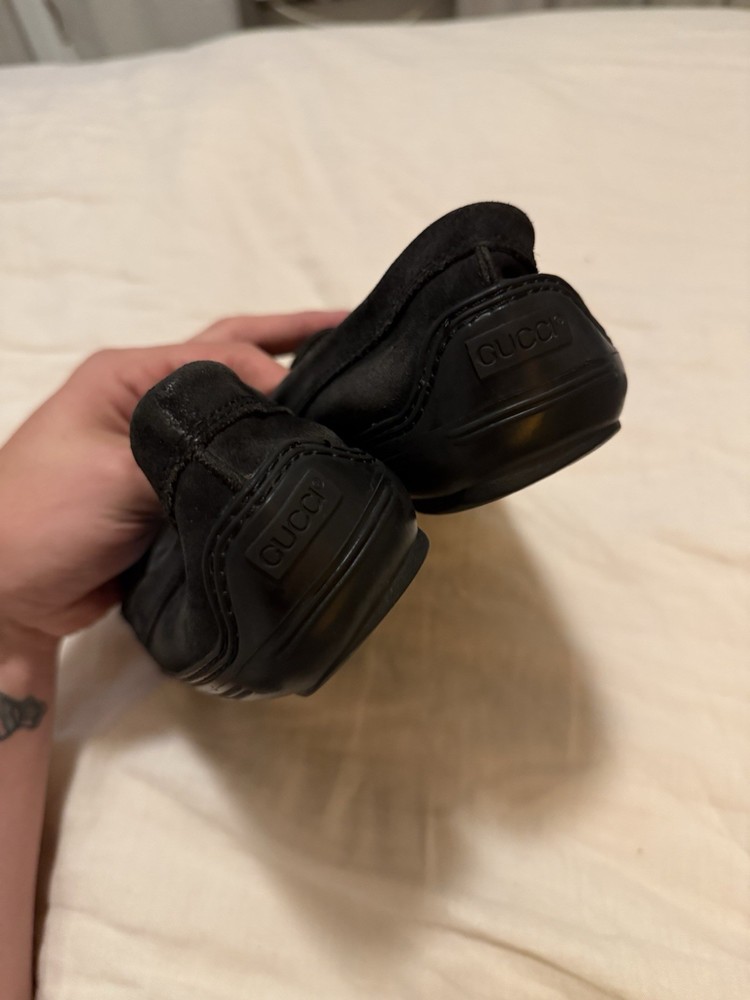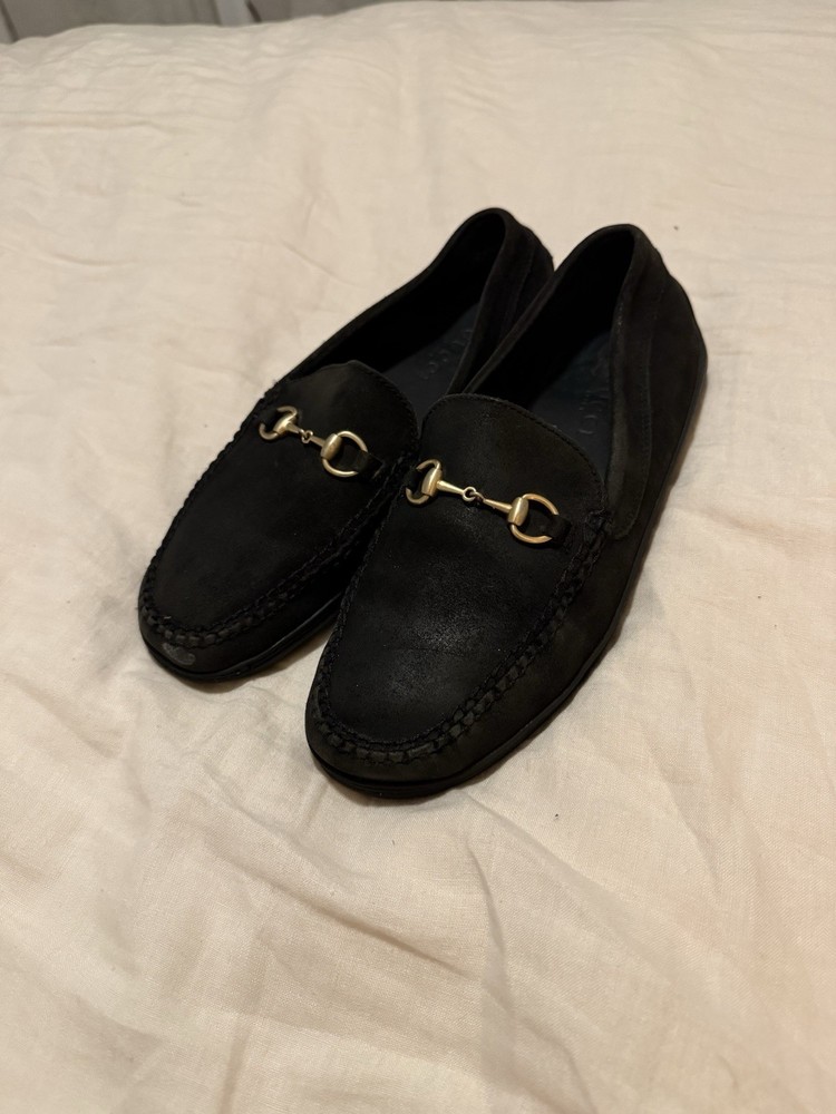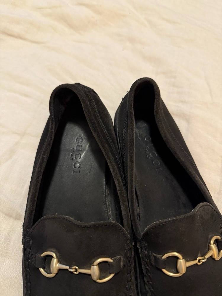 The product is a pair of vintage Gucci gold horsebit suede loafers in black. These dress shoes for men feature a slip-on closure, making them easy and convenient to wear. The design includes a luxurious horsebit detail, adding a touch of elegance and sophistication to any outfit. Perfect for formal occasions or adding a stylish touch to a smart casual ensemble, these shoes exude a sense of classic luxury with a modern twist. Shoes come with no box. Minor stain on the front toe box but not that noticeable on foot. Very comfy, no heel- flat bottom. Easy to wear. Made in Brazil.