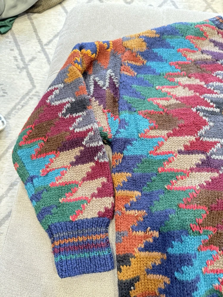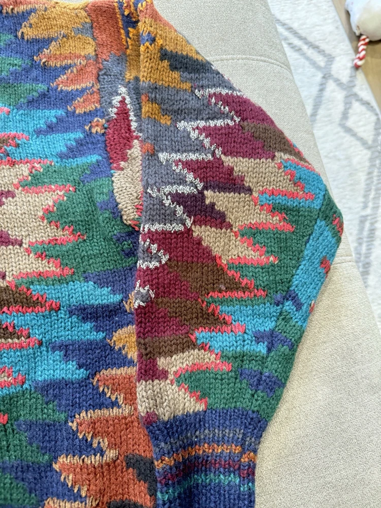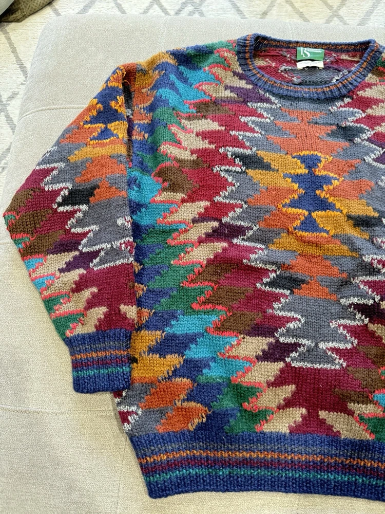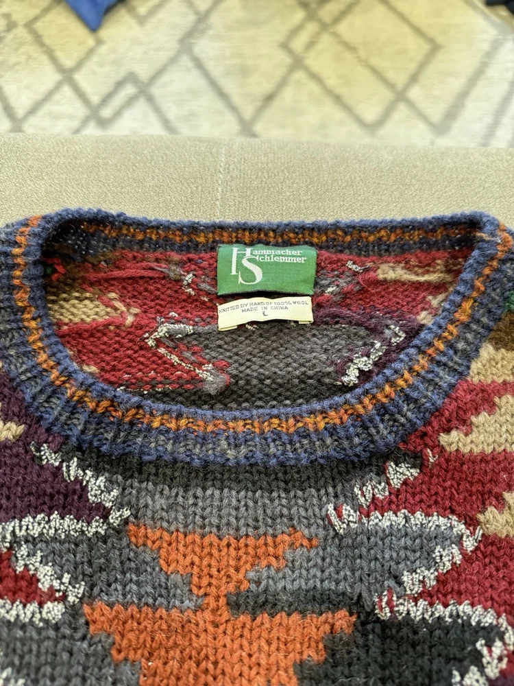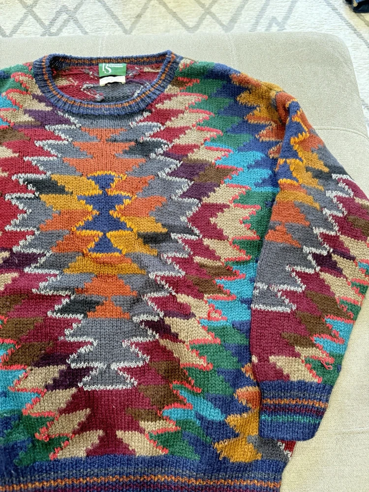 Country/Region of Manufacture:ChinaPersonalize:NoFit:RelaxedKnit Style:Chunky-KnitType:SweaterStyle:PulloverDepartment:MenPerformance/Activity:Any Casual ActivitiesBrand:Hammacher SchlemmerOccasion:CasualNeckline:Crew NeckCharacter:Biggie, Cosby, Trending Knitwear, One of a Kind, Individual Man of StyleGarment Care:HandwashPattern:GeometricSeason:Fall, Spring, WinterTheme:Colors of the Southwest, Tribal Inspired, Vintage 90sColor:MulticolorAccents:Ribbed Striped Detail Wrists and SleevesSleeve Length:Long SleeveFabric Type:KnitFeatures:Hand Knit Sweater, Fabulous Tribal Inspired Design, Great 90s LookMaterial:100% WoolVintage:YesSize:LargeSize Type:Regular