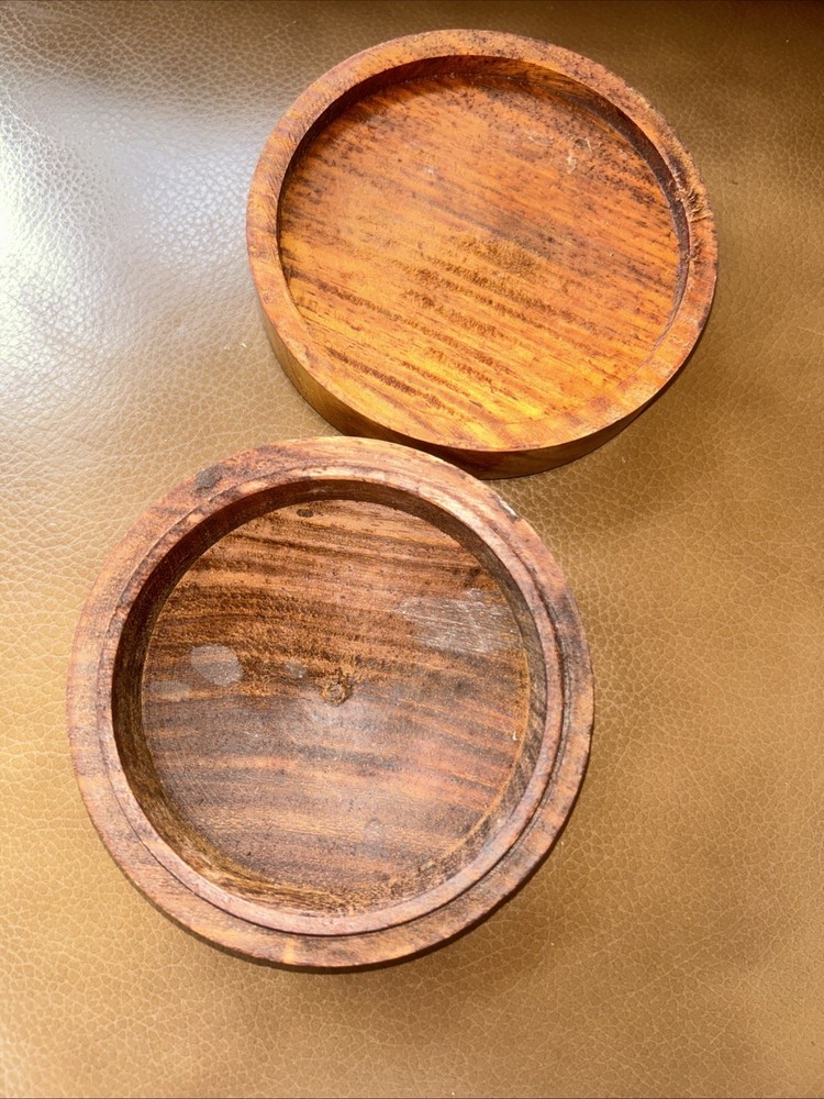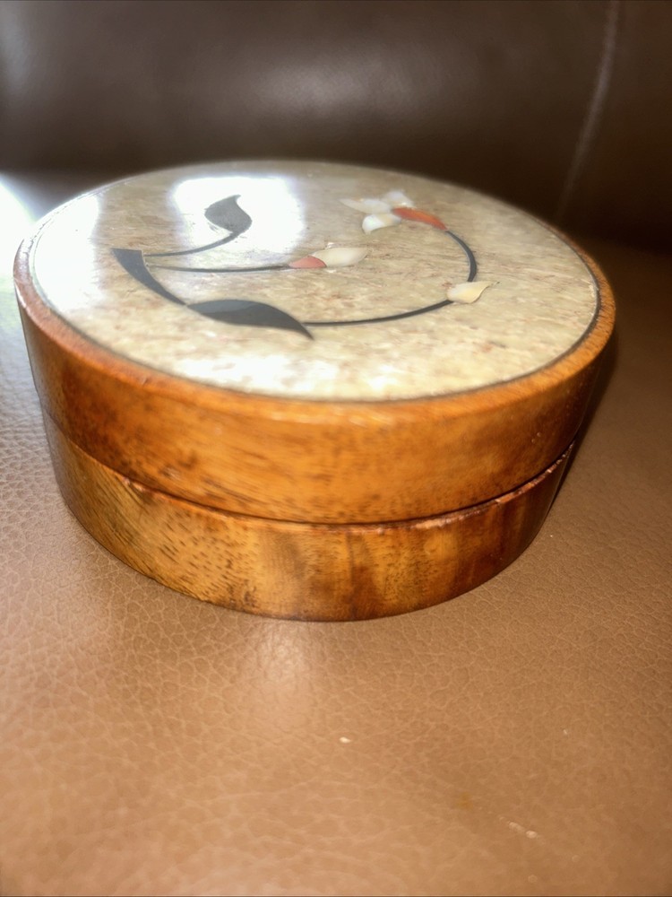 This vintage jewelry box is perfect for storing your precious trinkets and jewelry. The beautiful hand-carved design features a mother of pearl inlay and a traditional floral pattern. The round shape and 2 inch height make it a small and delicate piece that can be displayed in any room, including your bathroom or bedroom. The unbranded box is made of wood . It is a great addition to any decorative collectibles collection. This original piece is a custom item and has not been modified. The box comes unboxed and is easy to clean with just a damp cloth. kk522