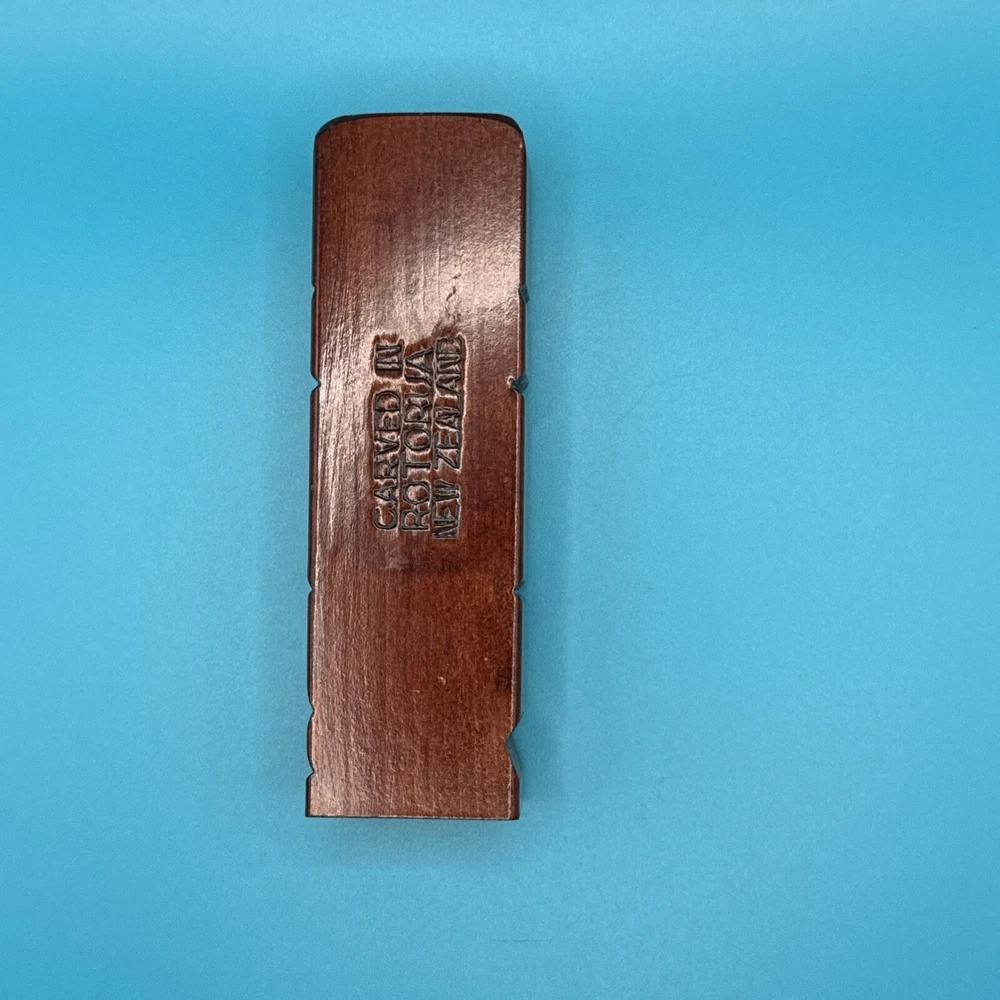 This hand-carved wooden figurine is a unique addition to any collection. The Tiki Island person figure features a totem pole design with intricate carvings and a wooden finish. Measuring 4.25 inches in height and 1.5 inches in width, this small figurine is perfect for any room and occasion. The figure depicts a person kneeling, thumbs up, sticking tongue out with brown wood tone. The carvings on the figurine are detailed and include a tongue and opal shell eyes. This original piece from the late 20th century is a must-have for collectors of Tiki and island-themed items. Carved in Rotorua, New Zealand