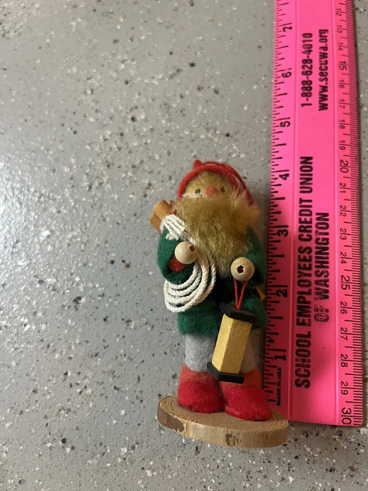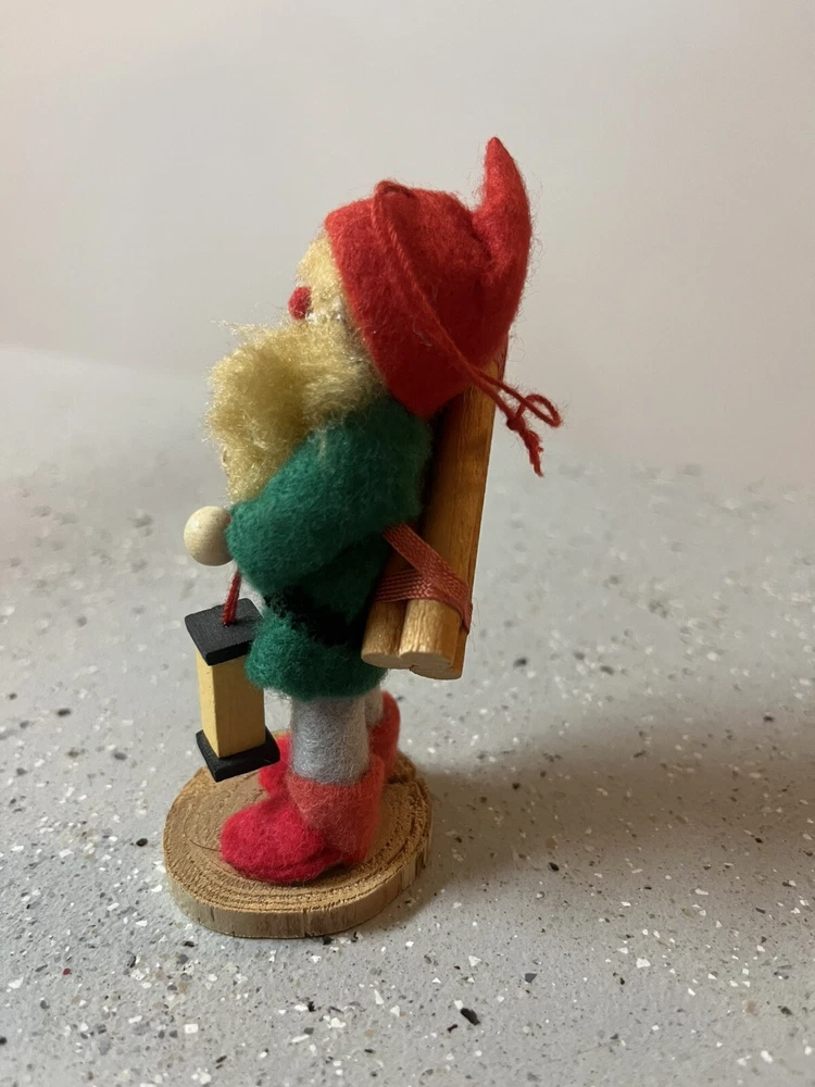 Add a touch of whimsy to your holiday decor with this charming vintage handmade gnome ornament. Dressed in a handcrafted Nordic green coat with intricate wood detailing, this delightful elf is sure to enchant any Christmas collection. With a height of 3 inches, it perfectly captures the rustic design and hand-painted details that bring its character to life. This unique ornament is a single piece that embodies the spirit of the season. Celebrate Christmas with this one-of-a-kind felted woodlands gnome, an elegant addition to your festive decorations. It's not just an ornament; it's a piece of art that represents the joy and magic of the holiday.