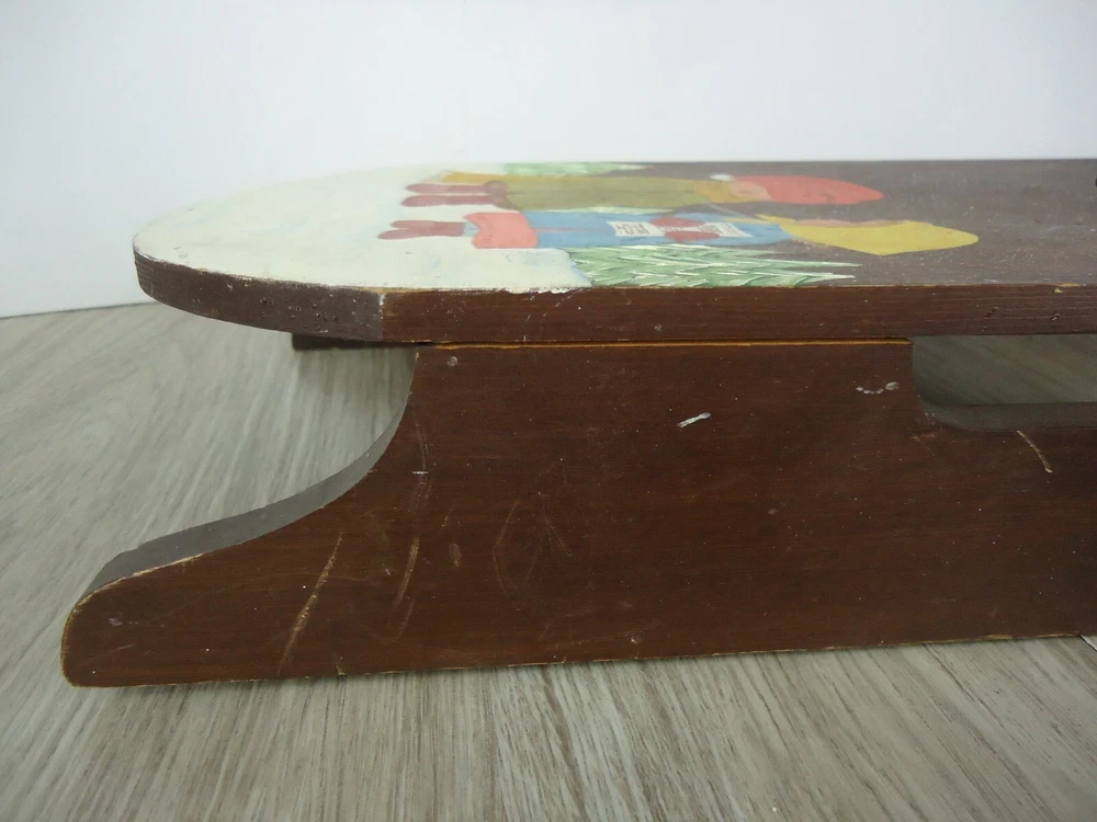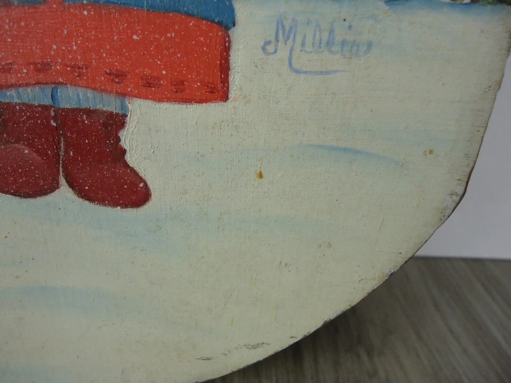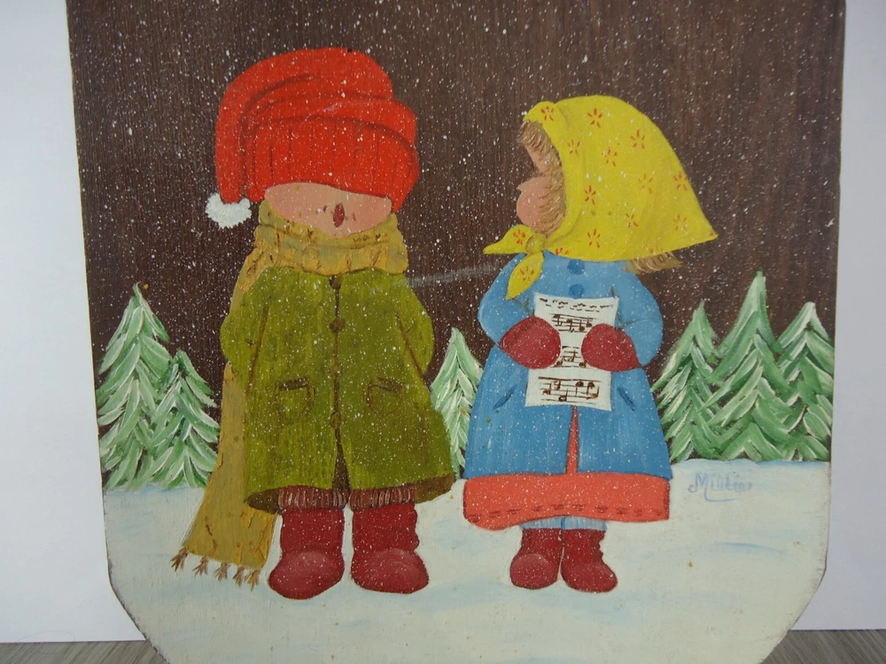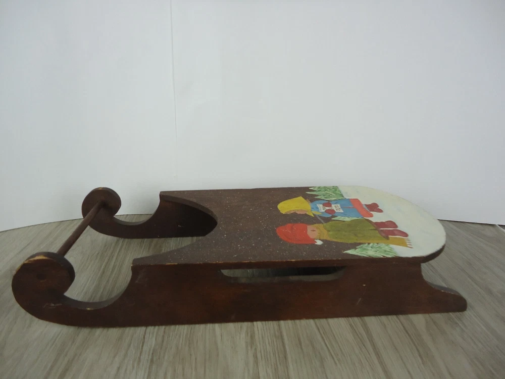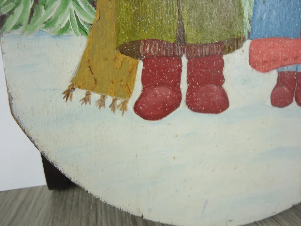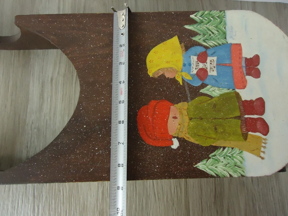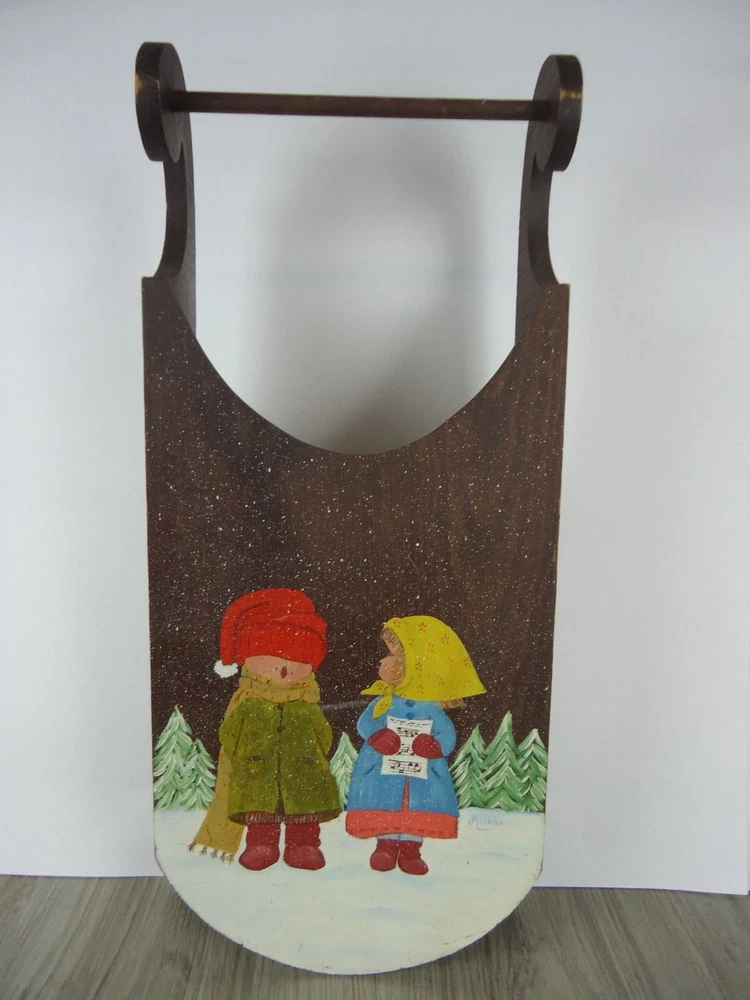 VTG Hand Painted Signed Wooden Sled Winter Decor Children Carolers Snow Trees
