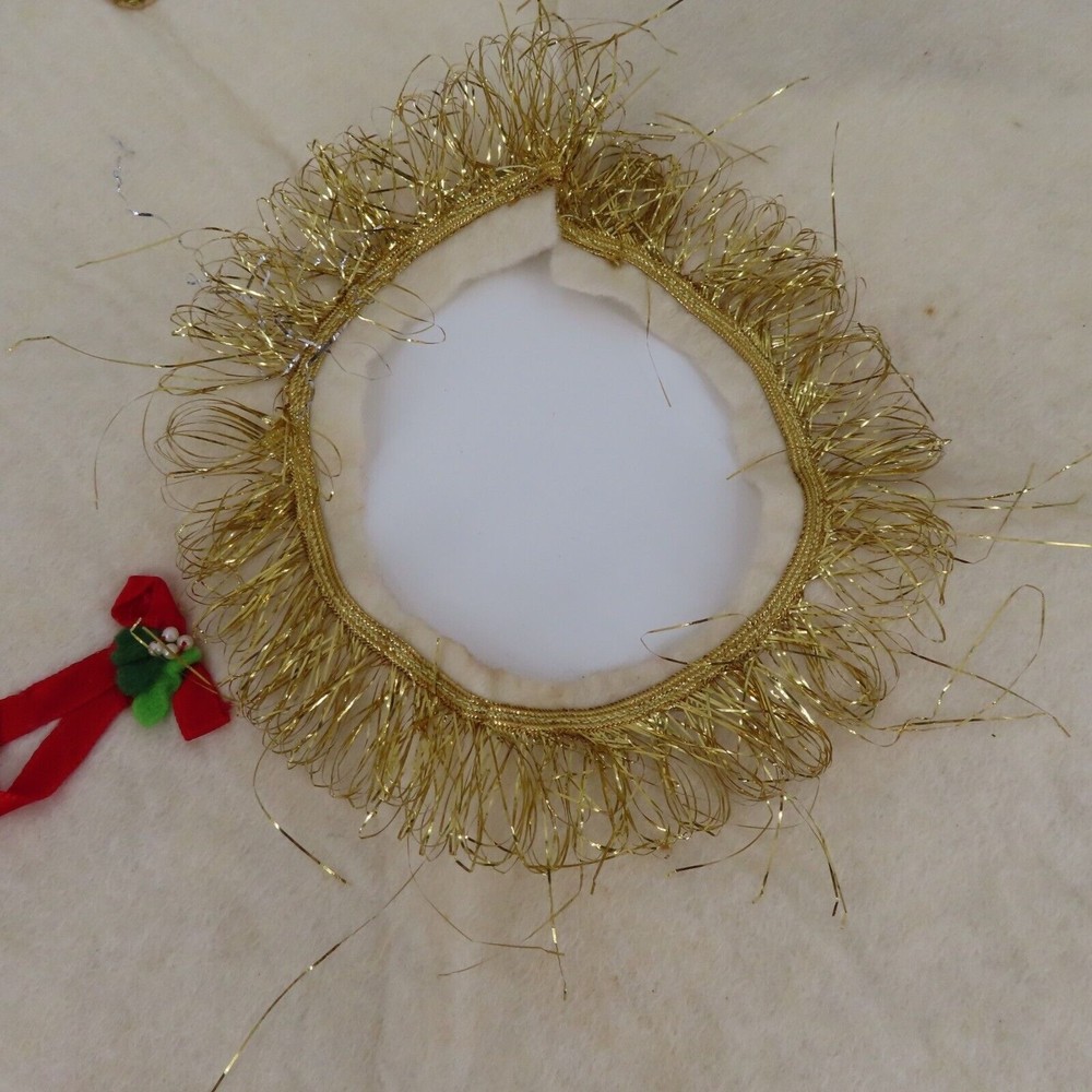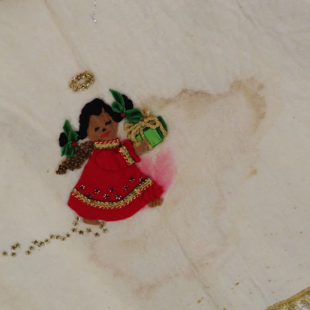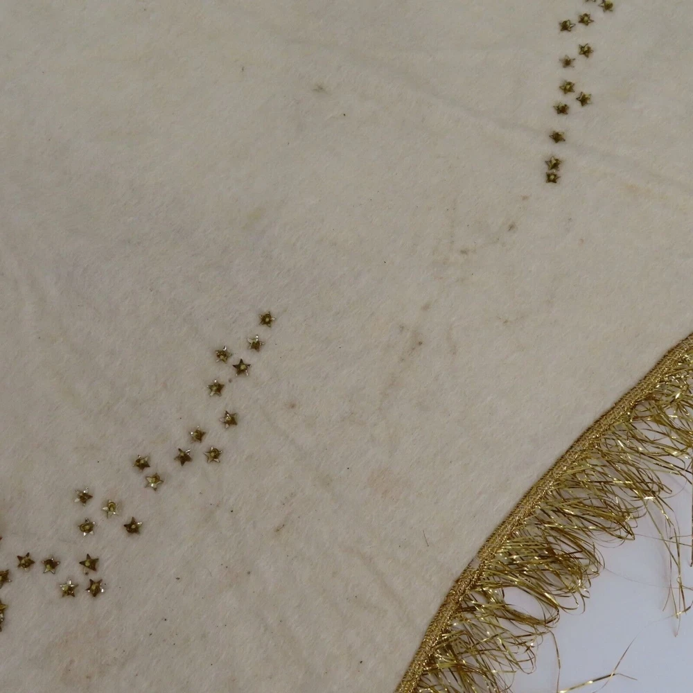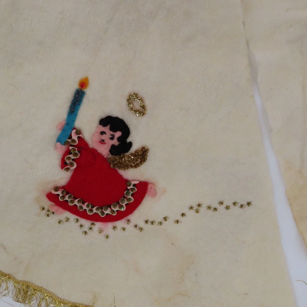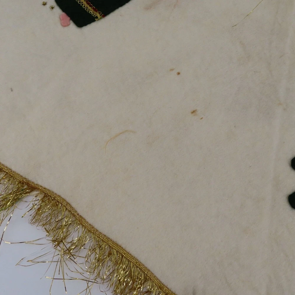 Vintage handmade felt tree skirt Diameter: 37" **measurements are approximate, taken with item laying flat Condition: used, surface wear/stains throughout- see photos, smoke free home Please review all photos closely as these will be the best description of the item. Thank you for shopping!