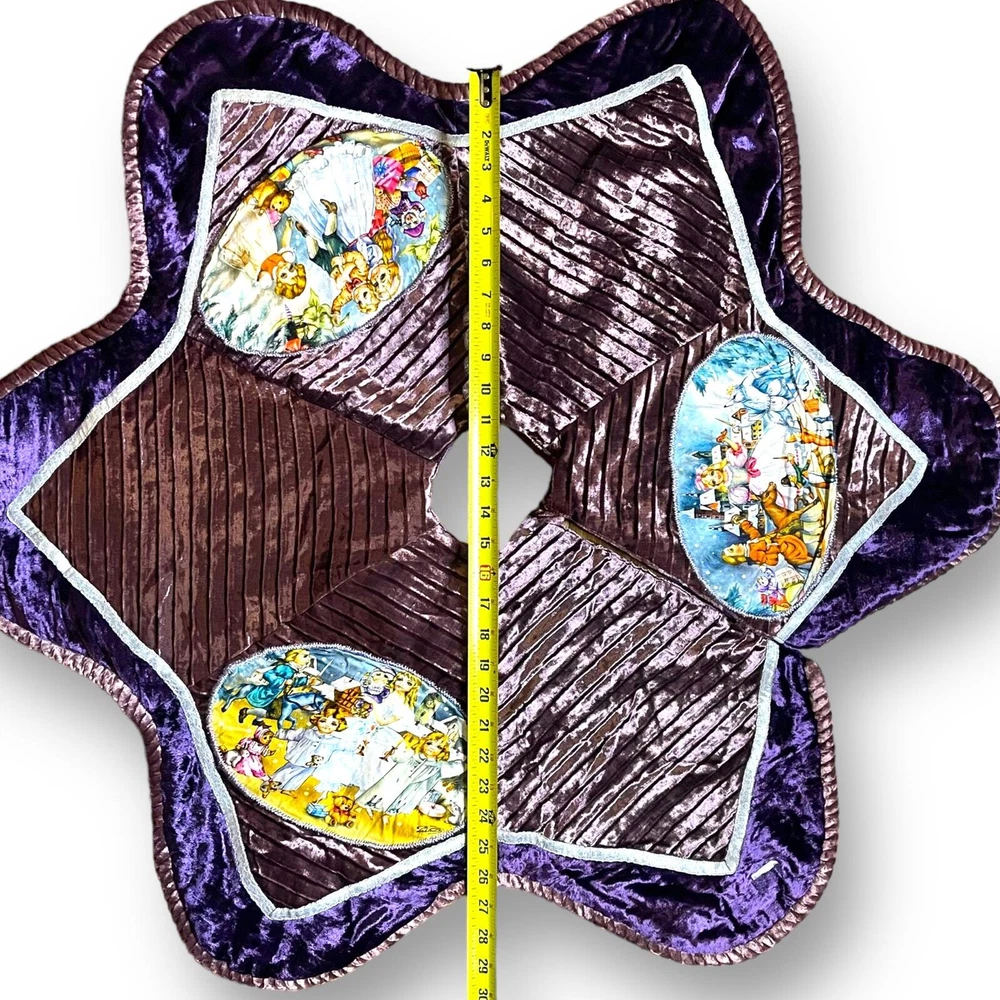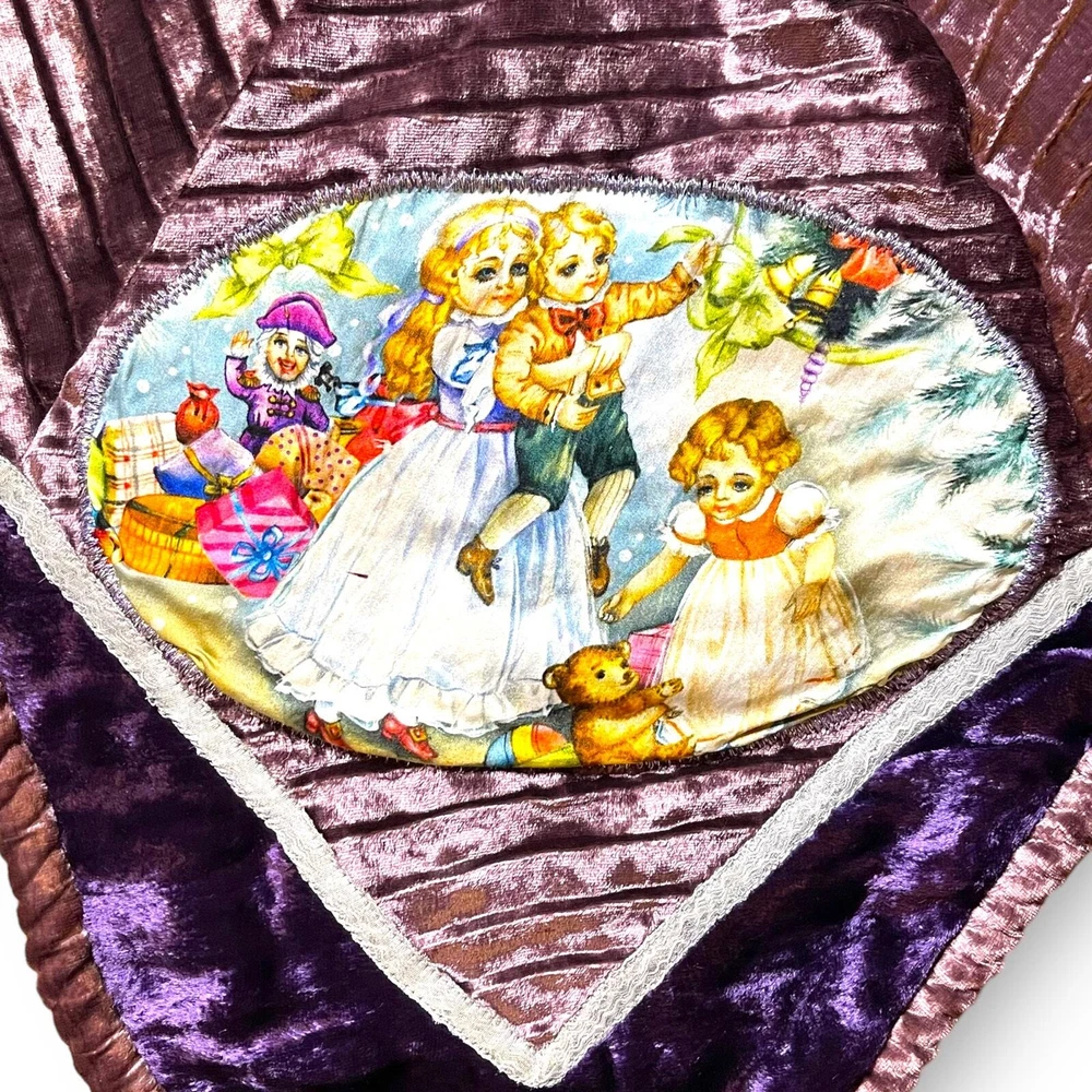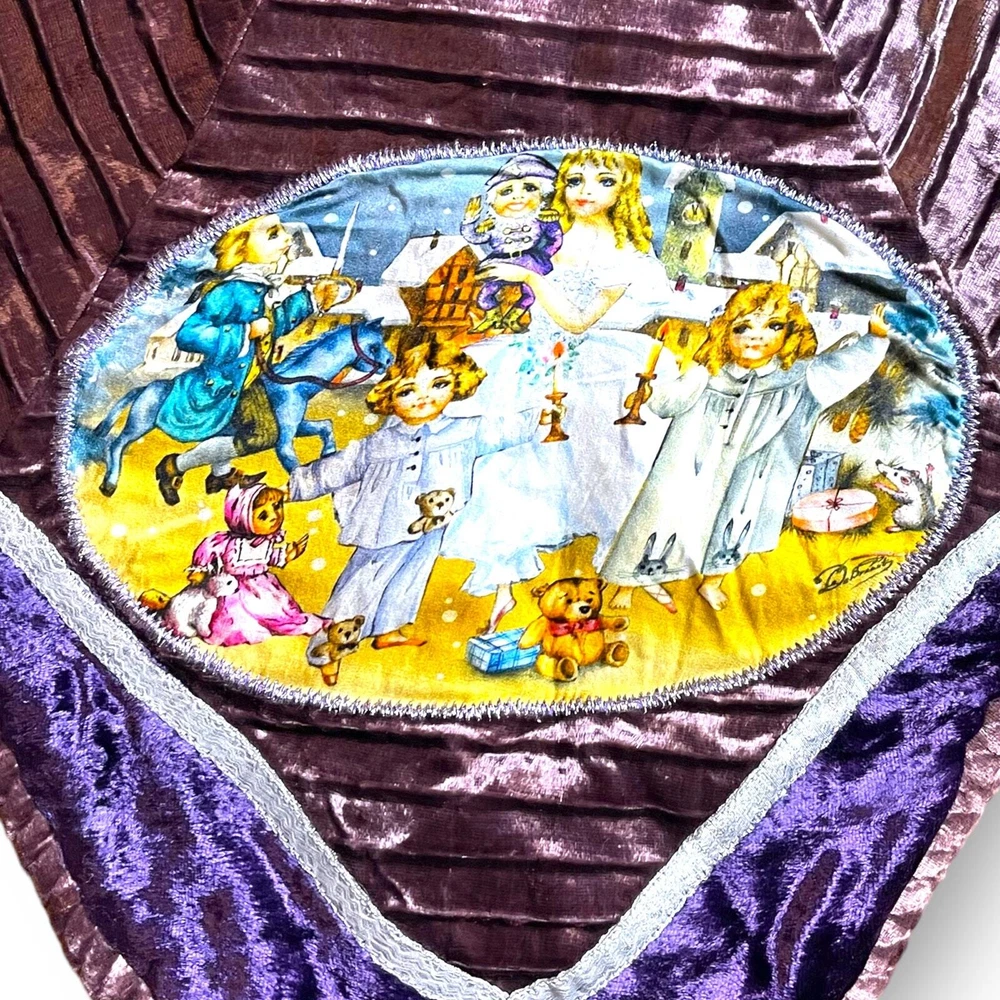 Vintage Handmade Christmas Tree Skirt Enhance your festive décor with this eye-catching Vintage Handmade Christmas Tree Skirt. This unique design transports you to a magical winter wonderland with its beautiful vintage children’s patterns and colors. It's long-lasting and strong, making it an ideal addition to your holiday celebration decor. Plus, its festive appeal is sure to set the mood for Christmas merriment. Get the perfect piece for you today! The skirt is in great vintage condition and ready for use. B22