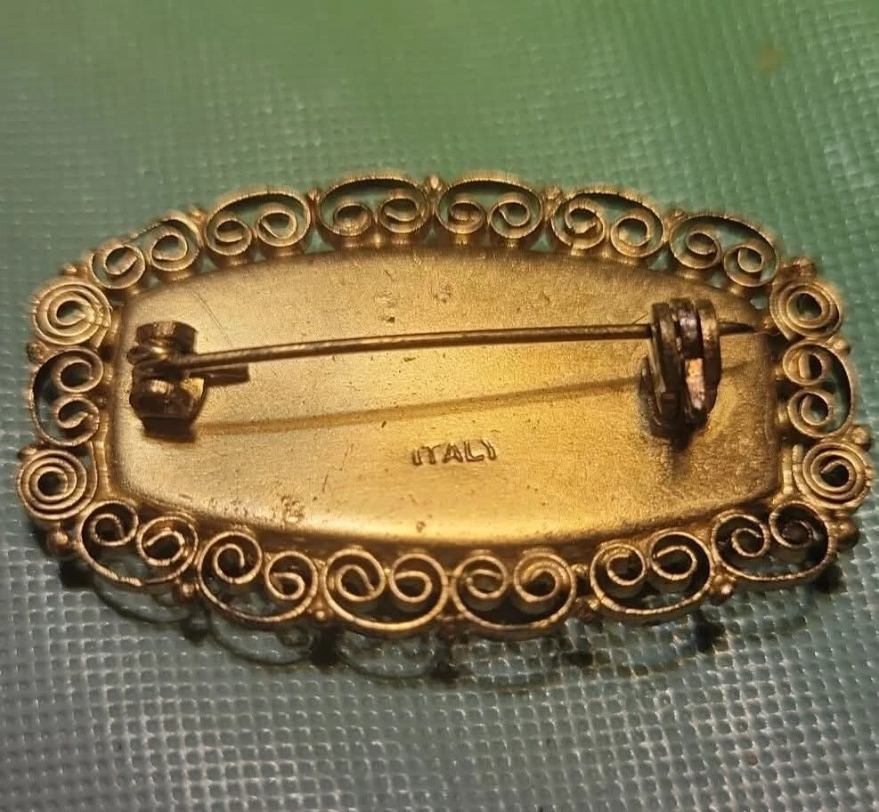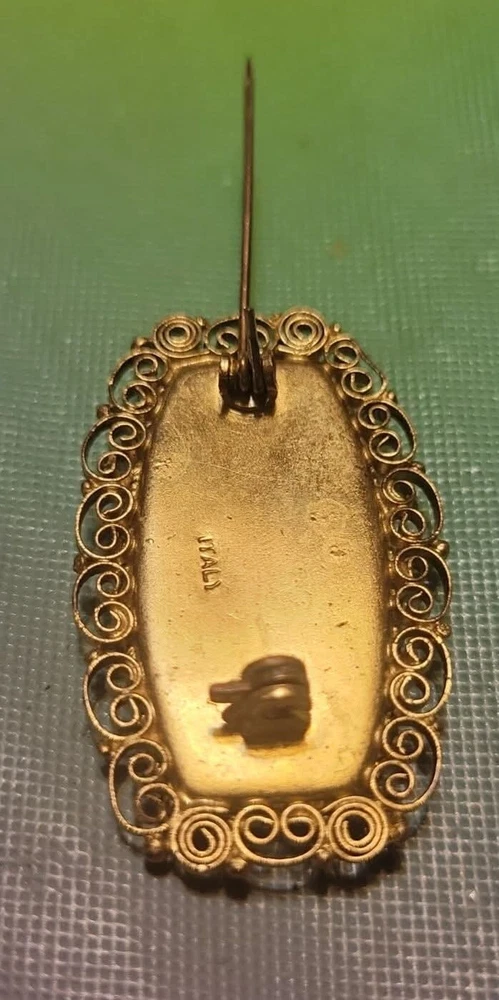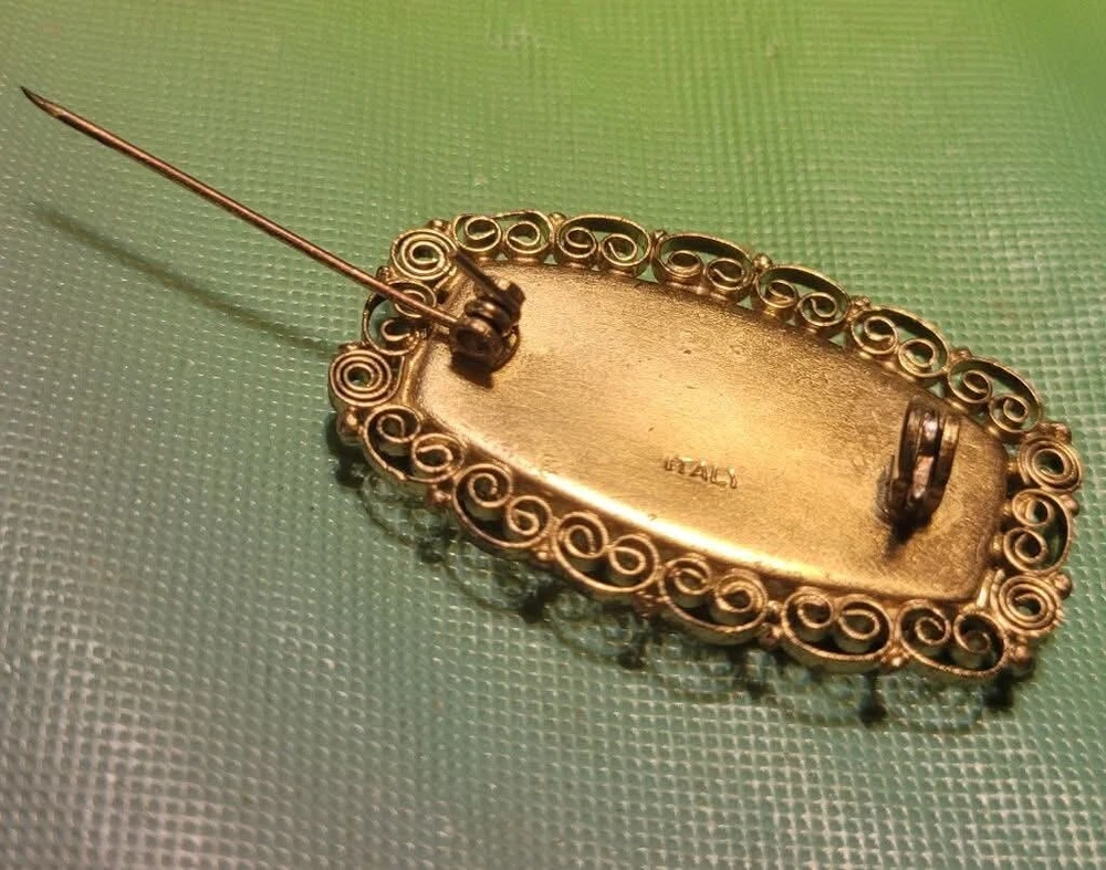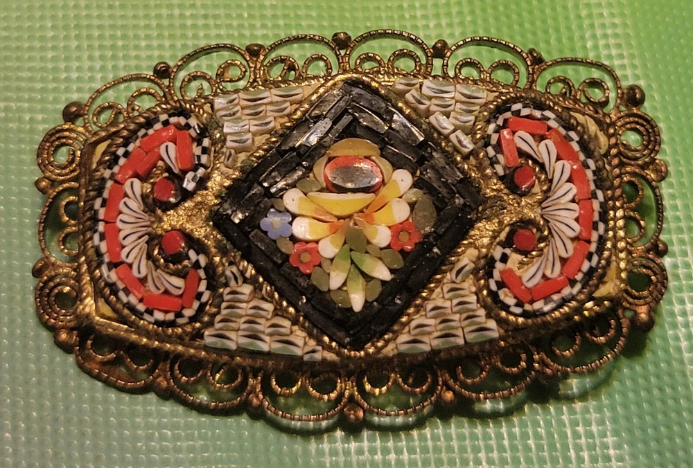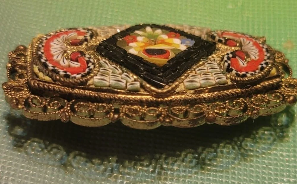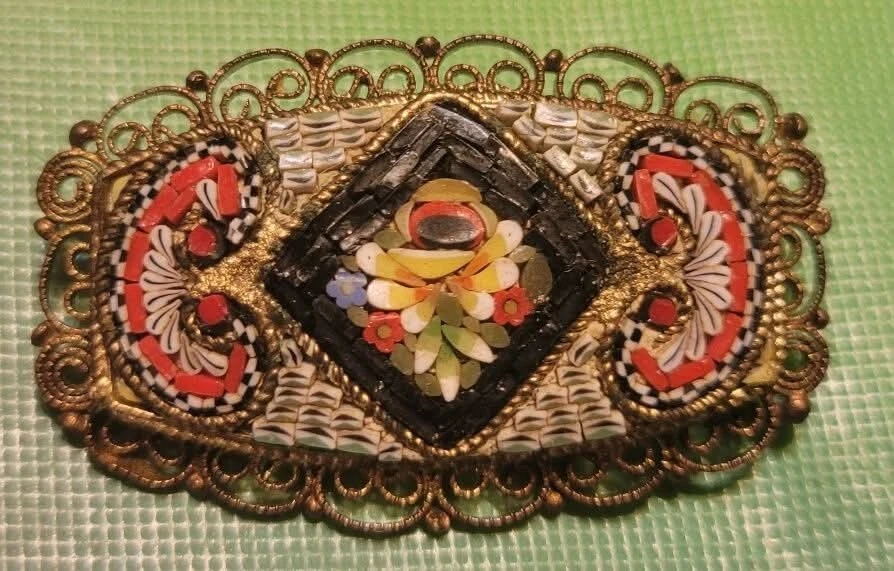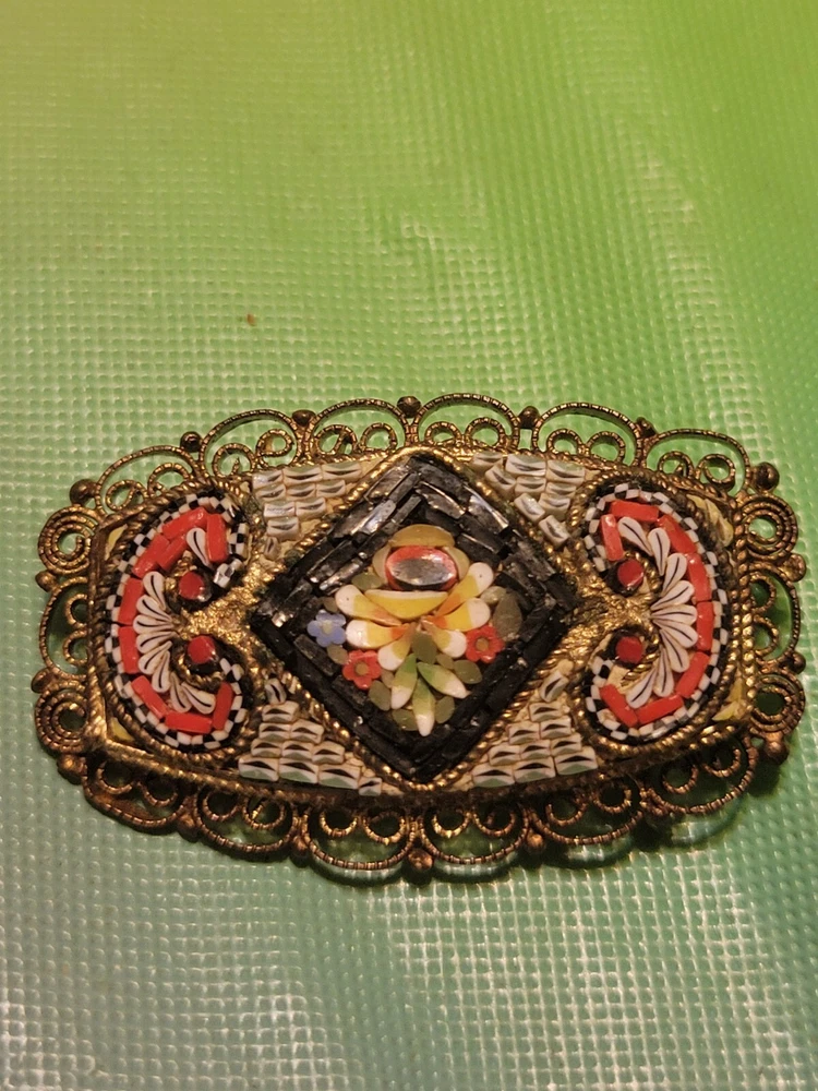 This is a vintage Italian Victorian micro mosaic hat pin brooch. It is a rounded rectangular shape and made of glass beads with a multicolor design. The item length is 1.75 inches and it is from Italy. It features antique jewelry characteristics and showcases intricate mosaic craftsmanship. The metal on the piece is a brass tone or actual brass. Clasp is intact. The brooch appears to be in very good vintage condition. E- mail me with questions. Thanks for checking out my auctions!
