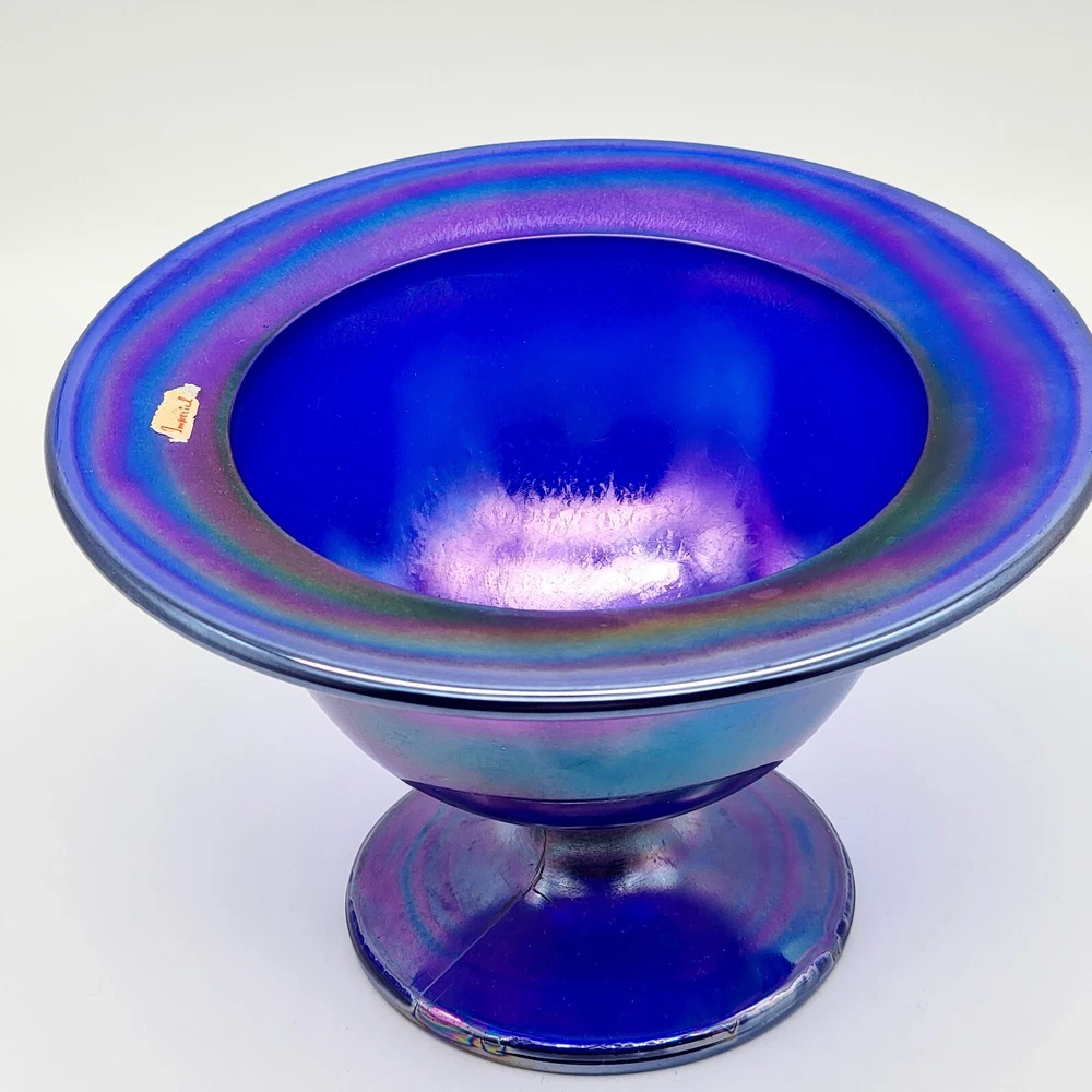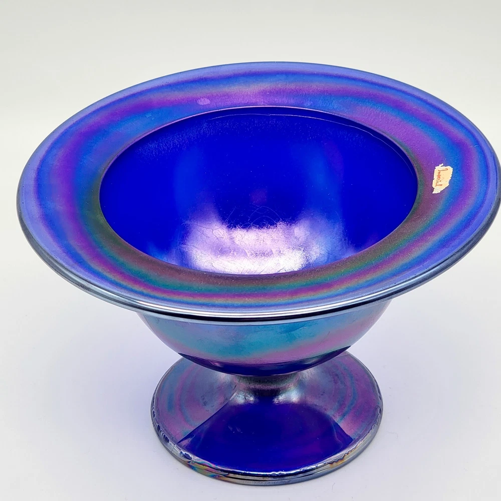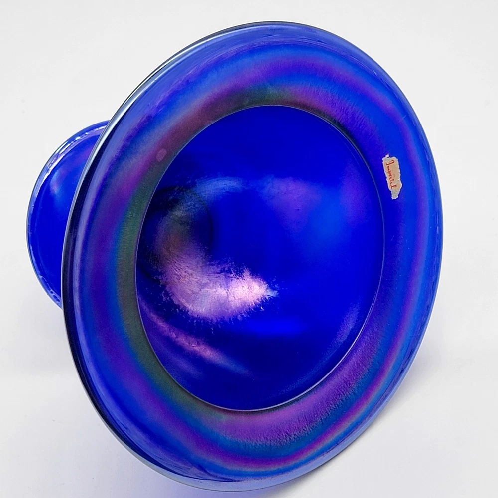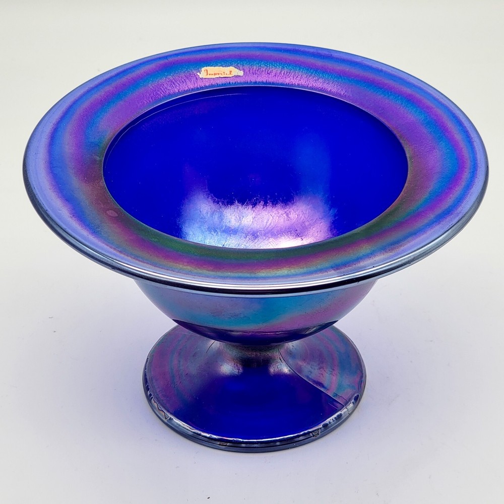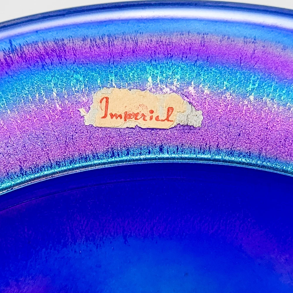 This bowl's got more flair than your grandma's Sunday hat collection. The iridescent colors stretch like they’re trying to escape, but that foot just won't let them. It's perfect for holding fruit or your secret stash of candy that you don't want to share with anyone. • Cobalt blue with iridescent finish • Footed design for stability • Vintage Imperial branding • Ideal apartment-size centerpiece or display item