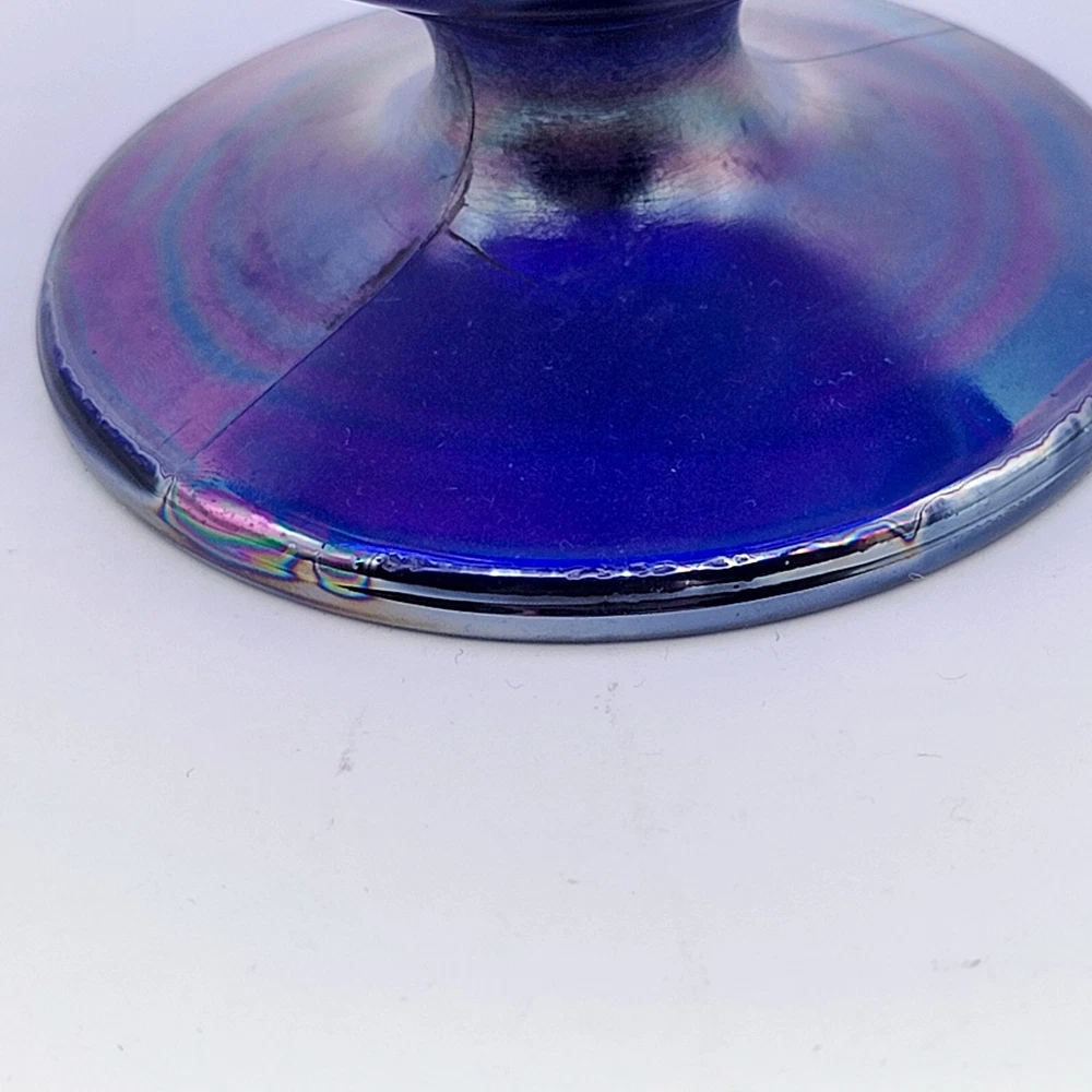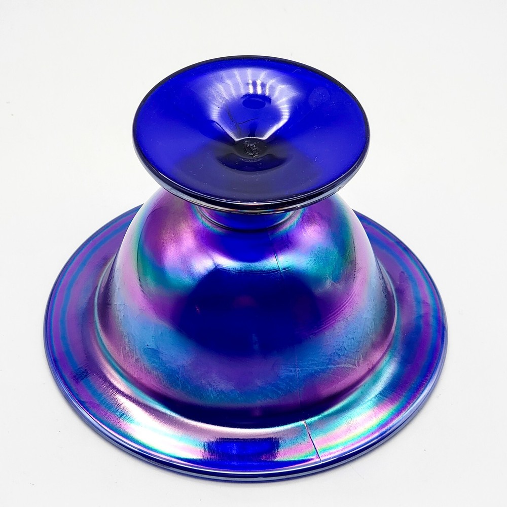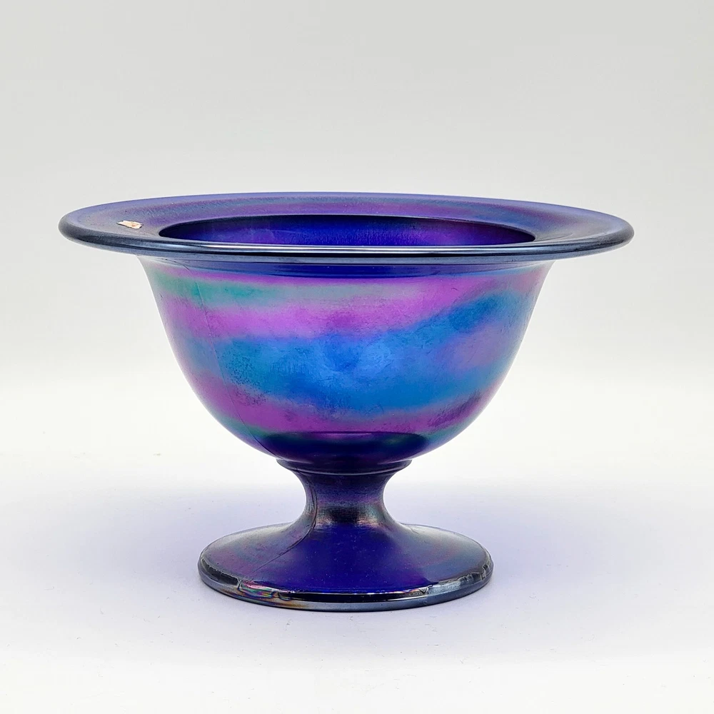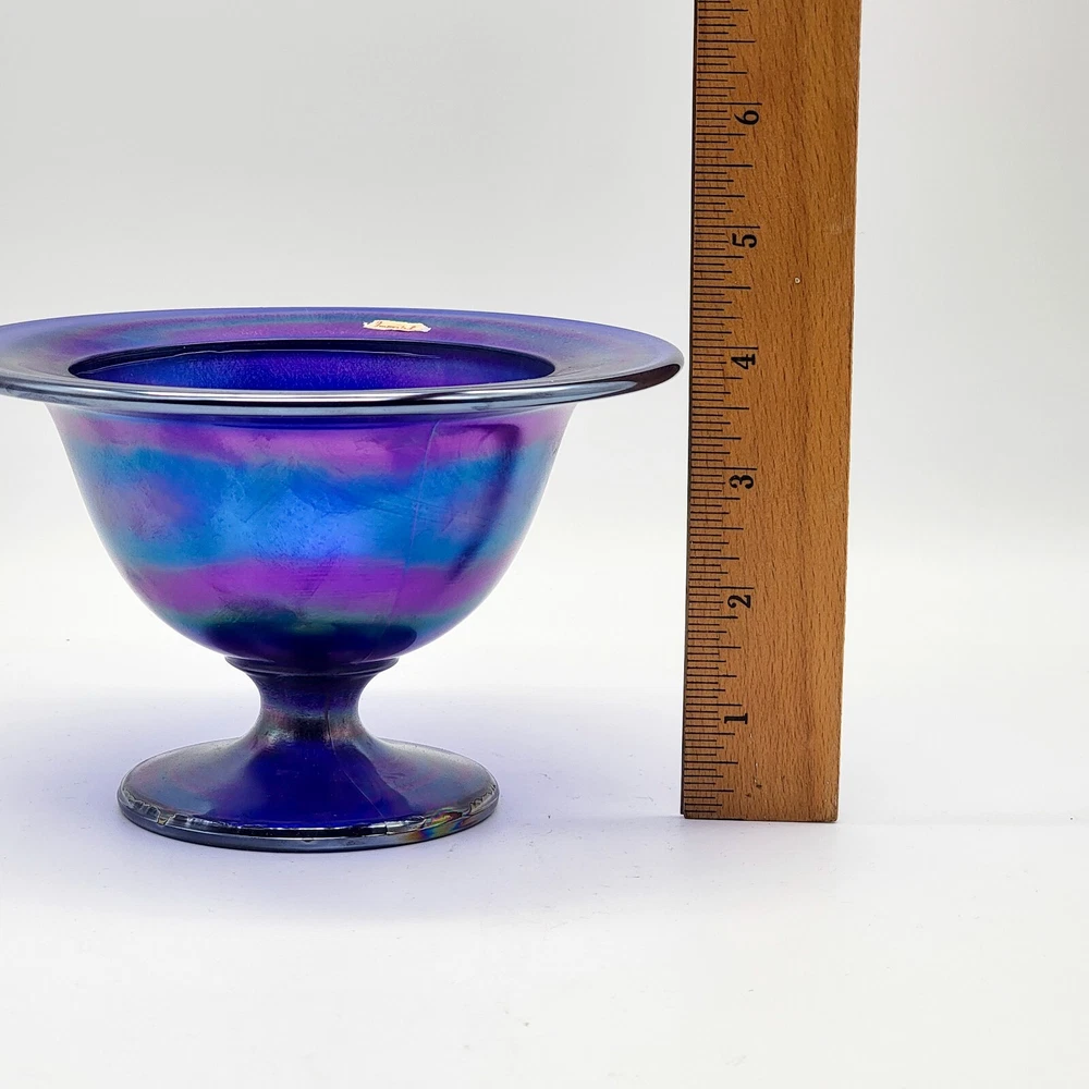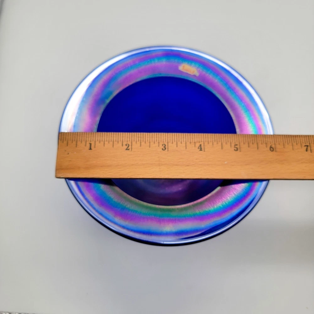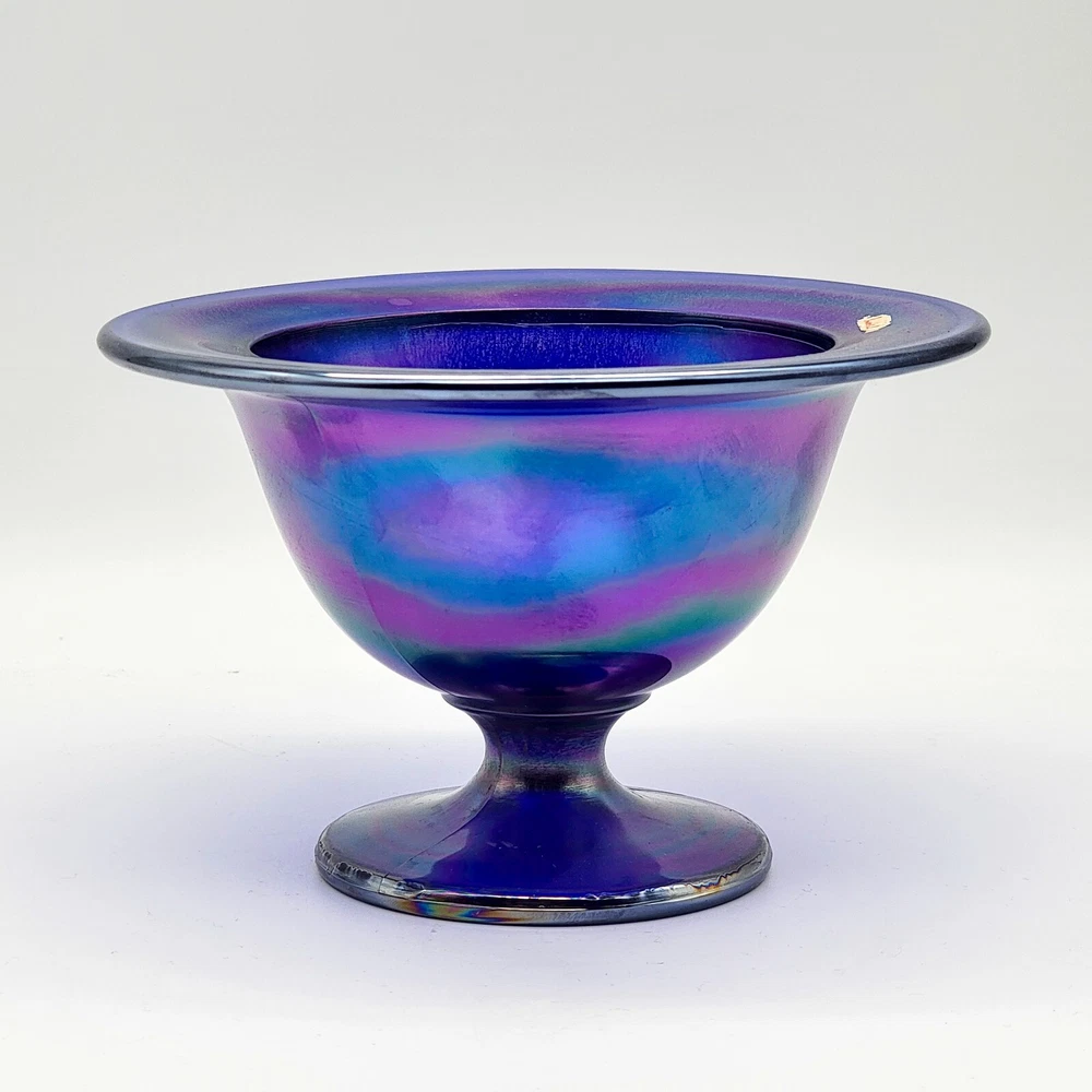 This bowl's got more flair than your grandma's Sunday hat collection. The iridescent colors stretch like they’re trying to escape, but that foot just won't let them. It's perfect for holding fruit or your secret stash of candy that you don't want to share with anyone. • Cobalt blue with iridescent finish • Footed design for stability • Vintage Imperial branding • Ideal apartment-size centerpiece or display item