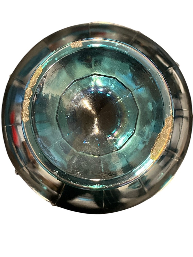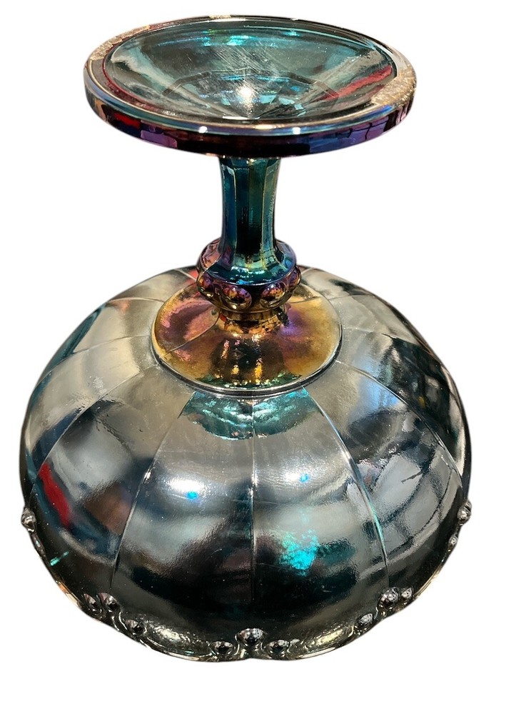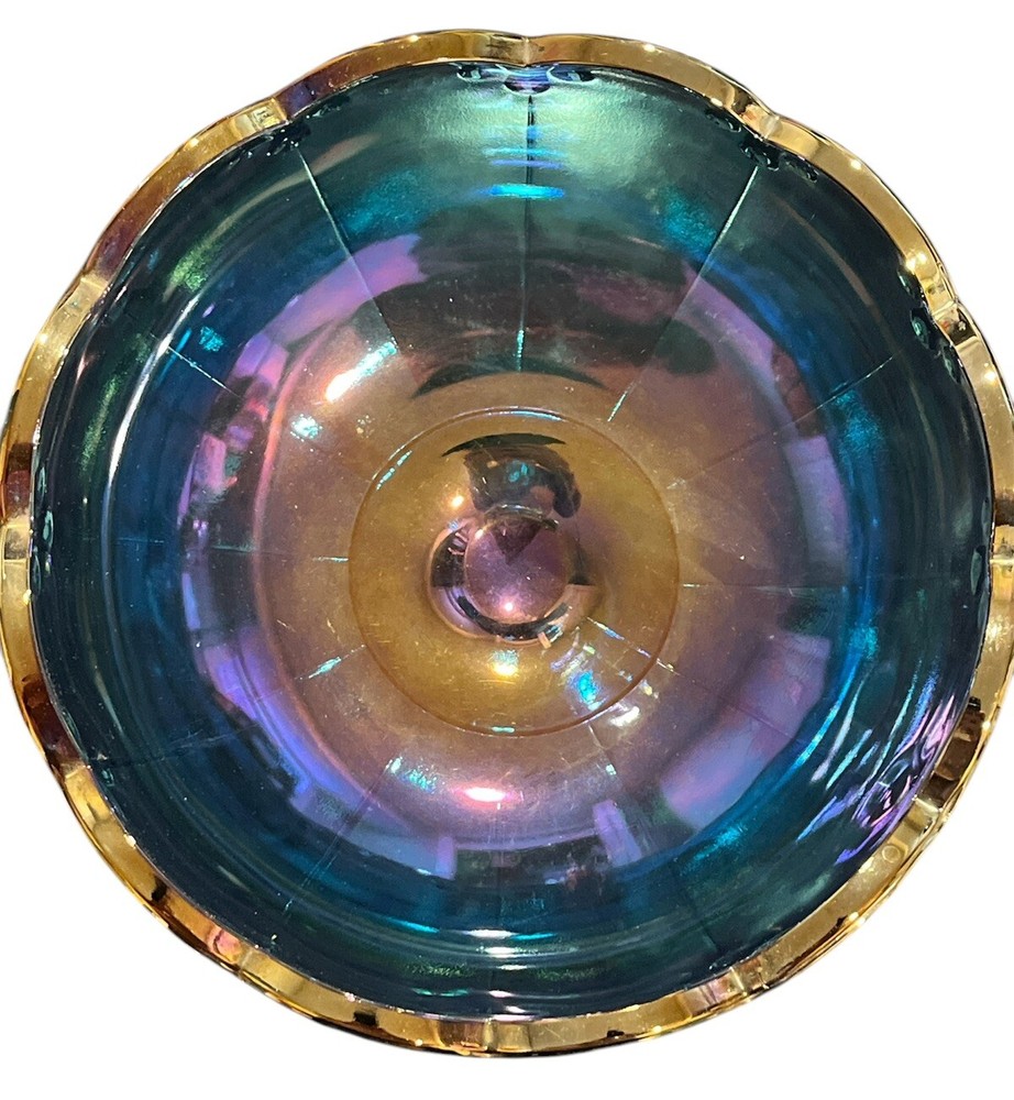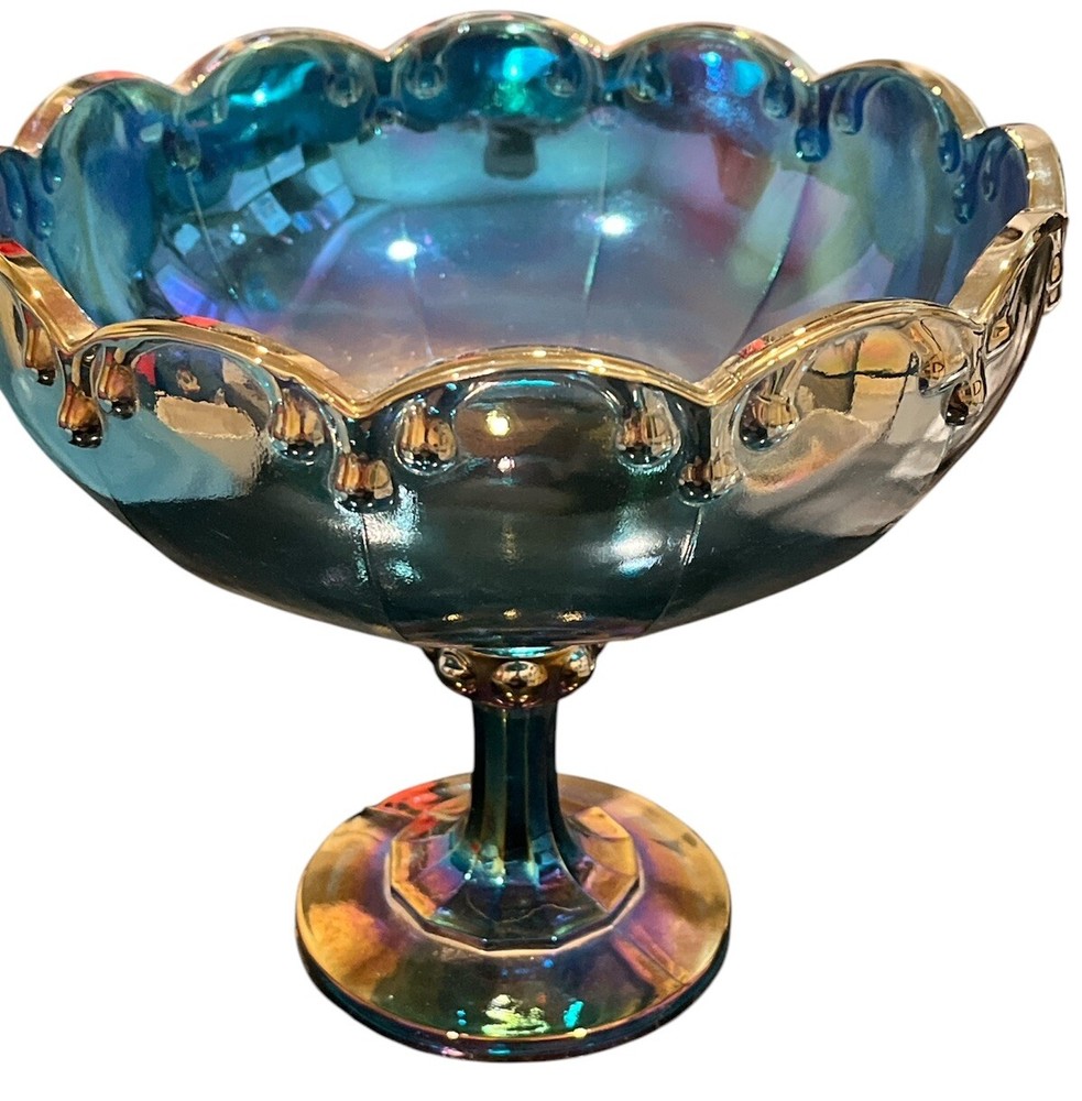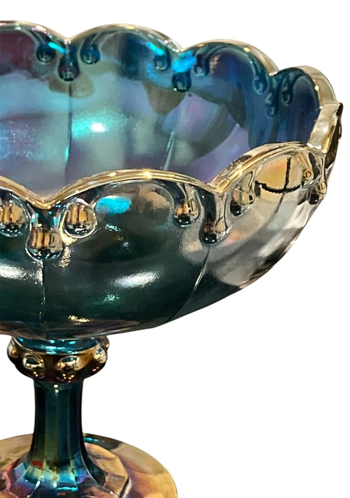 Vintage Indiana Glass Garland Blue Iridescent Carnival Glass Compote Fruit Bowl from America, circa 1975. This retro piece features a decorative teardrop pattern with a glossy finish, measuring 7.75 inches in height and diameter, and 9 inches in width. Handcrafted in the late 20th century, this unique bowl is perfect for all occasions and adds a touch of charm to any setting. Care instructions recommend hand washing to maintain its original beauty. Ideal for collectors or those looking to add a nostalgic touch to their home decor.