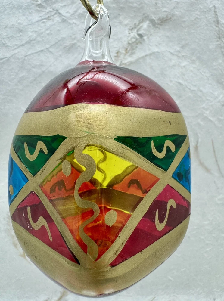 π Add a touch of vintage charm to your holiday decor with this handcrafted Italian glass Christmas ornament. π Featuring a unique stained glass style and hand-painted design, this medium-sized ornament measures 4.5" in height and 2.5" in width. π The diamond pattern and square shape make it a perfect addition to your Christmas collection. π Made from high-quality glass and produced using hand-blown techniques, this original vintage ornament is a true work of art. π The red and multicolored color and art nouveau style give it a holiday theme that will complement any Christmas tree. π This ornament is a must-have for collectors and those who appreciate handcrafted beauty. π Nice preowned vintage condition. No cracks or chips. π Please view photos for closer inspection and more details. Thanks for shopping π