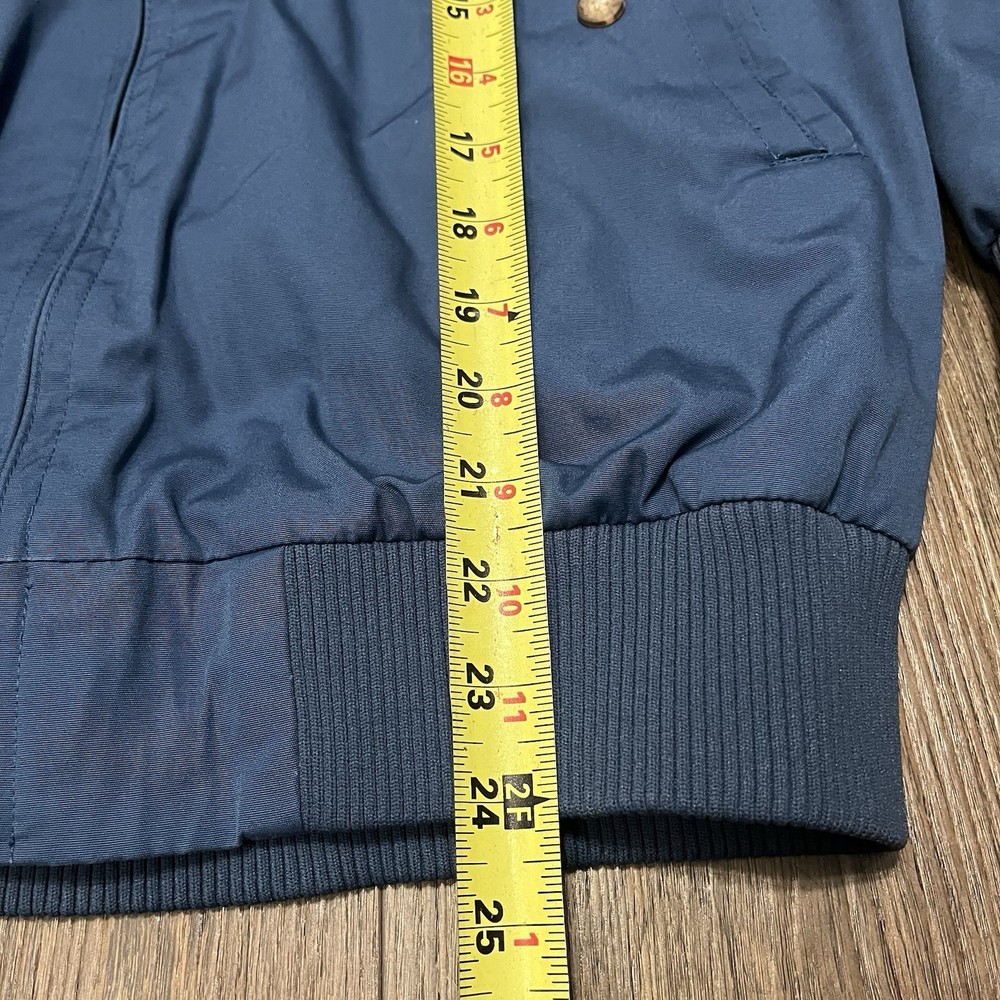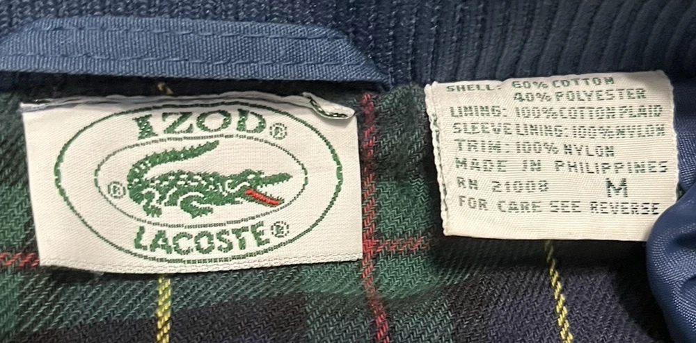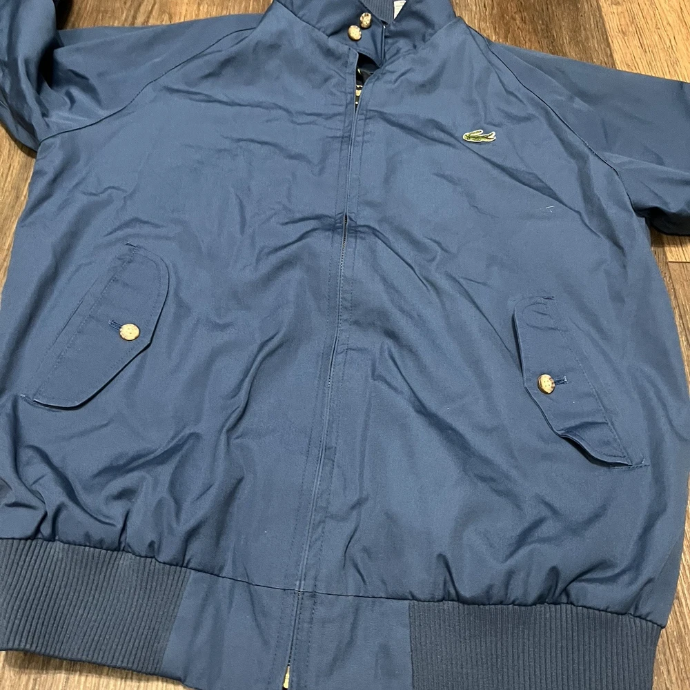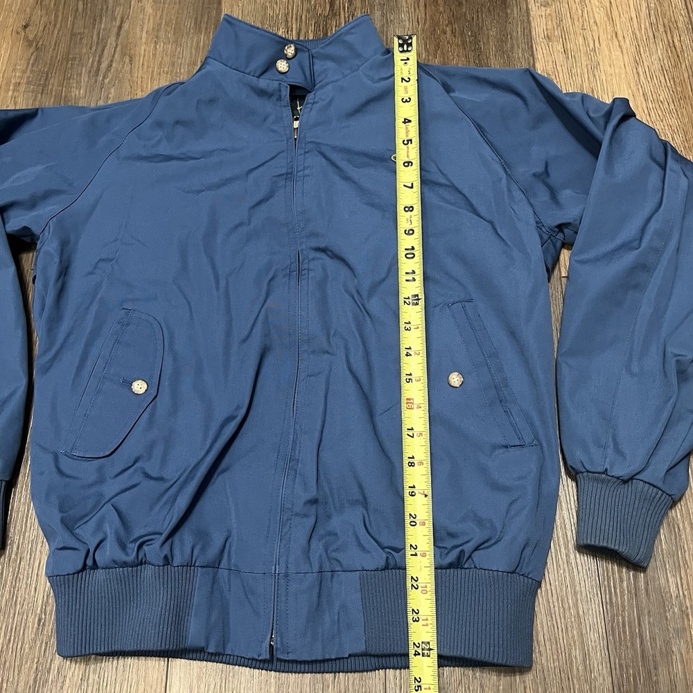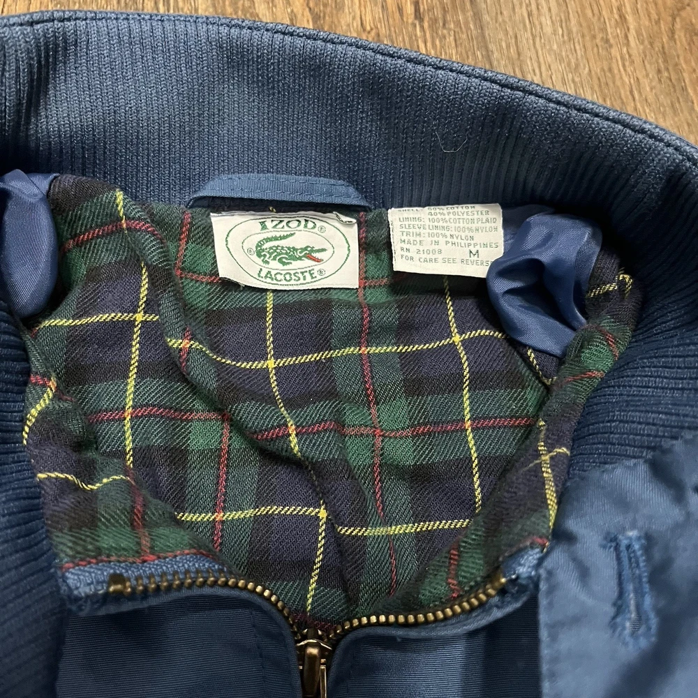 The VTG Izod Lacoste Blue Harrington Bomber Jacket is a vintage men's jacket featuring a classic fit with a stand-up collar and alligator logo accents. Made from a cotton blend outer shell with a cotton lining, this short-length jacket is perfect for various occasions including travel, parties, casual wear, and workwear. The retro 80s style in a blue plaid design adds a touch of nostalgia to this timeless piece, making it a stylish addition to any wardrobe. Machine washable for easy care, this jacket is a versatile and fashionable choice for any season.