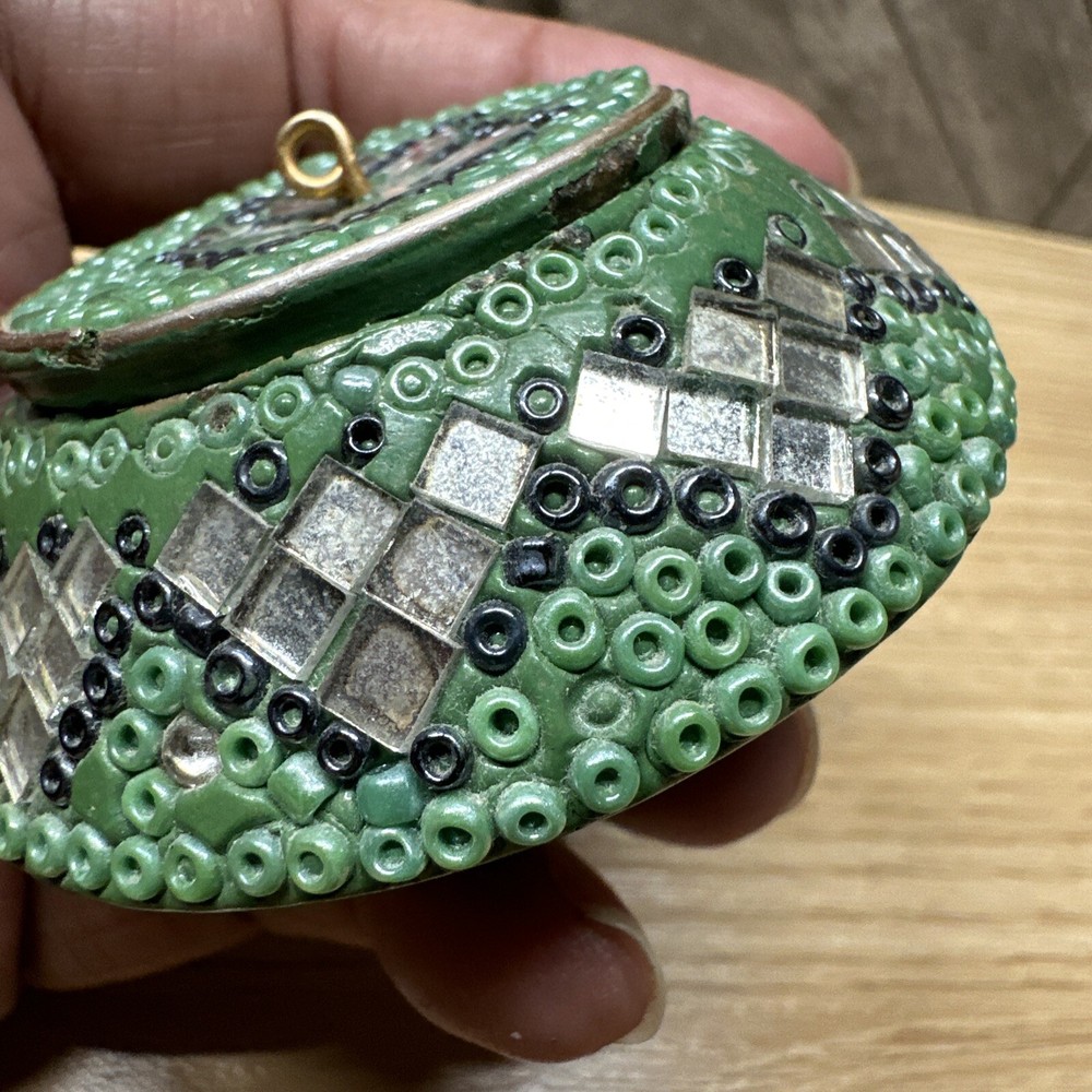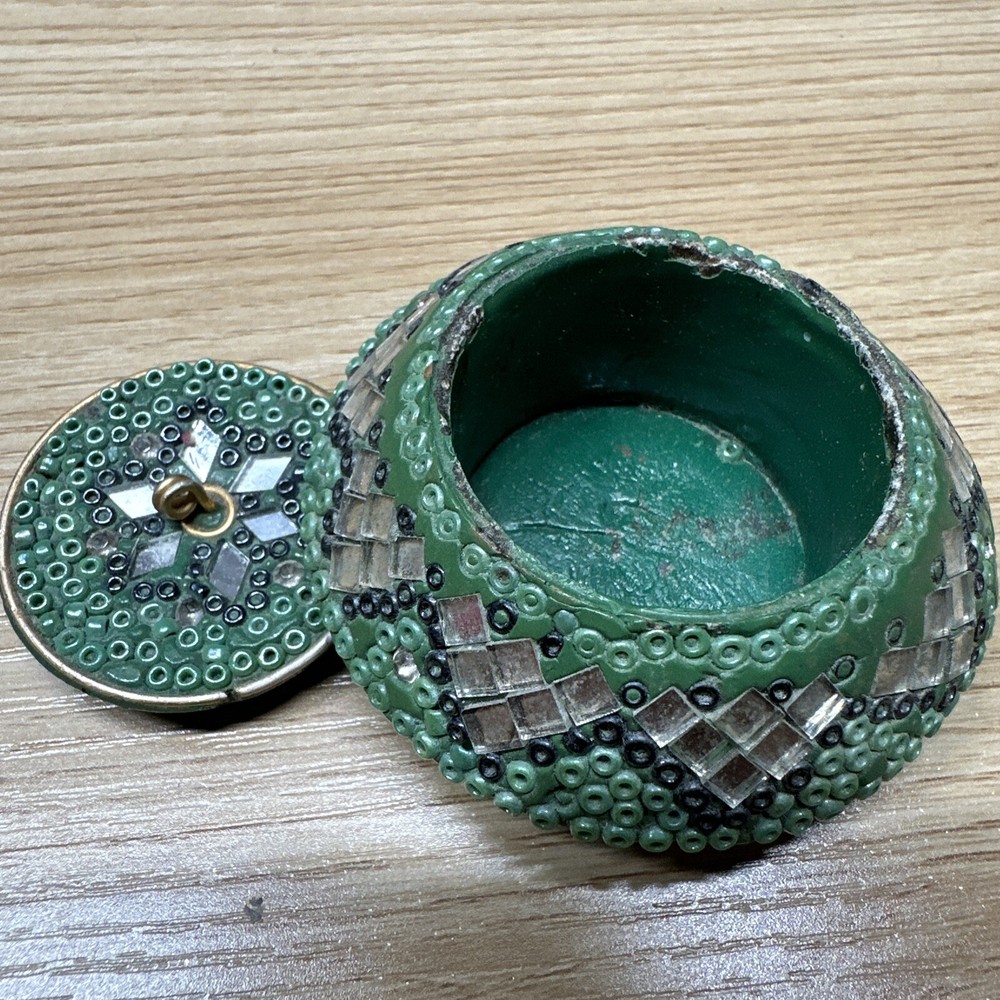 Features:BeadedTheme:TrinketCountry of Origin:IndiaFinish:Inlaid w beads/wireType:Trinket BoxColor:GreenDepartment:AdultsMaterial:lacquerShape:RoundBrand:UnbrandedSubject:Beads/Mirror