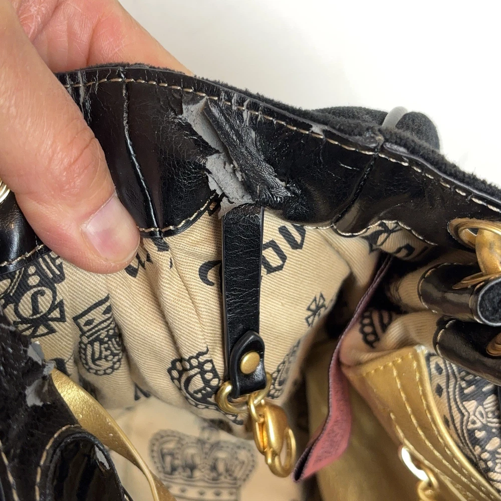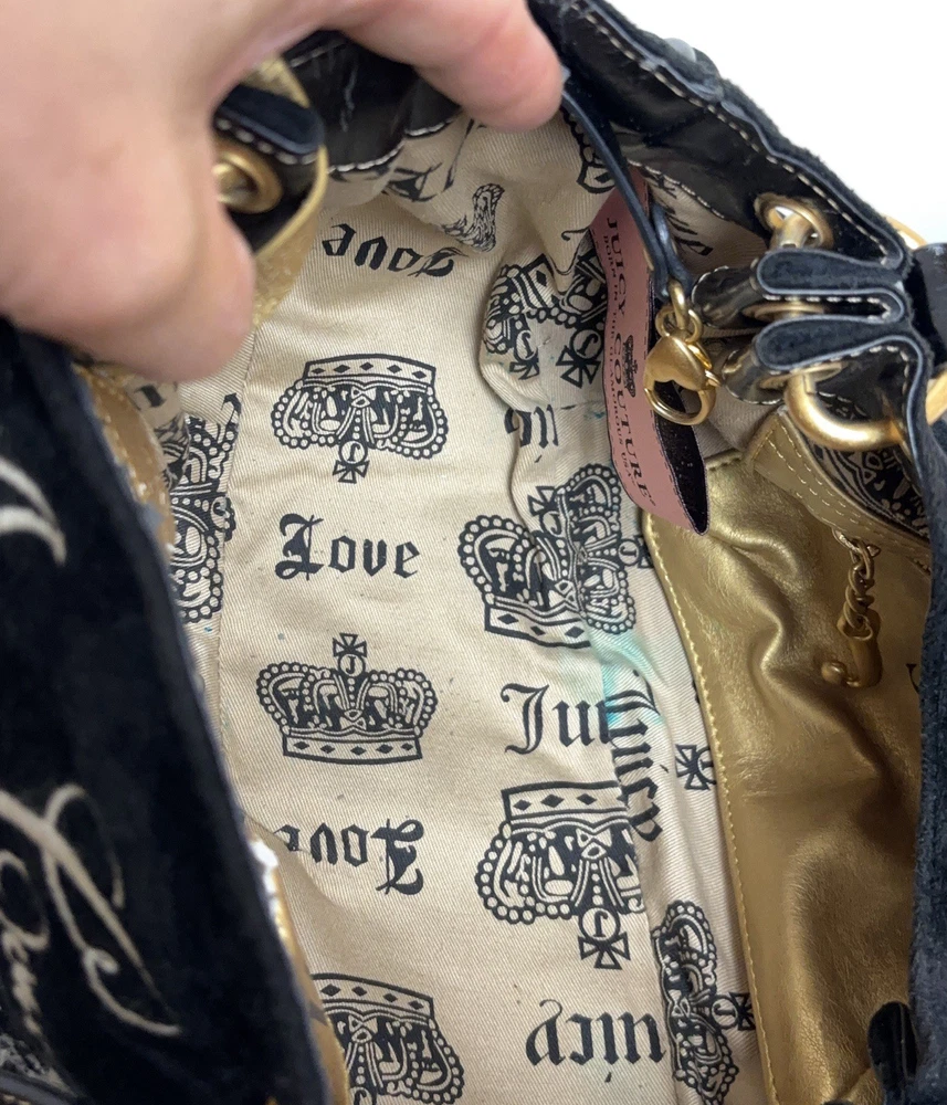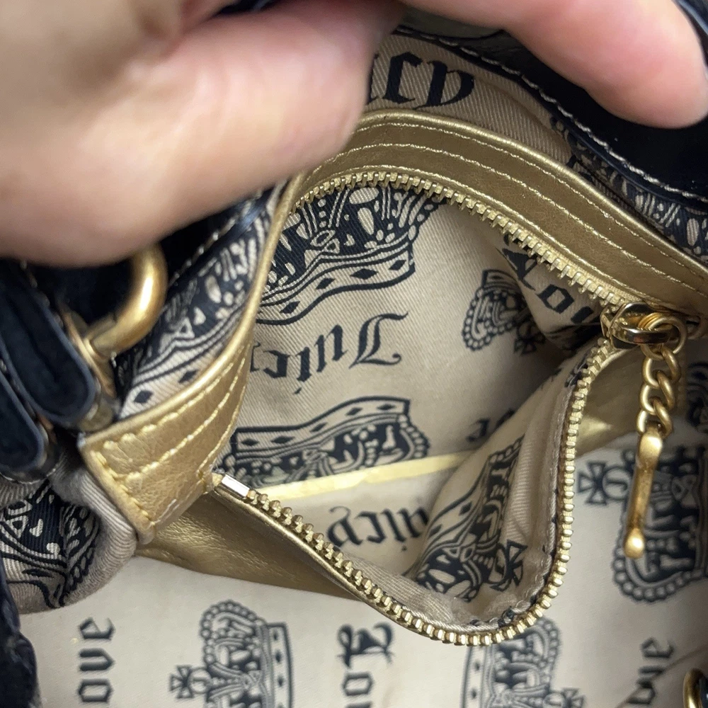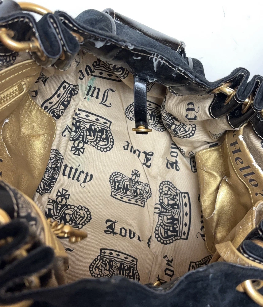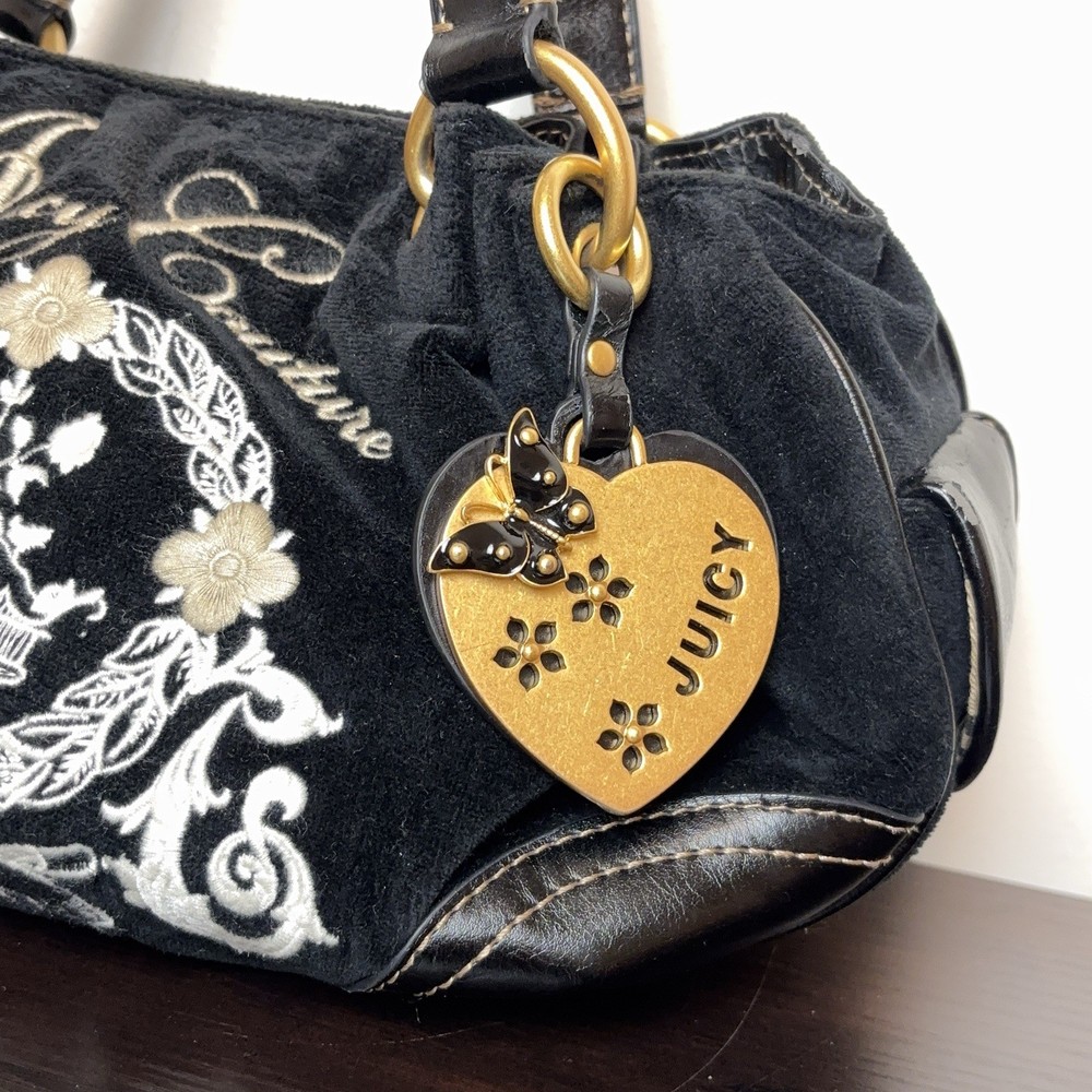 VTG Juicy Couture Daydreamer Bag Purse Tote Black Gold Charm Butterfly Heart Y2K Minor peel on one end and some peel on the black heart some inside on the ends see photos measures about 12x8x5 with handle drop of 8 inches has 2 end small outside pockets and inside are open and zip pockets there is gold butterfly charm with a black heart as backdrop couple gold tone key clips See photos Check out my store, 1000’s of vintage and collectibles items. Guarantee, Return, Shipping, and Tax Policies: We guarantee our products. We allow return or exchange. Unless STATED Otherwise Email us before sending it back to resolve any issues. Taxes for those US States that require them will be collected by eBay. International Buyers - please note: Import duties, taxes and charges are not included in the item price or shipping charges. Please check with your country's customs office before bidding/buying. Thank You!