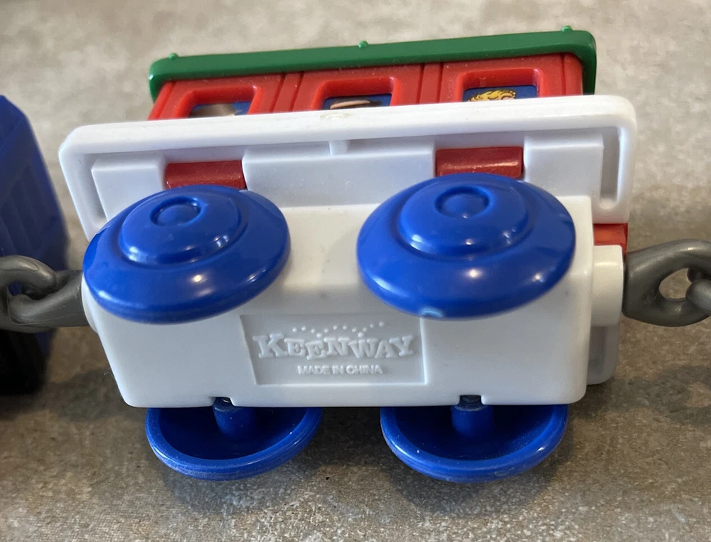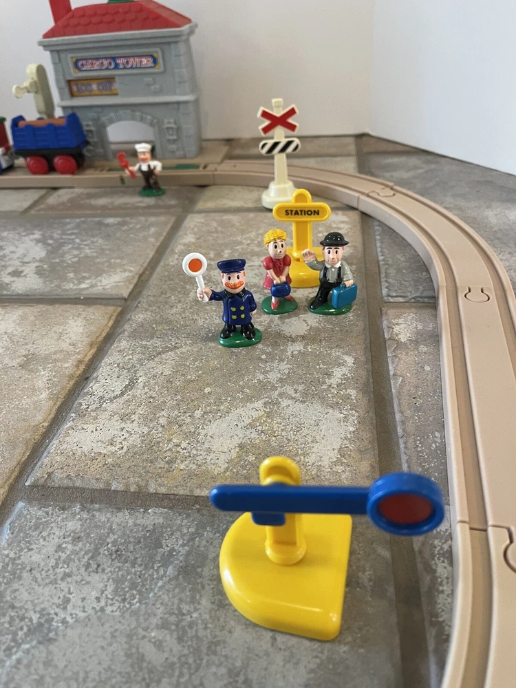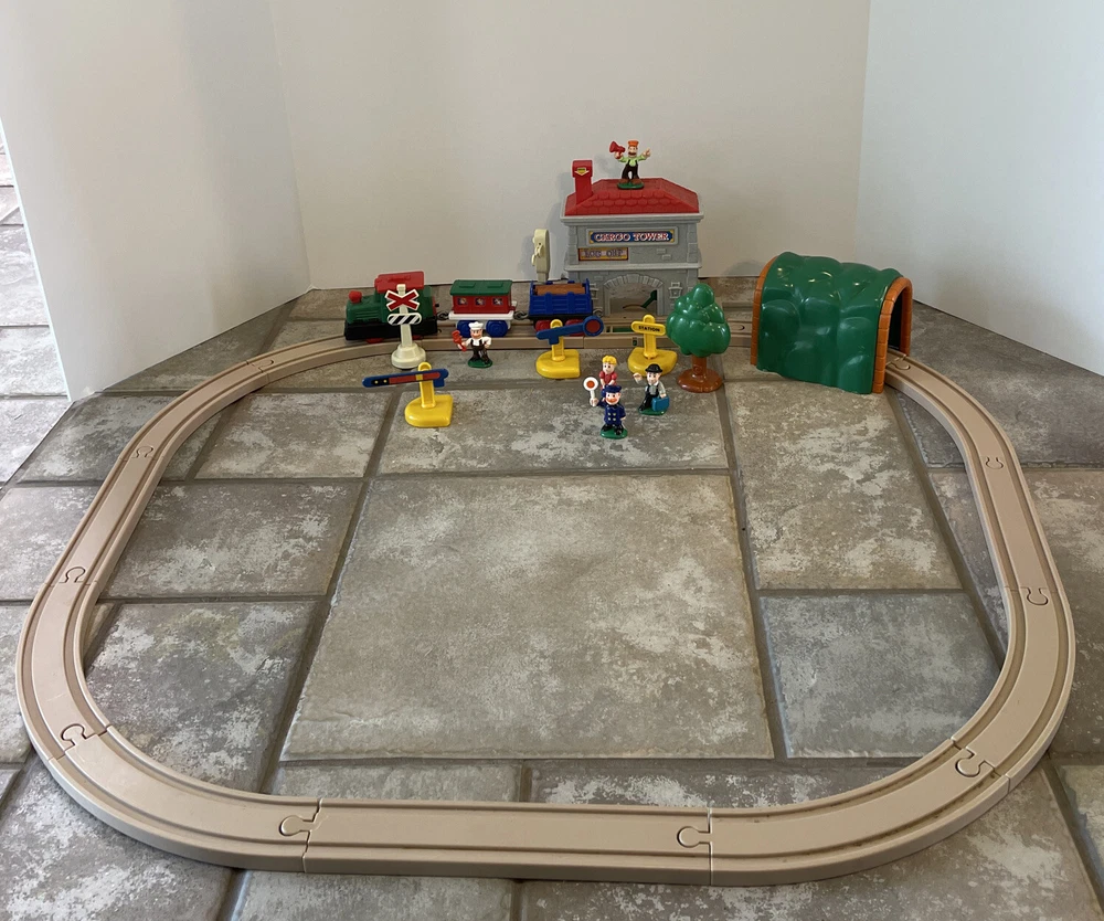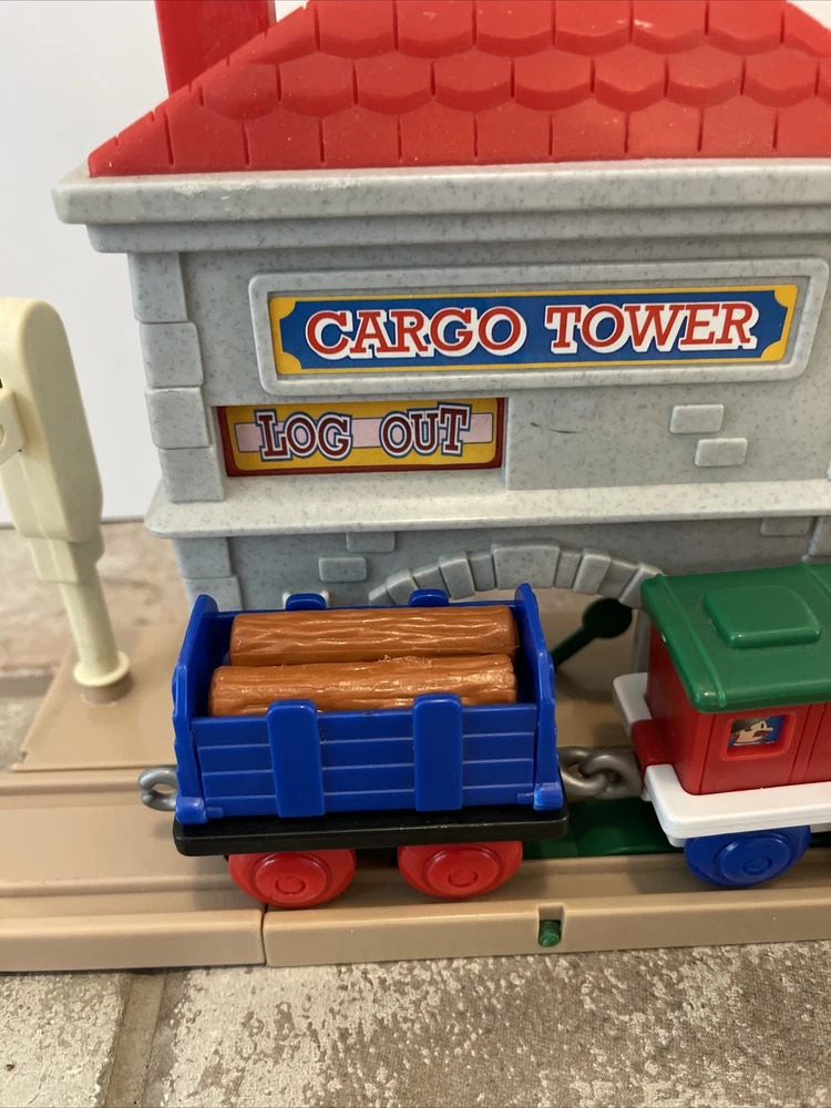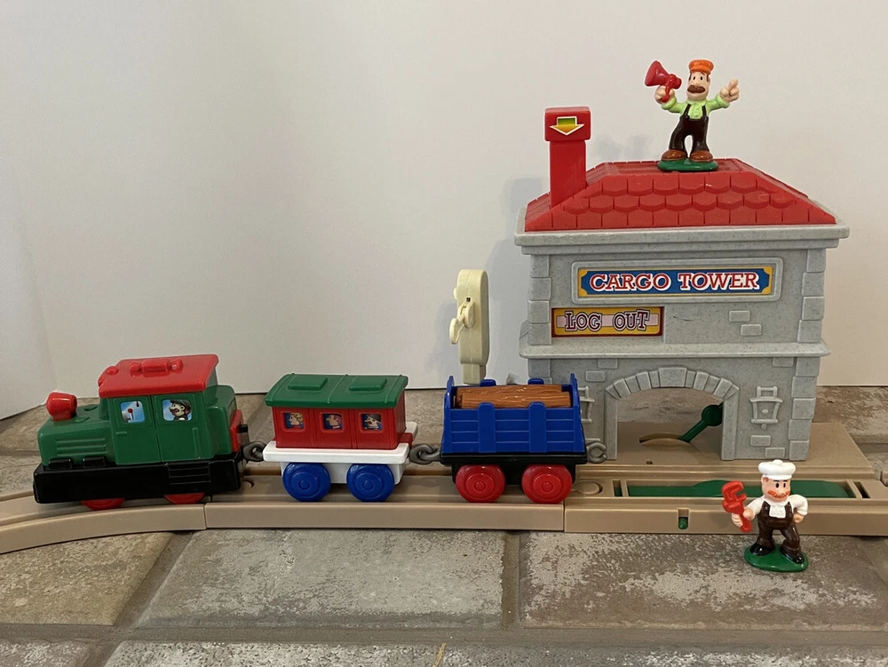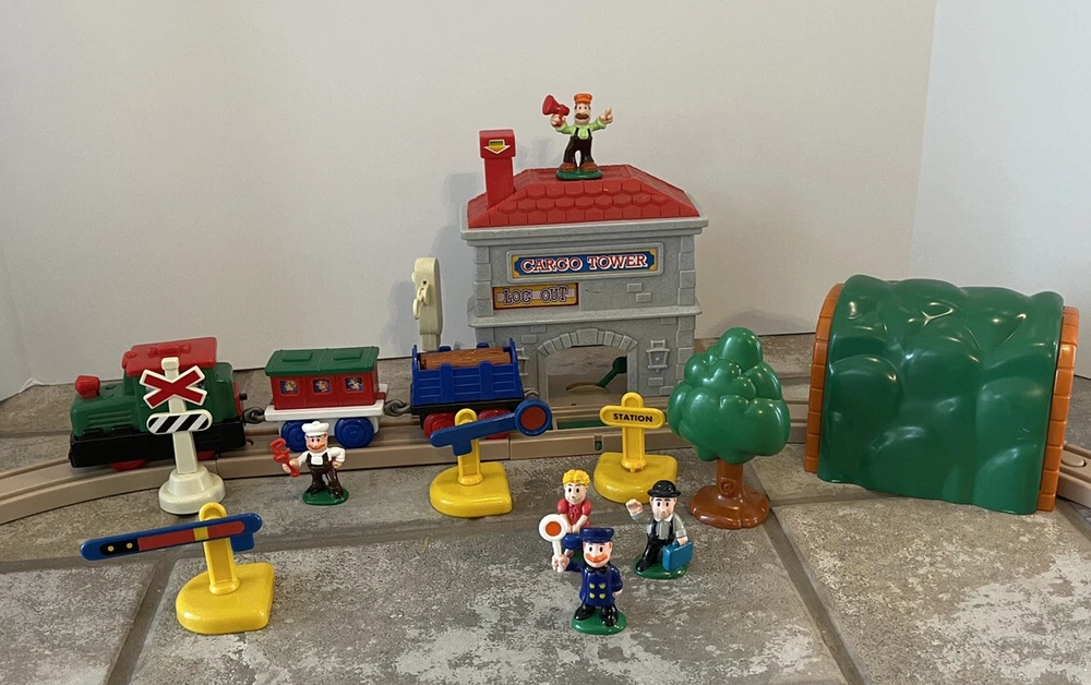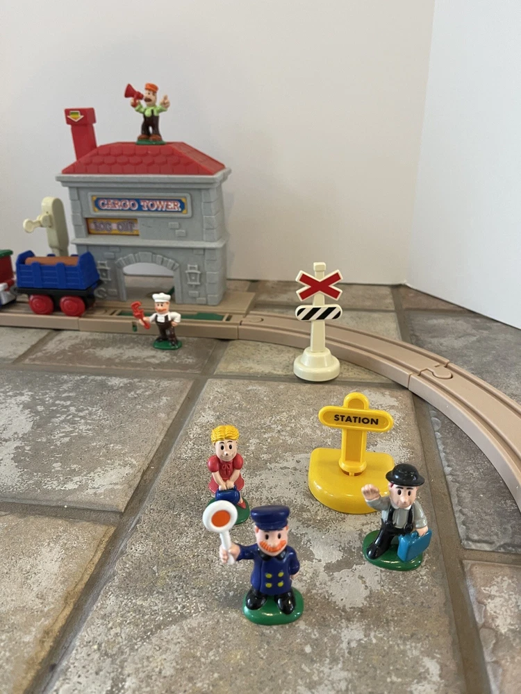 Vintage Keenway Plastic Train Track and People. Accessories included. Engine Works and pulls train! AA Battery included. Logs load in back of cargo tower and drop into train car when lever is pushed down. See last photo for alternate configuration using more track and pieces that are also included. Photos in this listing are helpful in set up. See Video in photos 37 pieces 19 pieces of track 1 cargo tower 5 people 1 engine and 2 train cars 1 red bridge with removable yellow sides. Train will only go one direction on this bridge. 4 signs 2 logs 1 tunnel 1 tree Please see photos for more details as they are considered part of the description. Smoke free home I ship quickly and am happy to combine shipping for multiple purchases. Add items to your cart and "request total", then I will send an invoice with combined shipping Questions are welcome and encouraged. Check out my ebay store for more great treasures!