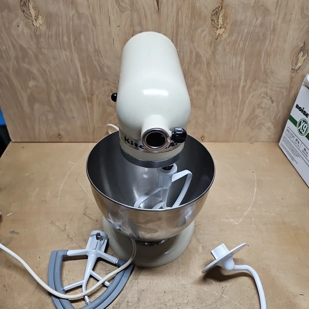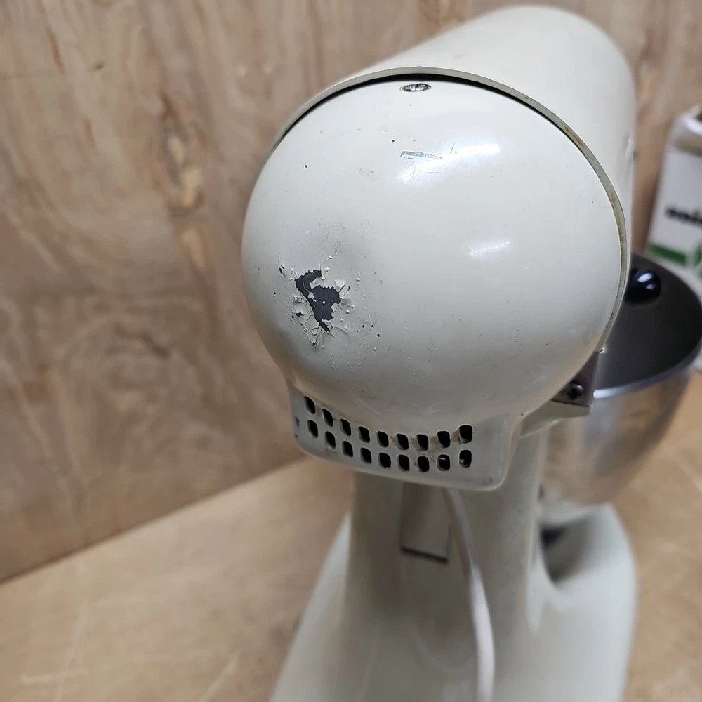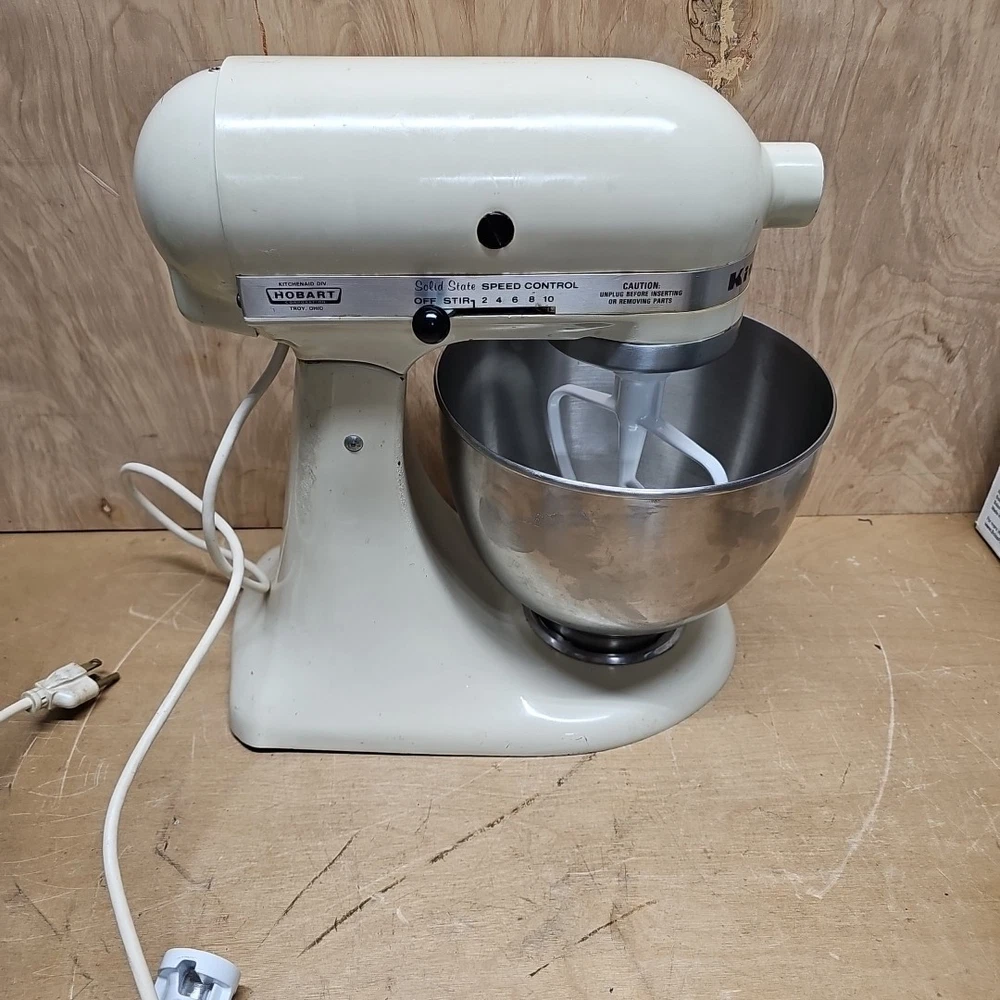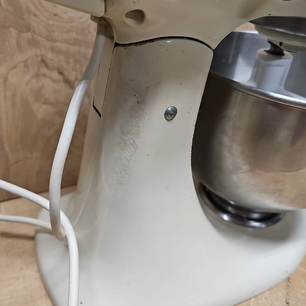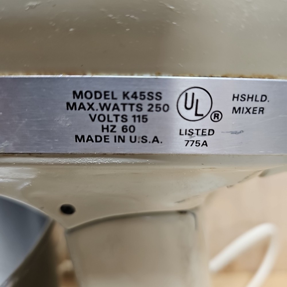 Regreased and cleaned inside prior to listing. It works well. The VTG KitchenAid Hobart Model K45SS Stand Mixer in Cream with Bowl & Attachments is a powerful electric mixer with a 250W motor and 10 different speeds. It features a stainless steel bowl, wire whip, dough hook, beater, and instruction manual, making it a versatile and comprehensive kitchen appliance. This model, manufactured in the United States, stands at 14 inches tall with a diameter of 8.75 inches and a depth of 13.5 inches, providing ample space for mixing various ingredients. Ideal for baking, kneading dough, whipping cream, and much more, this standalone mixer is a reliable and essential addition to any home kitchen.