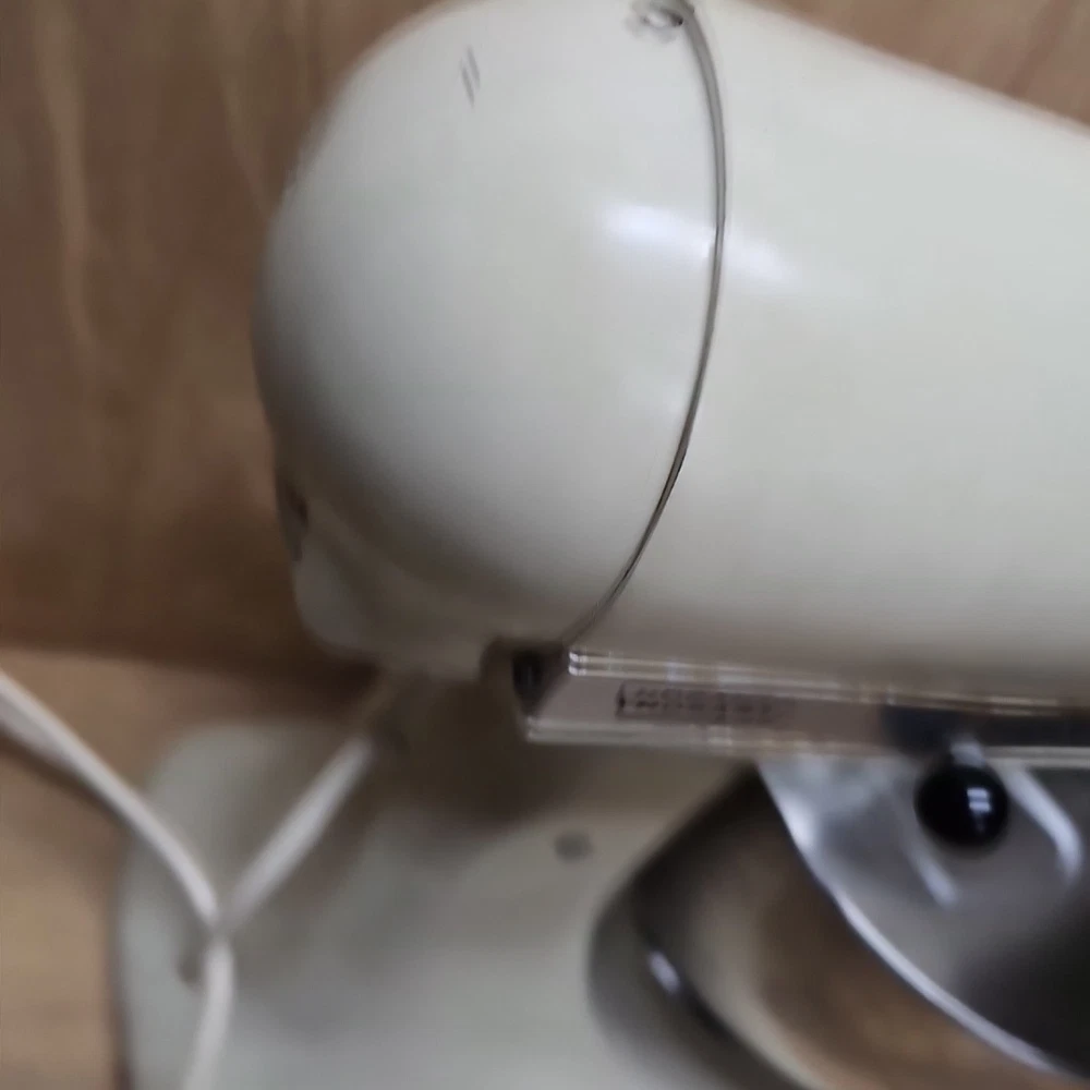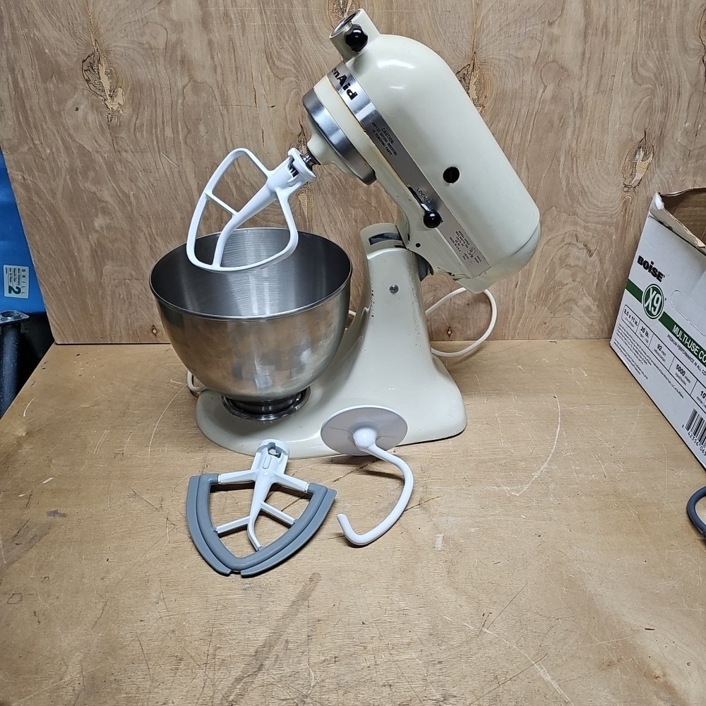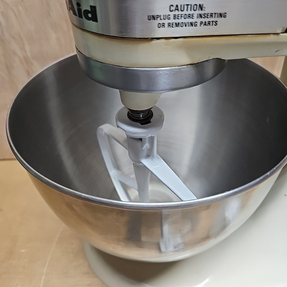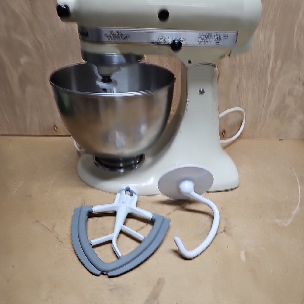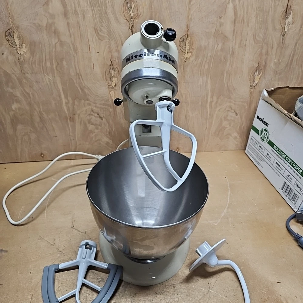 Regreased and cleaned inside prior to listing. It works well. The VTG KitchenAid Hobart Model K45SS Stand Mixer in Cream with Bowl & Attachments is a powerful electric mixer with a 250W motor and 10 different speeds. It features a stainless steel bowl, wire whip, dough hook, beater, and instruction manual, making it a versatile and comprehensive kitchen appliance. This model, manufactured in the United States, stands at 14 inches tall with a diameter of 8.75 inches and a depth of 13.5 inches, providing ample space for mixing various ingredients. Ideal for baking, kneading dough, whipping cream, and much more, this standalone mixer is a reliable and essential addition to any home kitchen.