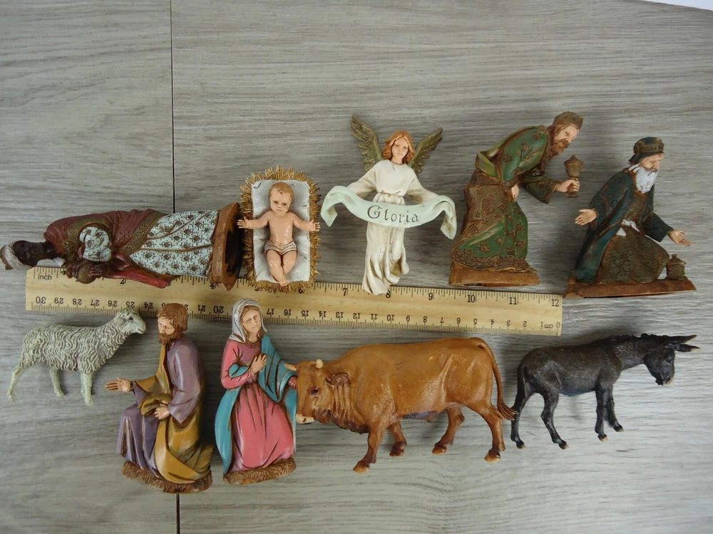 VTG Landi 10 pc. Nativity Figures Christmas Holiday Decoration Made In Italy There is a piece of "straw" on the side of the manger that is broken. There is a bit broken off of the base of one of the wisemen. These are both shown up close and pointed out in the pictures.