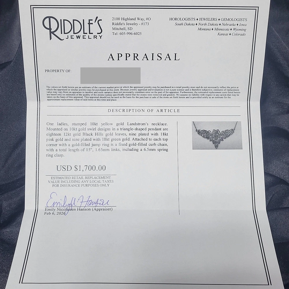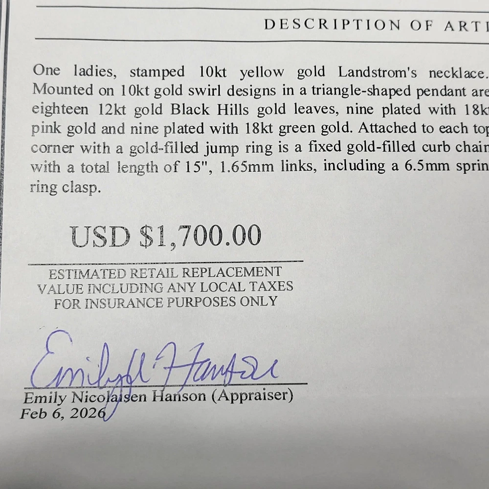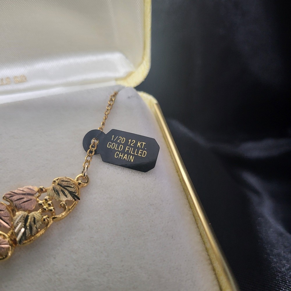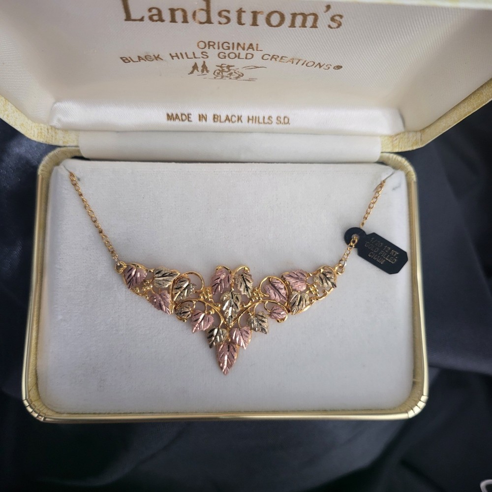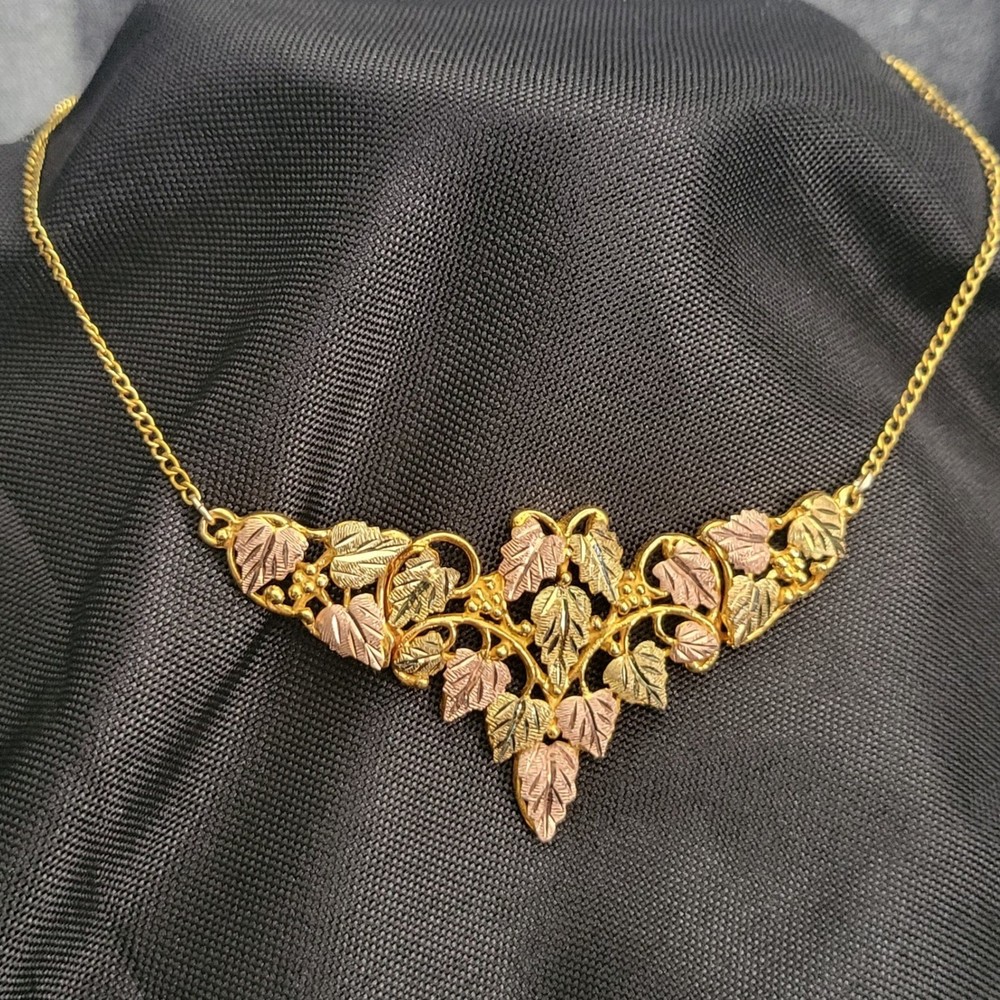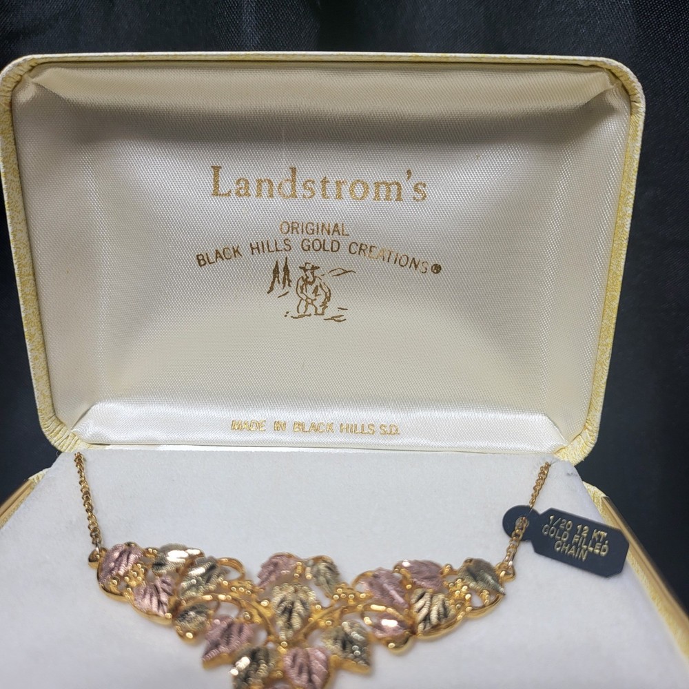 VTG Landstrom's Black Hills Gold necklace features a stunning triangle-shaped pendant mounted on 10kt yellow gold swirl designs. The intricate centerpiece showcases eighteen 12kt gold leaves, with nine plated in 18kt pink gold and nine in 18kt green gold for a classic tricolor aesthetic. A fixed 1/20 12kt gold-filled curb chain with a spring ring clasp completes this authentic South Dakota creation. This piece comes with its original presentation box and a professional appraisal document. Measurements: • Total Length: 15" • Link Width: 1.65mm • Clasp Size: 6.5mm Brand: Landstrom's Origin: Made in Black Hills, S.D. Pendant Material: 10k Yellow Gold Leaf Material: 12k Gold Leaf Plating: 18k Pink Gold, 18k Green Gold Chain Type: Curb Chain Chain Material: 1/20 12k Gold Filled Pendant Shape: Triangle / V-Shape Design: Grape Leaves and Swirls Closure: Spring Ring Appraisal Value: $1,700.00 Style: Traditional Black Hills Gold Keywords: Southwestern, Tricolor Gold, Vintage Aesthetic, Nature Inspired, Botanical, Heirloom, Fine Jewelry, South Dakota, Handcrafted, Foliage, Boho Chic, Luxury Gift, Statement Necklace • We ship within one business day. • Please compare the measurements to something you already own. Thank you for supporting our small business!
