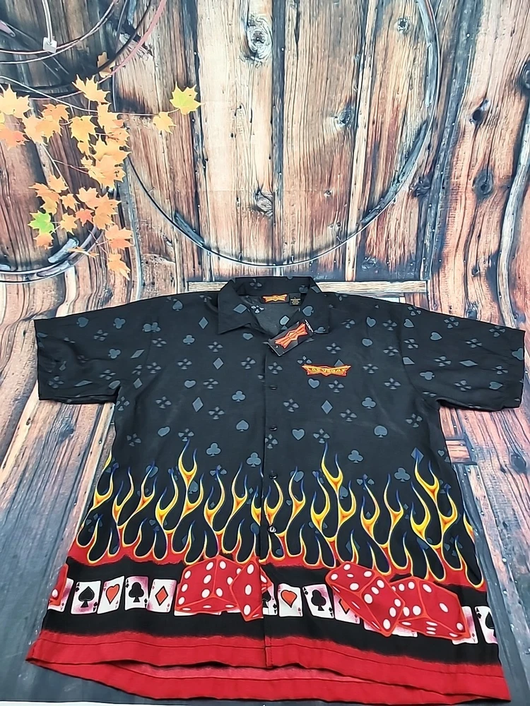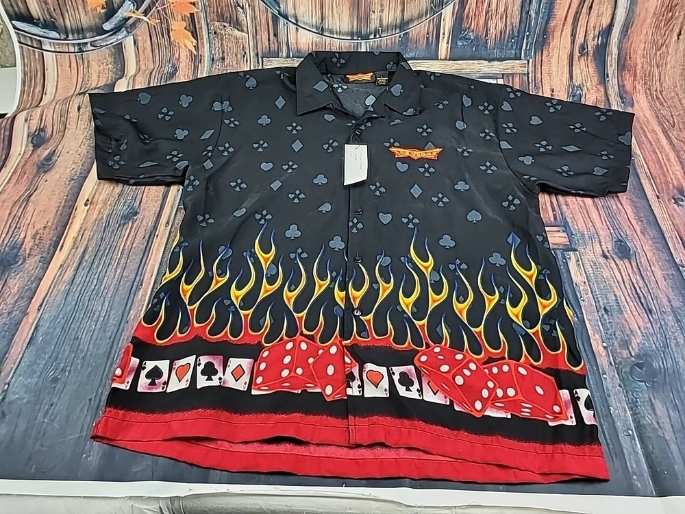 Get ready to rock the 90s style with this vintage Las Vegas shirt from discount custom apparel. The shirt features a solid pattern with short sleeves and a collared neckline with button closure. The oversized, all-season shirt is made of breathable polyester fabric with a woven texture and flame-themed graphic print. Perfect for casual occasions, this shirt is available in size L with a regular fit and spread collar style. The shirt is easy to care for and has accents of buttons with a retro theme of grunge and fire. This shirt is a must-have for any fashion-forward men's wardrobe.