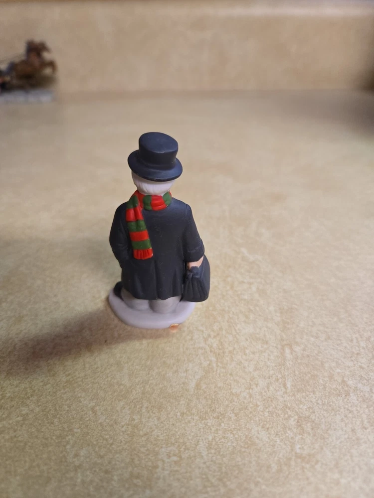 This is a vintage Lefton collectible figurine from the Snow Village collection, manufactured in 1990. It features Doc Mitchell, a doctor, in a Colonial style. The figurine is multicolored, made of ceramic & porcelain, hand-painted, and suitable for Christmas village collections. It measures 1 1/2 x 1 x 2 3/4 inches. The brand is Lefton, and it is an original piece from the 1990s. Perfect condition
