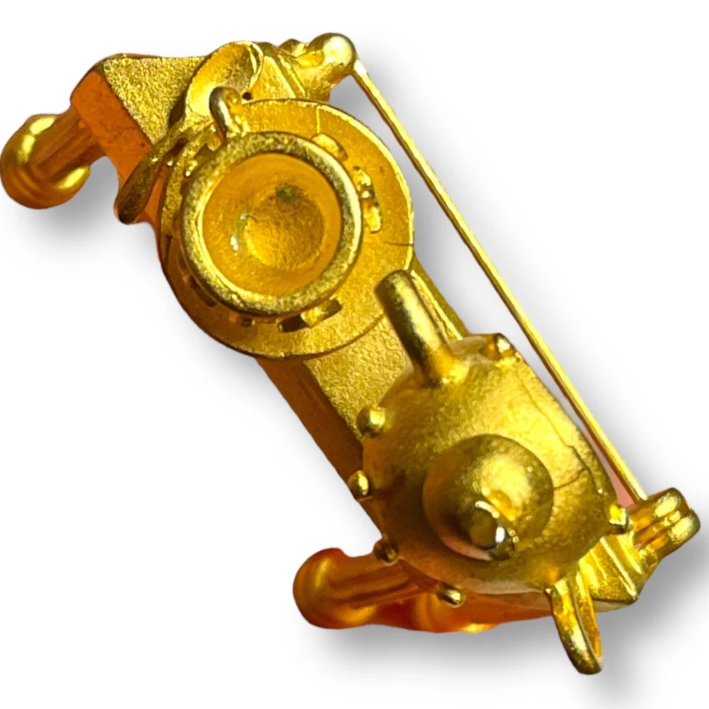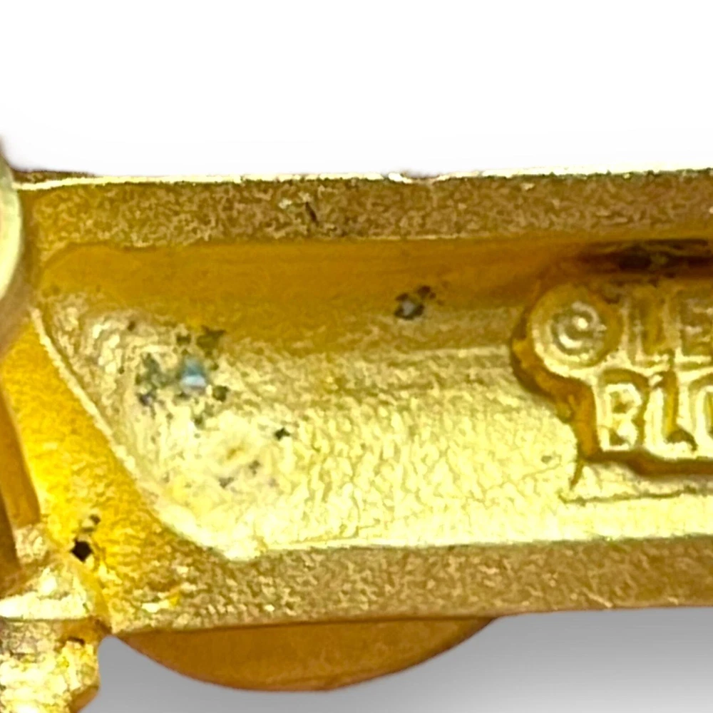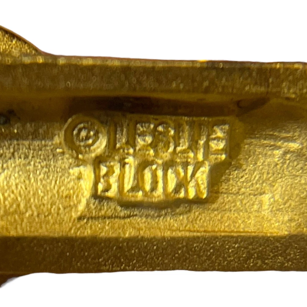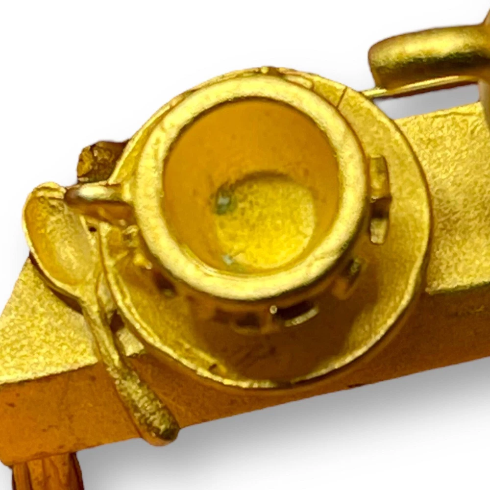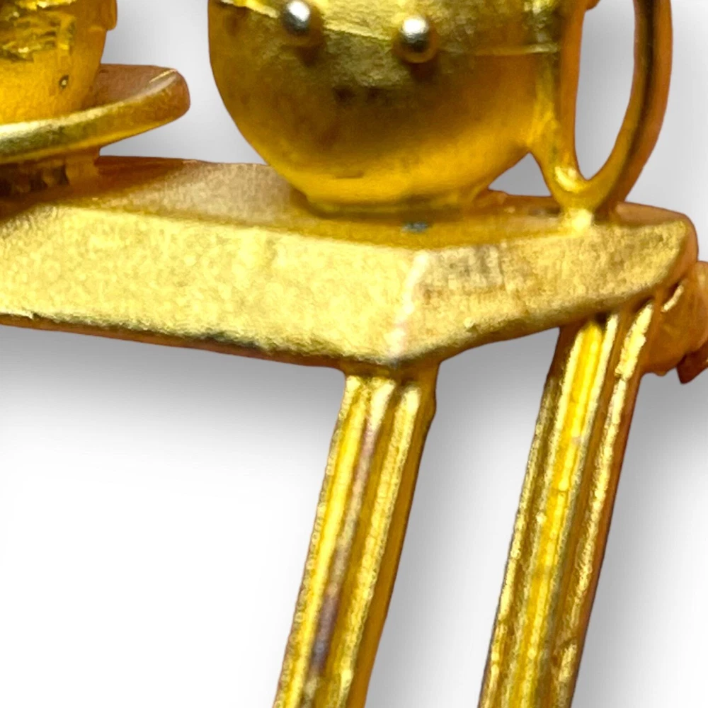 Leslie Block Vintage Gold Tone Tea Set on Table Whimsical Kitschy Signed Brooch Give your next outfit a timeless look with this beautiful vintage brooch from Leslie Block. Crafted with signature detail and precision, this classic gold-tone tea set features delicate details that stand out. The piece is designed with opulence and elegance and is sure to add class and sophistication to your wardrobe. Make a statement with this vintage masterpiece. The brooch is in great vintage condition and ready to wear. It only has a bit of tarnish in the tea cup and underside of the brooch, and a bit of smoothing of the brush finish on the table. See photos for details.