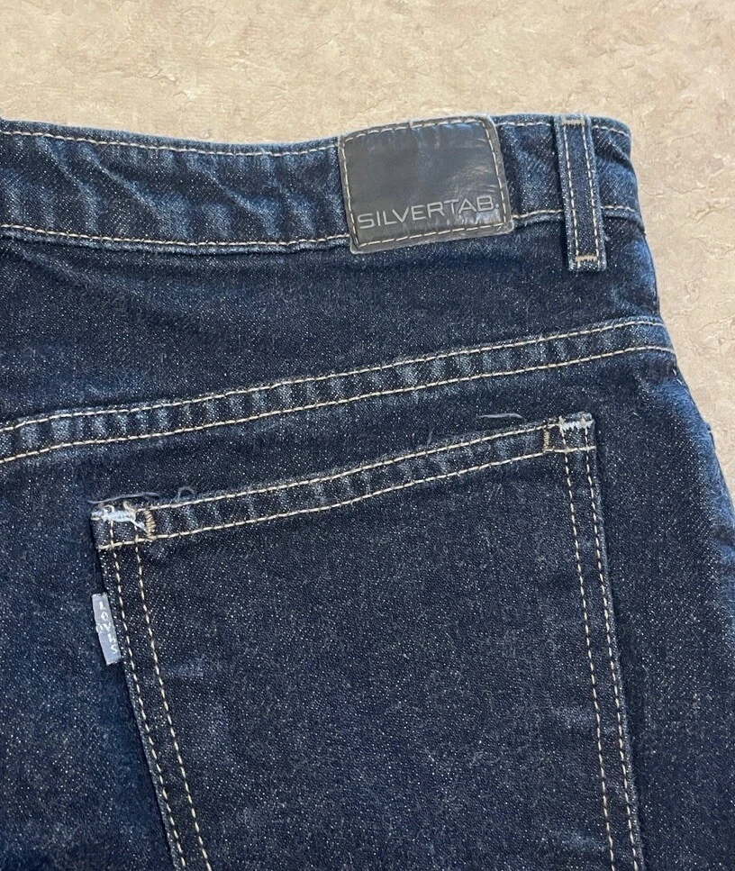 This vintage Levi's Silver Tab denim skirt is a unique addition to any wardrobe. The dark wash and solid pattern make it a versatile piece, while the high rise and cutoff features give it a stylish edge. Made from cotton denim fabric, this mini skirt is both comfortable and durable. The skirt is a size medium and features a metal theme, with Levi's branding on the back pocket. It has a unit quantity of 1 and is made in Guatemala. This skirt is perfect for anyone looking for a statement piece that can be dressed up or down. This skirt is in good preowned condition, with little sign of wear. Please see ALL photos for a better idea on condition, any measurements, or details to the skirt.