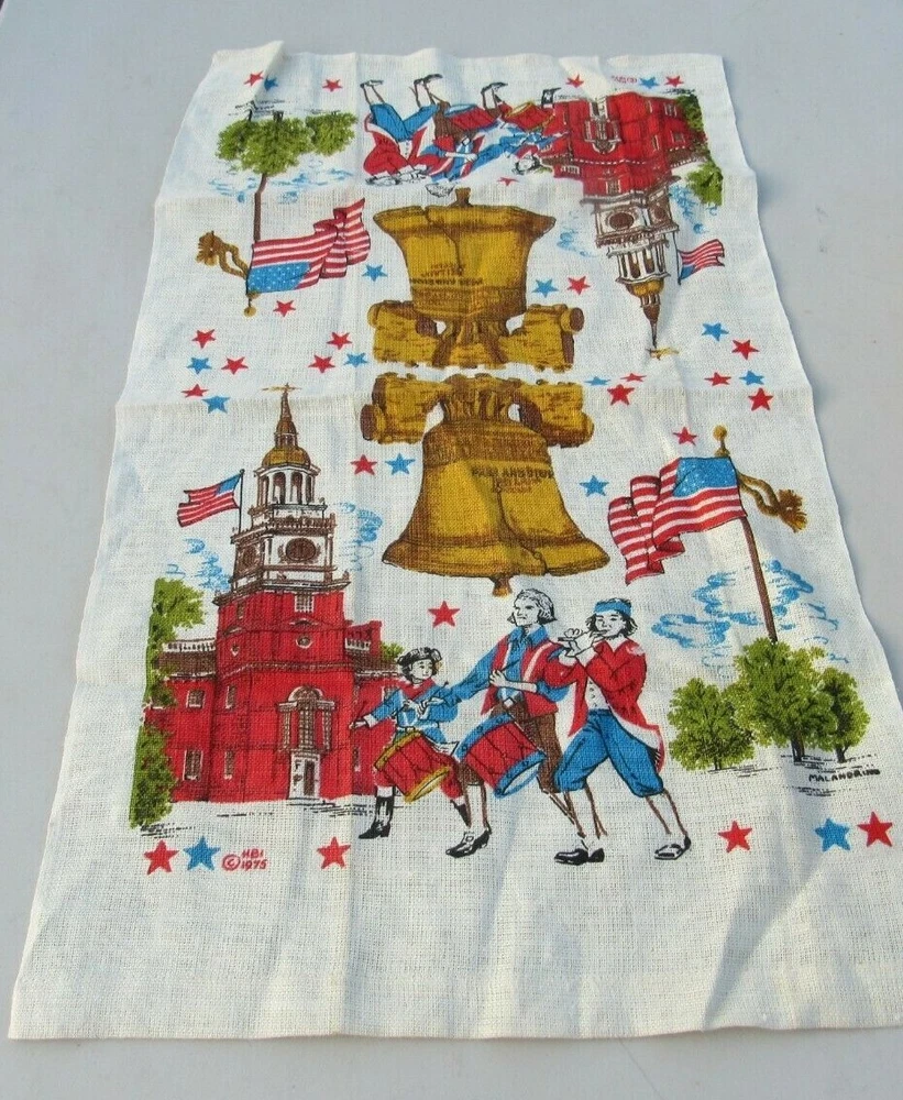 VTG Liberty Bell Linen Towel Patriot Minute Man Drum and Fife American Flag 1975 I believe that this was made to celebrate the Centennial Celebration that would have been in 1976
