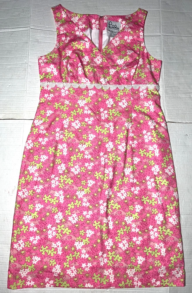 Vintage Lilly Pulitzer Happy Hippos Pink White Green Lace V-Neck Sleeveless Shift Summer Dress ~ Women's Size 8. Measures: 18" flat across the front from underarm to underarm unstretched and 37" from shoulder to bottom hem.