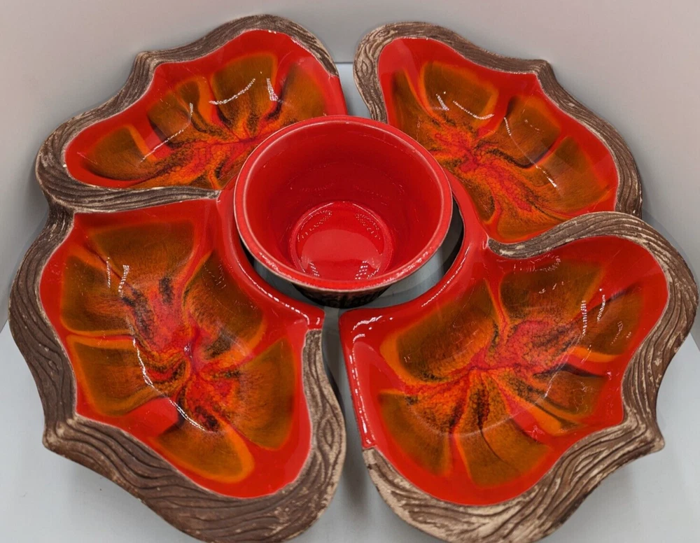 VTG MCM California Pottery Sequoia Ware 4 Pc Chip & Dip Condiment Tray 12" READ. There are no chips or cracks. There are however, some paint chips and paint wear on the outside of the pieces. Please see the photos for a more accurate description. The inside glaze of the pieces is in excellent shape with no scratches or wear that I can see. All of my items are carefully packed for shipping, no matter their value - $5 items are wrapped with the same care as a $200 item. My goal is to have your purchase arrive safely. I use recycled packaging when possible but mostly use new, high-quality products so your item will arrive intact without damage. Large, heavy and fragile items are harder to use combined shipping with but just ask if you would like to purchase more than one item and I am more than happy to do so if feasible. If not, maybe we can work out a shipping discount. Measurements are approximate or as close as I can get. Also, the color you see many not be the exact color depending on your computer or phone settings. I do my best to make sure that the colors look as accurate as possible on my end. Please note that I offer Priority Mail as well as Ground Advantage on most items. Check the pricing to see which you prefer. Thank you and hopefully you will visit my store again!