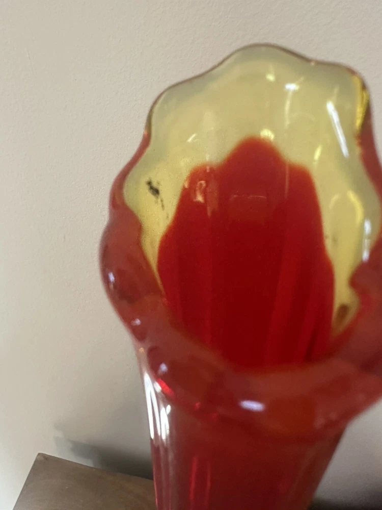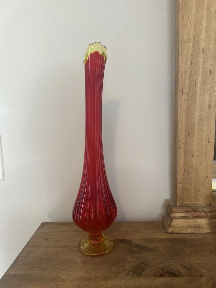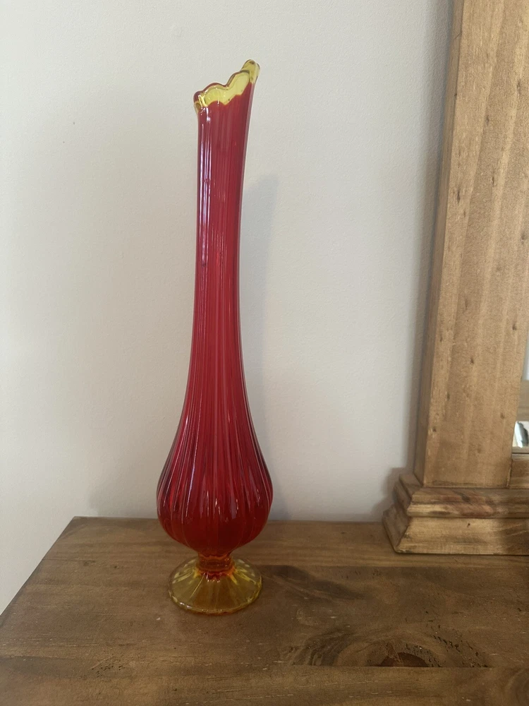 Elevate your home decor with the striking VTG MCM LE Smith 15.5” Amberina Swung Stretch Ribbed Glass Vase. A true representation of Mid-Century Modern style, this vase boasts an eye-catching amberina color that ranges from warm red to vibrant orange, capturing the essence of a bygone era. Crafted from hand-blown glass, its textured, high-gloss surface and ribbed pattern add a touch of abstract art to any room. This decorative piece, originating from the United States in 1953, is a testament to the skillful production techniques of the time. It stands as an original, unmodified treasure from the 1960-1969 period, complete with the artistic nuances that enthusiasts of MCM appreciate. Whether displayed alone or as part of a curated collection, this vase is sure to be a conversation starter. No chips or cracks. Has a black mark inside the glass as shown