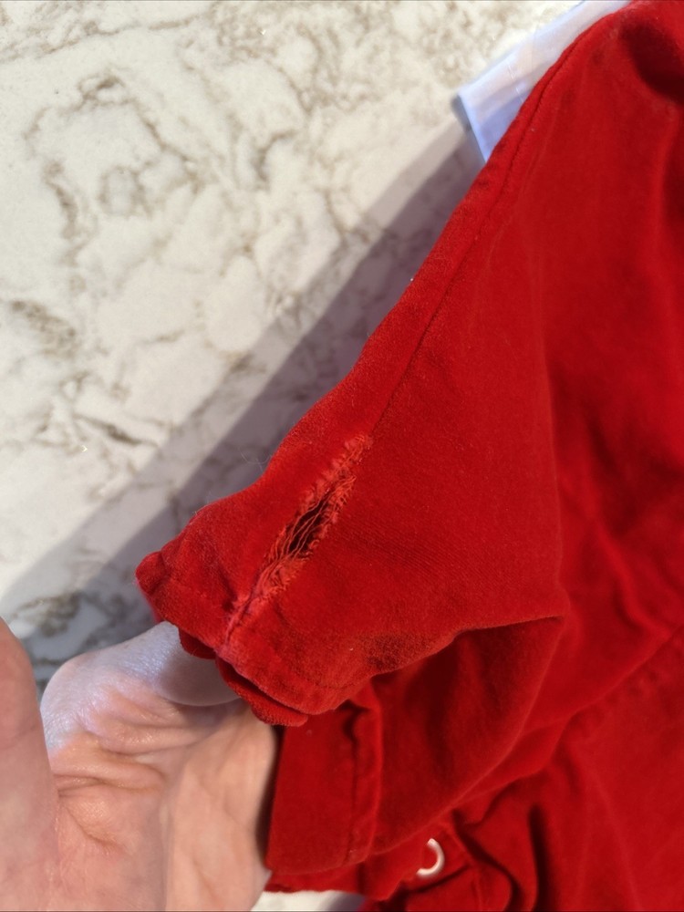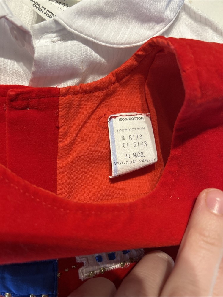 Very cutevintage Christmas overalls 24 months for a girl or boy Small tear on bottom right of overalls.