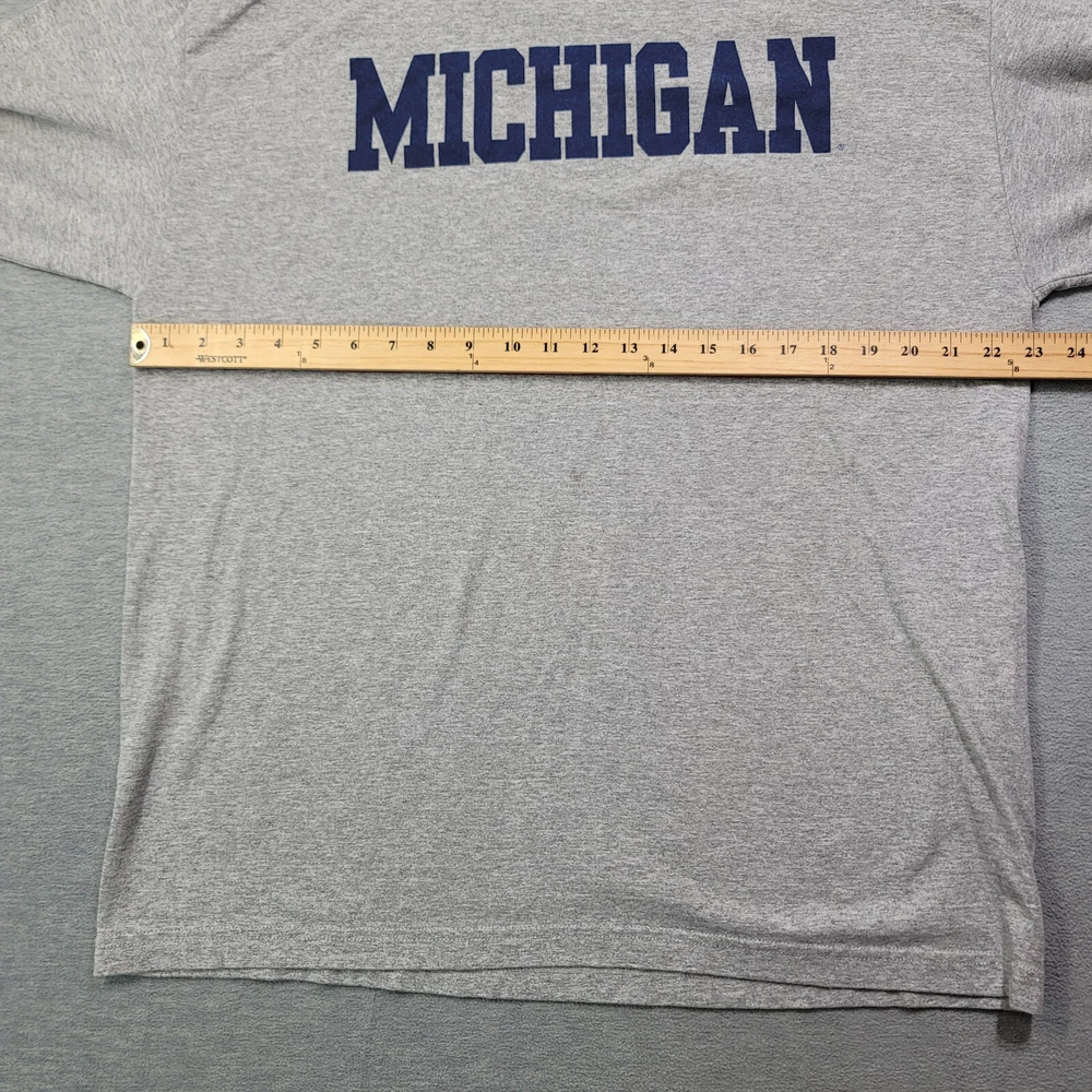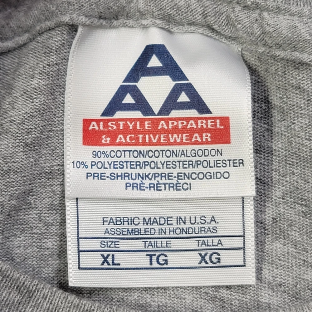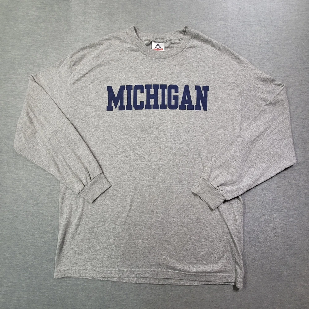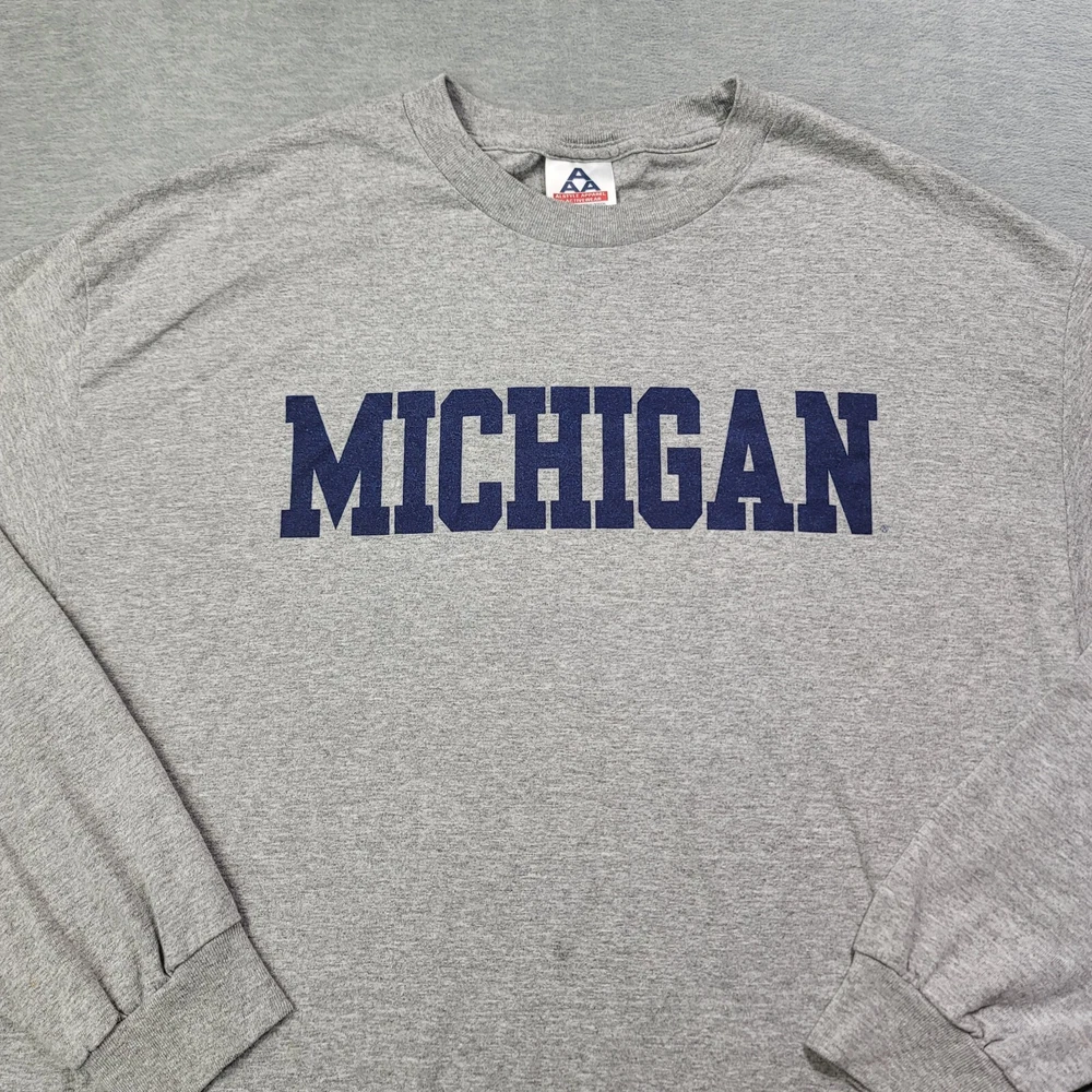 Show off your school spirit with this vintage Michigan University T-shirt from Alstyle Apparel & Activewear. The gray shirt features a solid pattern with the Wolverines logo on the front, spelling out the college name in bold letters. The long sleeve, round neck shirt is made of a comfortable blend of polyester and cotton, ensuring a regular fit all day long. Perfect for any fan of the Wolverines, this shirt is available in size XL and is ideal for casual wear or game day. The shirt is sure to be a hit with anyone who sees it, so don't miss out on the chance to show off your school pride in style.