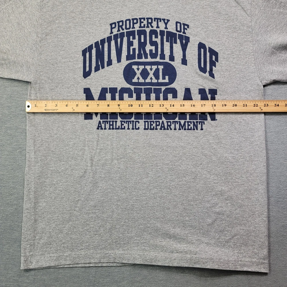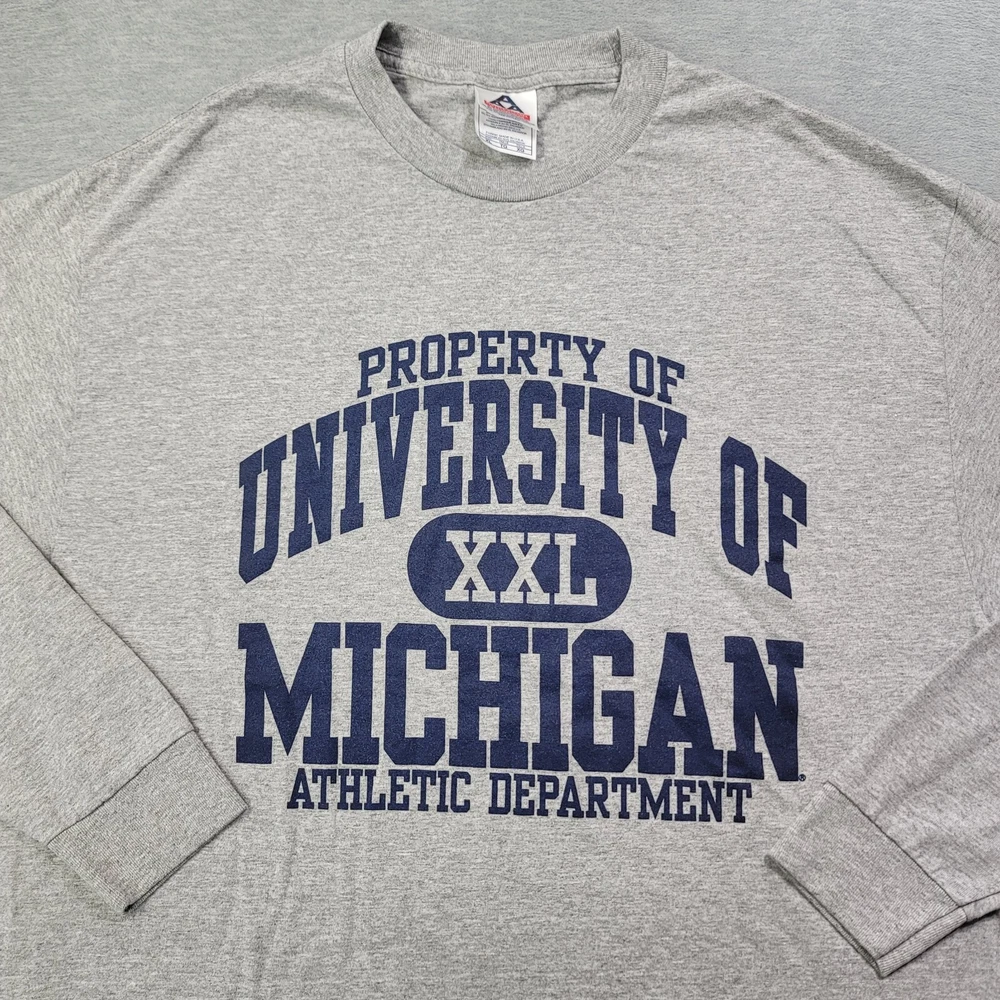 Show your school spirit with this vintage Michigan University T-shirt. The gray, solid shirt features the school's logo and name spelled out in bold letters. The long-sleeved shirt is made of a comfortable blend of polyester and cotton, ensuring that you stay cool and comfortable all day long. The regular-fit shirt is designed for men and is available in size XL. The crew neckline and classic design make it perfect for wearing to games or around town. This T-shirt is a must-have for any college fan and is sure to make a statement.