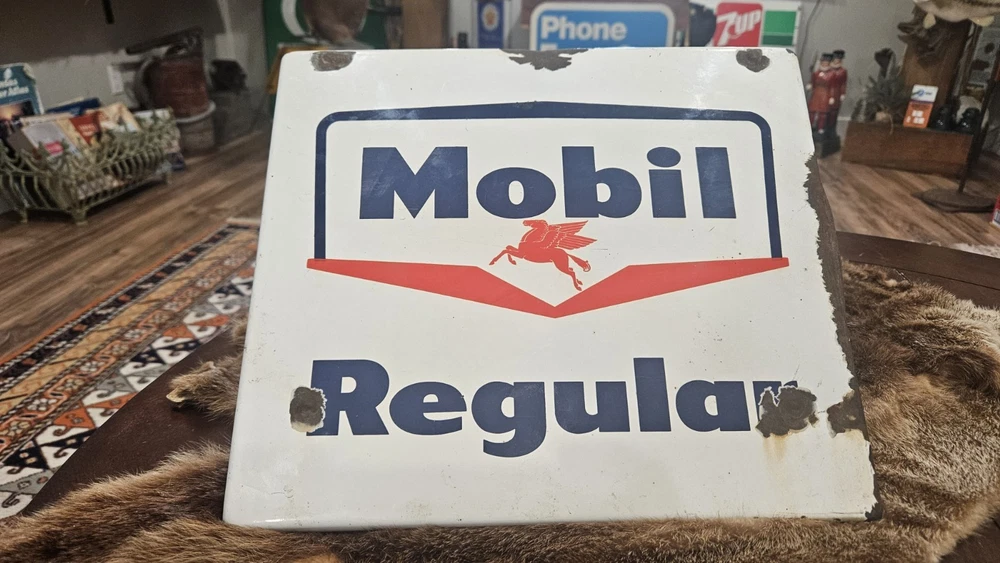 The product is an original vintage Mobil Pegasus gas pump plate, featuring a porcelain design in multi-color. This collectible advertising sign reflects the theme of gas and oil, making it a unique and nostalgic piece of merchandise and memorabilia for enthusiasts of vintage gas station memorabilia.