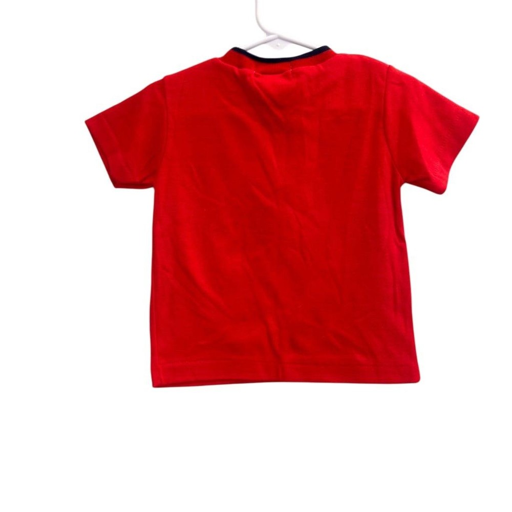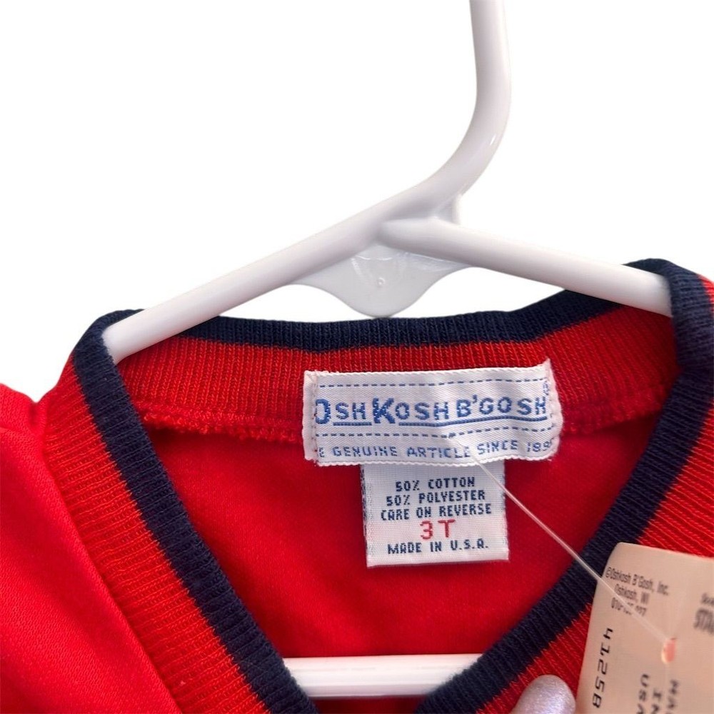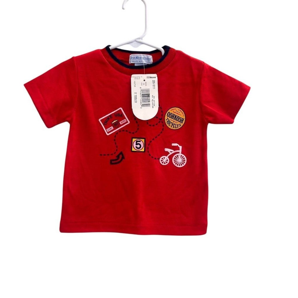 Toddler boys red OshKosh B'gosh graphic t shirt. Features a playful front design with "Trike USA" and "OshKosh Tricycles" emblems, along with dashed lines and numbering suggesting a fun route. Contrasting navy blue trim around the neckline adds a classic touch. Perfect for casual outings, playdates, or outdoor adventures. Department: Boys Type: T-Shirt Sleeve Length: Short Sleeve Theme: Fun Closure: Pullover Performance/Activity: School Pattern: Graphic Print Material: Polyester Blend, Cotton Blend Neckline: Crew Neck Style: Pullover Features: Easy Care Fit: Regular Accents: Logo, Embroidered Season: Spring, Summer Keywords: OshKosh, toddler, graphic tee, tricycle, playful, casual, outdoor, playdate, short sleeve, cotton blend, bright red, boy's fashion, apparel All items come from a smoke free, pet friendly home. All of items unless NWT or Dry Clean Only are washed with Tide. We try our best to disclose any flaws with items, if we miss something please reach out and let us know. We offer combined shipping on all our items. We do take measurements of our clothing listed for sale. Please compare the measurements to something you already own.