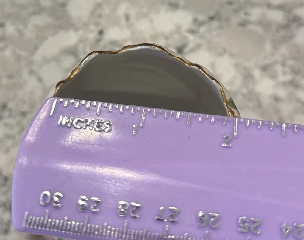 In great used condition, no major defects. One very tiny chip on rim as noted in photo. Paint is intact, gold accent paint intact.