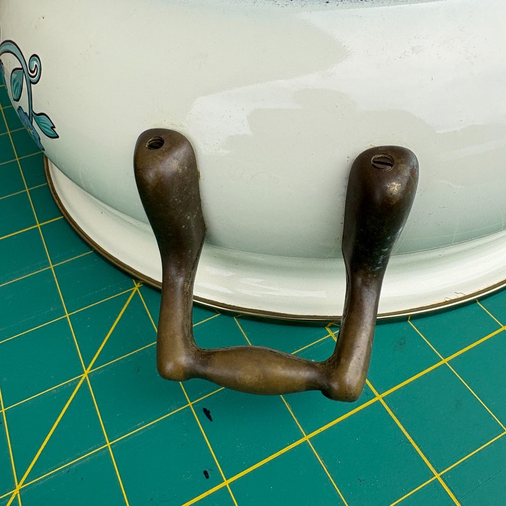 Vintage Normandy Dutch Oven Enamel Serving Pot with Lid Floral Design Brass Handles 10.5"w x 4"h 13.5w (with handles) For inventory = Alaska Shelf #2