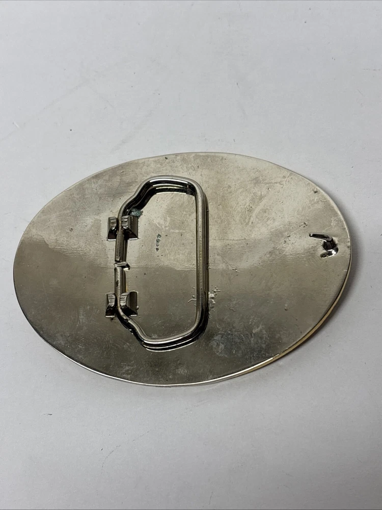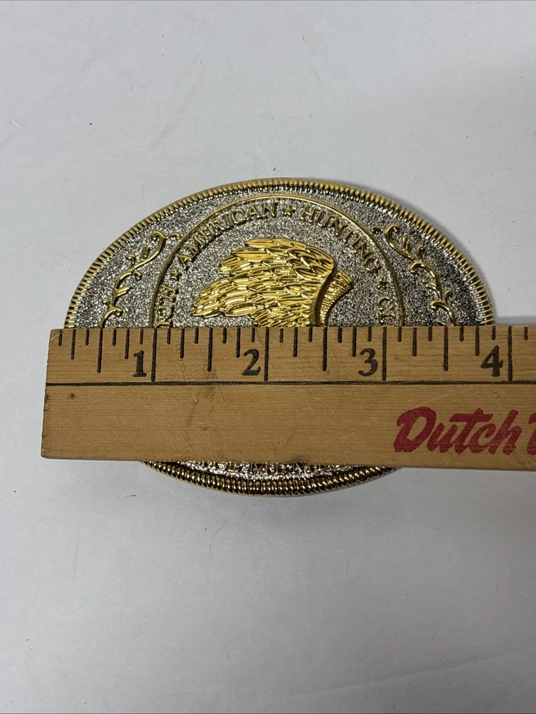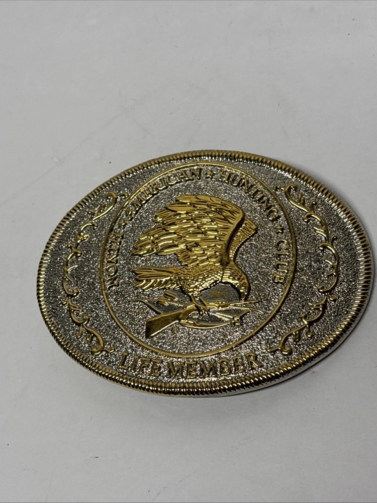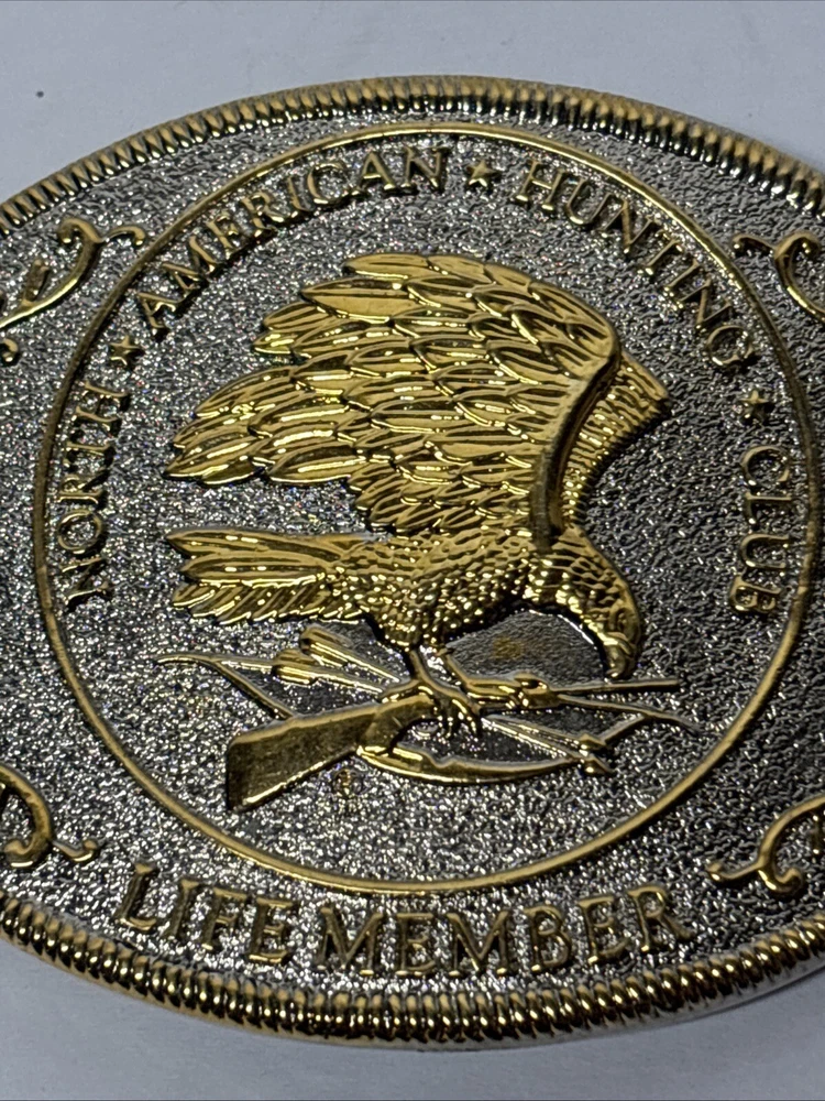 This is a vintage North American Hunting Club "Wings of Gold" belt buckle designed for men. The buckle features an eagle pattern in silver and gold metal with brass hardware. It is an oval-shaped interchangeable buckle that fits a 2-inch belt. The design is themed around hunting, and it is specifically made for life members of the club.