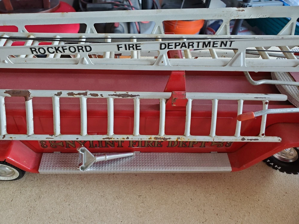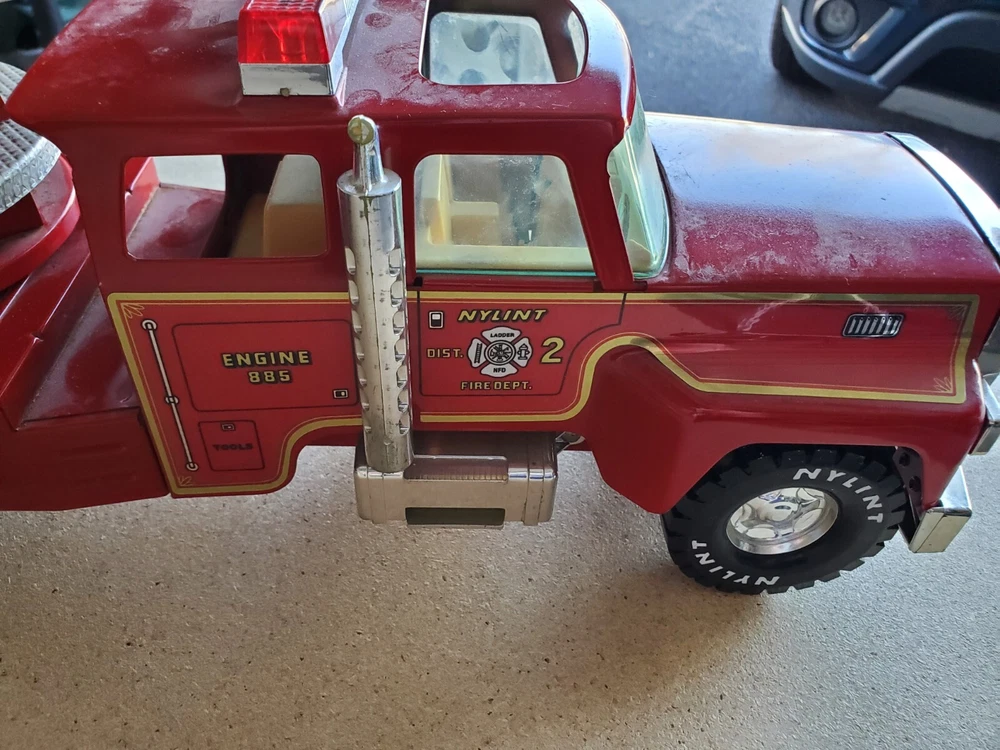 This vintage Nylint steel pressed toy metal hook and ladder fire truck engine is a rare find for collectors and fire enthusiasts alike. Made in the USA in the 1980s, this 1:8 scale model of an International truck features a bright red color and intricate details such as a ladder and hook. This toy is perfect for those who appreciate vintage manufacture and is a must-have for any collector.